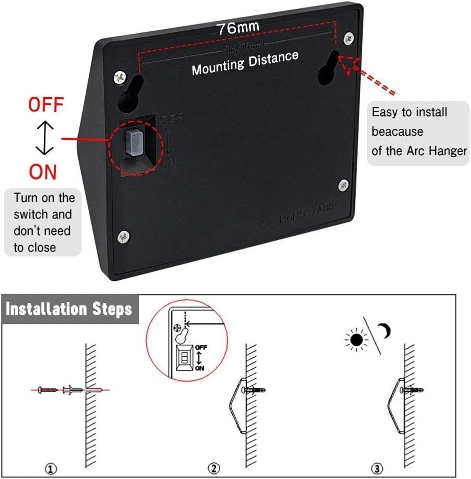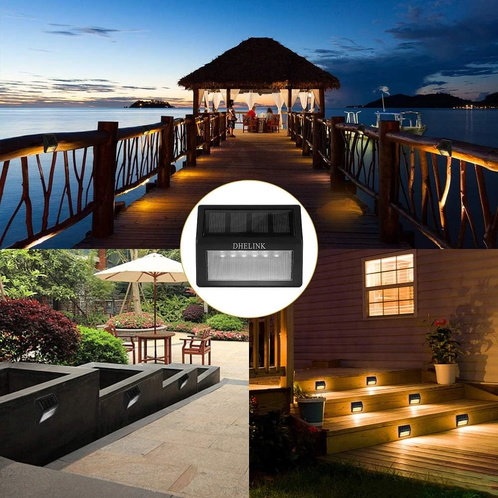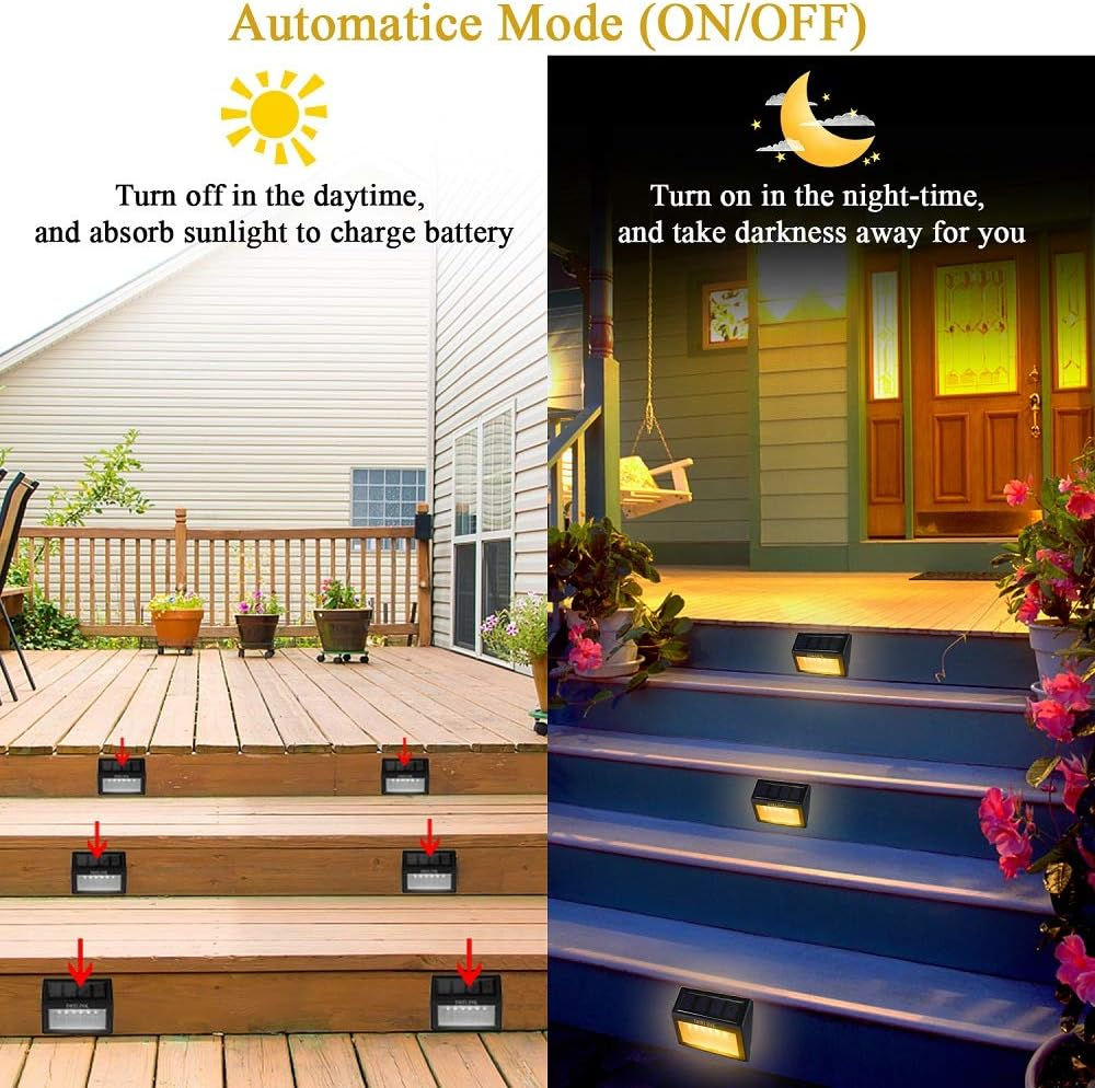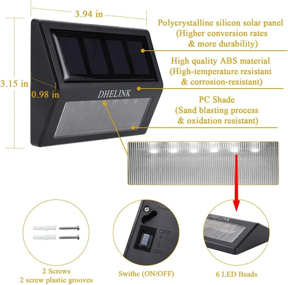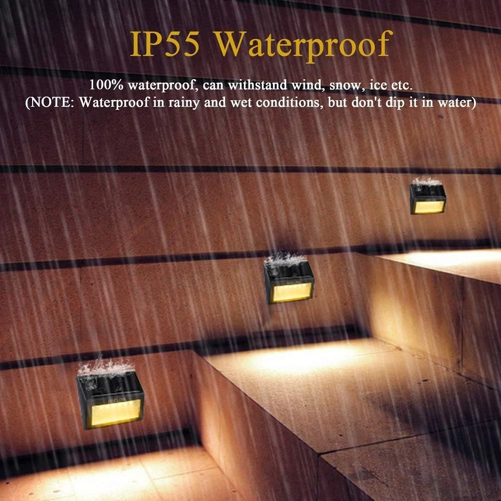 UPGRADE: Unlike other's 3 LED, our solar deck step lights consist of 6 LED, perfect lighting for stairway outside. With 2V 130MA poly-silicon solar plate, make sure deck lights solar powered can fast absorb more solar power from the sun. Build-in NI-MH/AA/1000mAh replaceable battery work much longer than others 300-800mAh outdoor stair lights in the market, which can let them illuminate above 8 hours. ( NOTE: Please ensure enough sunshine and tear up the protective film from the solar panel ) EASY TO INSTALL: These outdoor step lights can be quickly installed in any ground where it can absorb the sun light directly. Fast and easy installation, no wiring required, simply screw it onto the surface. So these solar powered step lights widely uesed for stairway, deck, step, dock, fence, wall, garden, pathway, walkway, backyard lighting. AUTO CHARGING & LIGHTING: Outdoor solar fence lights with automatic light sensor function, press the ON/OFF button, let it charged under the sunlight. Then solar deck stair lights will auto ON at night time and OFF during daytime. Each outdoor stair led lights have 6 premium quality LEDS, which can give out a visible bright light on your way home. IP55 WATERPROOF: Solar deck post lights made of high quality ABS material - IP55 waterproof and durable make outdoor solar step lights work well and safe in different kinds of weathers. Specially designed for outside weather conditions, perfect for illuminating stairs, steps, decks, fence, or decorate your balcony, patio, yard and garden. SAVE MONEY & ECO-FRIENDLY: High electricity bill? No!!! Save hundreds of dollars if you use DHELINK deck lights, not only environmental protection but also saving money, continuous solar energy does it for you. Thank you for your help for earth! If you are not satisfied with the purchased outdoor deck lights, please feel free to contact us directly, and we will solve them in 24 hours. Are you worried about falling in the dark? Are you willing to create a warm atmosphere for your yard/patio at night? DHELINK outdoor solar deck light for stairway is your best choice! - Upgraded 6 LEDs make this lights more brighter than others. - Upgraded 2V/130mA Monocrystalline Silicon Solar Panel, thay can absorb more power from sunlight, make sure it can keep lighting normal when can't get enough sunlight some days. - No wirring and no external electricity source required, just install them in an area where they can absorb sunlight directly. They will provide a visible bright light in evening not only add more safety in your way home, but also perfect create a warm atmosphere for your yard at night. Specification: 1. Light Source: 6LED*2LM 2. Light Color: Warm White 3. Solar Plate: poly-silicon 2V/130mA 4. Waterproof: IP55 5. Material: high quality ABS, PC 6. Charge Time: >8H 7. Using Time: >8H 8. Accumulator: Ni-MH/AA/1.2V*1000mA 9. Dimension: 3.94 * 3.15 * 0.98 in Package Included: 8 * Solar Lights 16 * Screws + 16 * Expansion pillar-hinge 1 * Manual Installation: 1.Press the ON/OFF button, keep the light "ON" model. 2.Drill two holes of 7mm diameter into the stair. The horizontal distance of these two holes is 76mm; Then plug the provided plastic stopple into the holes and screw in the bolts into the wall so far as that the bolt head sticks out about 5~8mm. 3.Hang-up the solar stair lights onto the screws and make sure it is stable. Tips: 1.Working power of the solar panel will be influenced by weather, location etc. 2.Get charged only when switched to "ON". 3.Waterproof in rainy and wet conditions, but don't dip it in water. 4.Please put the light under the standard sunlight 6 to 8 hours before using it. 5.Please read the manual carefully or contact us for the installation.