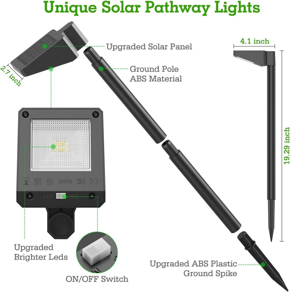 You may also like 2PK Flickering Flame Solar Floating Ball Lights 3 Lighting Modes Waterproof New 30.58 USD 33.59 USD Free shipping 9% off Solar Pathway Lights Outdoor, 8Pack 3500K Warm White Solar Powered Outdoor Landscape Path Lights, Upgraded Brighter Outdoor Solar Garden Lights for Outside Yard Lawn Driveway Walkway Decorative Color Black Material Acrylonitrile Butadiene Styrene Style Modern Light fixture form Path 【Unique Modern Solar Lights Outdoor】Unique solar lights for outside use upgraded brighter LEDs that produce up to 20lm 3500K warm yellow high brightness output, but are not harsh, making your garden warm and cozy. Outdoor solar lights combine a solid matte appearance with a modern & elegant square head design, make solar yard lights look more advanced and textured. Solar pathway lights will make your outdoor space to be an enticing, relaxing and soothing retreat 【Solar Powered & High Efficient】 The solar pathway lights outdoor rely 100% on solar power. Light up your garden by channeling the power of the sun without incurring a huge electricity bill. Solar path lights are equipped with a upgraded bigger monocrystalline silicon solar panels, which conversion rate is up to 25%, charging faster than other solar landscape lights. Perfect for use in lawns, sidewalks, gardens, driveways, walkways, and landscape lighting 【Auto ON/OFF & Longer Lighting Time】Solar powered outdoor lights automatically turn on at night and turn off at dawn which enables solar garden lights outdoor conserves battery life for when it’s needed most. Solar walkway lights has a built-in larger capacity battery, which will keep this solar driveway lights illuminated for 8-12 hours with full charge from 4-6 hours of direct sunlight. Pathway lights solar powered will enhance the beauty of your outdoor space 【All-Weather Resistance & Tough】Our solar yard lights with a high waterproof level of IP65, ensuring the solar lights outdoor pathway can withstand all bad weather, no need to worry about rain, snow, or sleet. Compared with other outdoor solar lights for yard, our walkway lights solar powered are made of high-strength ABS and tough construction, which can ensure long-lasting performance the durability of these solar walkway lights outdoor 【Easy to Install & Perfect Outdoor Garden Decor】Our solar lawn lights are designed wireless, with no additional electricity required, which can be installed outdoors anywhere, creating a romantic atmosphere for your driveway, pathway, sidewalk, walkway, lawn, yard, garden, etc. The solar path lights outdoor waterproof are a best choice to decorative your house, which adding a perfect touch of modern style and charm to any pathway You may also like 14'' Pressure Washer Surface Cleaner Attachment with 2 Extension Wand 4000 PSI 48.81 USD 65.88 USD Free shipping 26% off Highboy Waste Container with Swing Lid 23 Gallon Slim Profile Easy Bag Removal 45.21 USD Free shipping Emergency Survival Food Supply 16 Servings Creamy Pasta Vegetable Cheesy Lasagna 29.42 USD 30.97 USD Free shipping 5% off 22" Replacement Blade for Black Max Model MNA153016 and Snapper Model MNA153002 26.13 USD 27.51 USD Free shipping 5% off Hollow Curl Bar and Dumbbell Handle Set W/Spring Collars Heavy-Duty Chrome Steel 40.94 USD 43.09 USD Free shipping 5% off Torin Hydraulic Long Ram Jack W/ Single Piston Pump Clevis Base for Shop Cranes 43.75 USD Free shipping 23-Gallon Square Trash/Garbage Container with Untouchable Swing Top Lid Kitchen 74.0658 USD Free shipping Turtle Aquarium Kit Aquatic Turtle Tank W/ Filter Light Turtle Basking Platform 96.72 USD Free shipping Armless Home Office Chair Ergonomic Desk with Comfy Low Back Lumbar Support Home 52.77 USD Free shipping Slow Cooker Extra Large 10 Quart Stay or Go Portable W/ Lid Lock Dishwasher Safe 79.64 USD Free shipping Oversized 1-Person Hiker Tent with Large Door for Easy Entry 7' X 5' Outdoor New 30.61 USD 45.33 USD Free shipping 32% off Small Custom Grind Coffee Grinder 14 Cups Adjustable Knob 5 Settings Home Office 36.75 USD 40.34 USD Free shipping 9% off