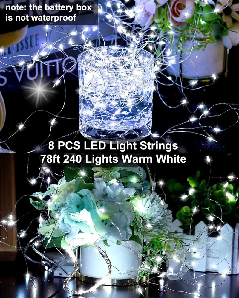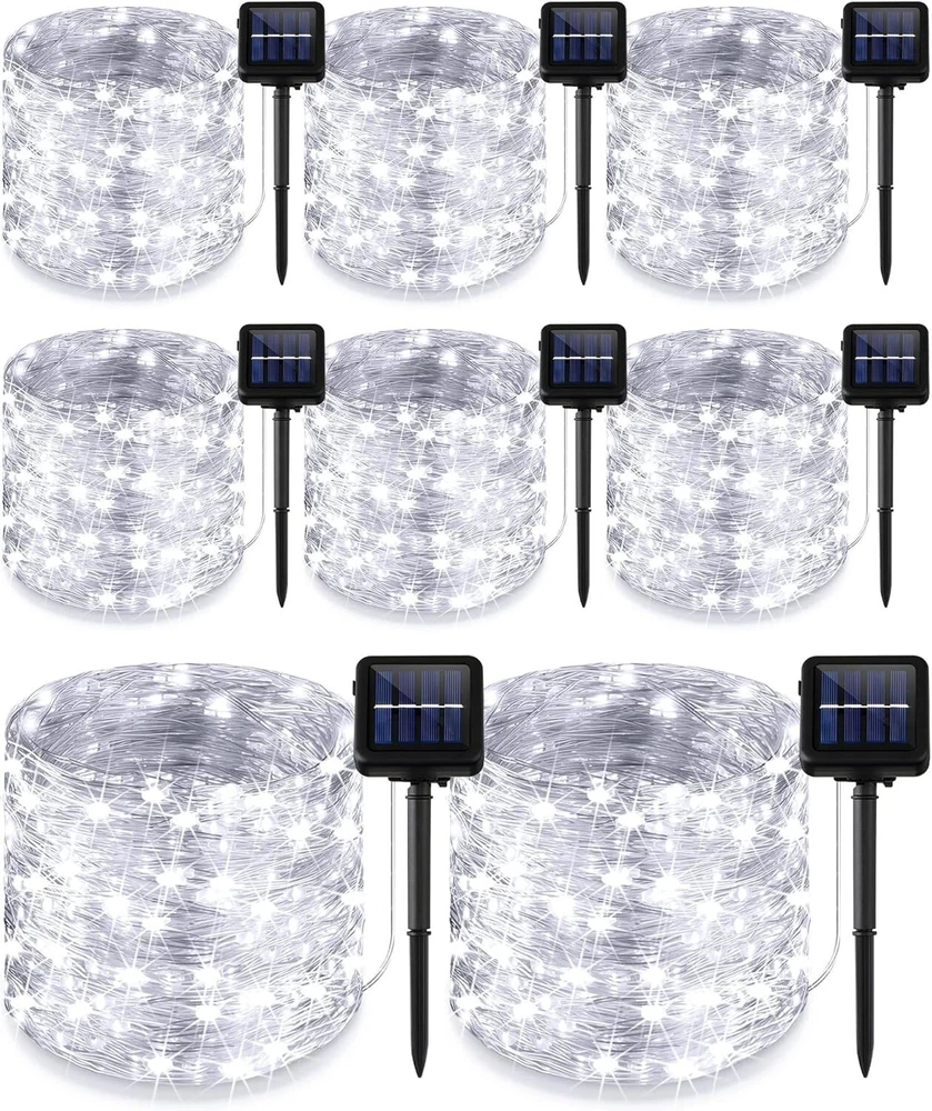 8 Pack Solar String Lights Outdoor Waterproof Each 240 Led 78ft Solar Fairy Lights Outdoor 8 Mode Led Solar Outdoor Lights Tree Lights Waterproof Copper Wire Lights for Tree Garden YardCool White Long Solar String Lights: you will receive 8 pack of LED solar string lights set, 624 ft in total, each string is 78 ft with 240 bright LED bulbs; There are 8 different lighting modes; The solar lights for trees is x 2 65 inches larger panel with 800mAh built-in battery, solar lights outdoor is more energy saving, convenient and practical 8 Lighting Modes: the solar fairy string lights have on/ off buttons and 8 different lighting modes; The on/ off button is easy to find and use; You can set the b mode at different times to meet your diverse decorative needs; You can also save your satisfactory mode settings by pressing the mode button; The built-in memory storage chip will keep your last setting mode for you to use directly next time Energy Saving and Efficient Solar Decoration: the outdoor tree lights adopt solar energy without additional charging operation; Solar string lights with 180 degree, adjustable solar panels, which can better absorb sunlight and turn into brighter lights to illuminate your yard; Charging is completed within 3 hours and can work up to 10 hours to make your night more beautiful and romantic IP44 Waterproof Function: the solar lights and panels have IP44 waterproof rank, which can resist rain and snow weather; Please do not immerse the panels in water; Waterproof copper wire lights are suitable for indoor and outdoor; You can DIY any shape you like to add atmosphere to your holiday life Wide Application: solar garden twinkle lights are a nice outdoor decoration; It can make you supplement external lights at night, let you see the beauty of flowers and the world, add atmosphere to your patio party; It is widely applied in hotels, gardens, balconies, holiday dinners, birthdays, Christmas and various parties