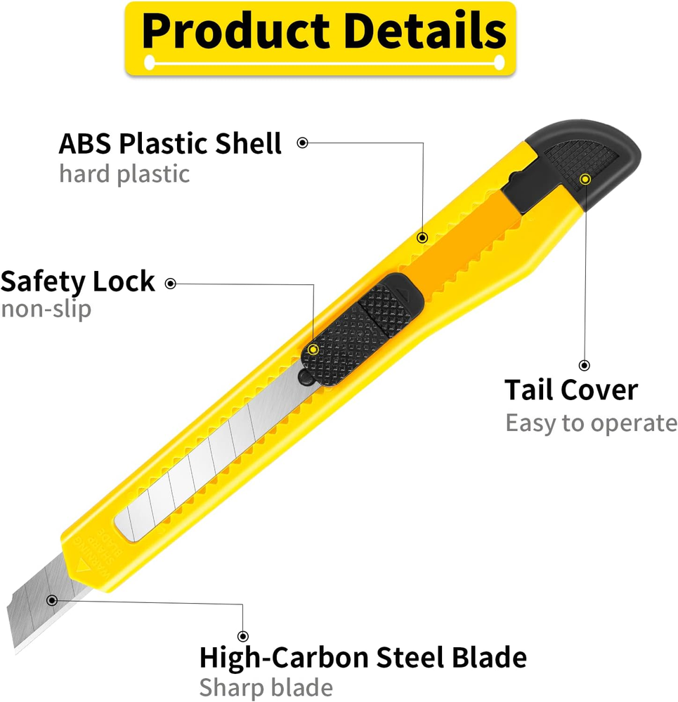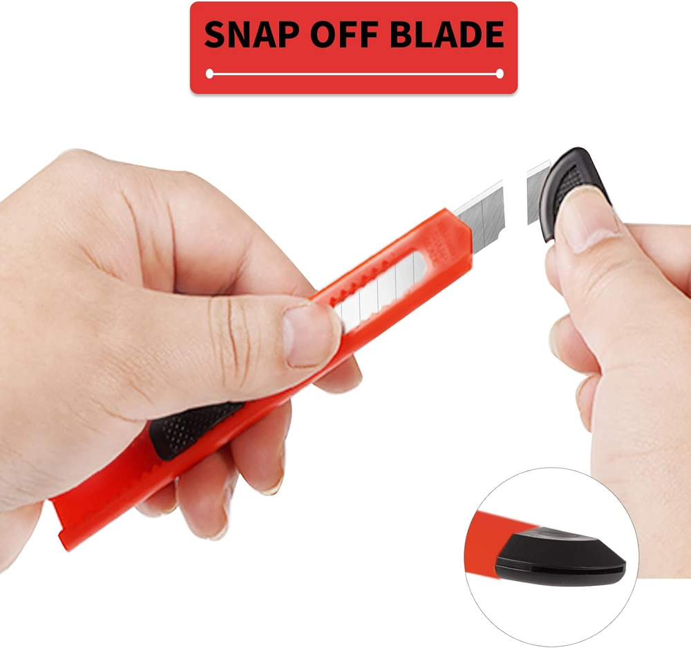 Exactly what You Need: Economical and disposable box cutting blades.Comfortable grip and wider retractable blade. Cutting with easy:Ready to use, cut and toss or keep some around as a spare utility knife in your garage, tool kit, home and office. 9MM WIDER BLADE - Heavy Duty Ideal for Thicker Cuts. Use for commercial or industrial applications like thicker paper, tape, plastic, cardboard, balsa, bass wood, photos, coupons, cardstock, mat board, foam board, delicate fabrics, crafts, amazon, ups or post office packages. Easy To Use :9mm wider blade for deep and easy cutting. Prevent blade slipping with the lock tab. Always keep your blade fresh and sharp by snapping off the blade for a new sharp cutting tip Customer Service :100% brand new and high quality,you will get friendly customer service. Product Description 12 SECTIONS SNAP OFF BLADES Each utility knife blade can be broken 12 times. When the tip of the blade wears out, you can break 1section, giving you a sharper cutting experience. Safety tips: Be careful when snap off the blade! SAFETY LOCK DESIGN The slider of the utility knife can control the blade to extend or retract. Pull out the back of the slider to lock the blade from sliding, helping you to make more precise cutting. EASILY BREAK THE BLADE Pull out the blade breaker at the tail of the razor knife, and snap 1 section blade into the blade breaker to break it.