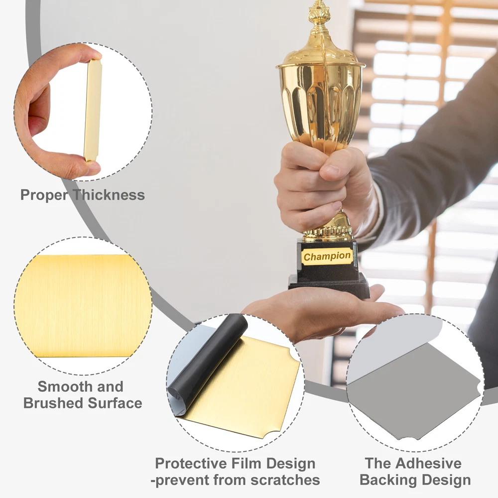 Document Our engraved nameplates are perfect for mounting on plaques, picture frames, sweaters, trophies, bags, display boxes, flag cases, and anything else.SpecificationMaterial: Stainless SteelColor: Silver/Gold/BlackSize: 10.2 x 5.1 cm/4 x 2 Inch(L*W)Thickness: 0.4 mm/0.02 InchPacking List: 8 Pcs x Engraved NameplateAdvantageOur engraved nameplates are made of brushed stainless steel which is durable, stable, not easy to fade, rust, or break, and can be used for a long time. With a smooth surface, it will not scratch your skin.The right thickness makes the plate stronger and allows for deeper engraving. These elegant nameplates have a beautiful luster and a simple design. Suitable for various crafts to add brilliance.The protective film design can effectively prevent scratches. The adhesive backing design allows you to stick this nameplate anywhere without any tools and it can be firmly on the objects.InstructionPlace a metal workbench block underneath the blank stamping tags for better stamping.NOTE:1. There may be light scratches and blemishes due to shipping, but they can be polished.2. Only for laser engraving, not suitable for mechanical engraving.3. Please remove the protective film before use. 8 Pcs 4" x 2" Engraved Name Plate Picture Frame Label Art Tag, Silver/Gold/Black Our engraved nameplates are perfect for mounting on plaques, picture frames, sweaters, trophies, bags, display boxes, flag cases, and anything else. Specification Material: Stainless Steel Color: Silver/Gold/Black Size: 10.2 x 5.1 cm/4 x 2 Inch(L*W) Thickness: 0.4 mm/0.02 Inch Packing List: 8 Pcs x Engraved Nameplate Advantage Our engraved nameplates are made of brushed stainless steel which is durable, stable, not easy to fade, rust, or break, and can be used for a long time. With a smooth surface, it will not scratch your skin. The right thickness makes the plate stronger and allows for deeper engraving. These elegant nameplates have a beautiful luster and a simple design. Suitable for various crafts to add brilliance. The protective film design can effectively prevent scratches. The adhesive backing design allows you to stick this nameplate anywhere without any tools and it can be firmly on the objects. Instruction Place a metal workbench block underneath the blank stamping tags for better stamping. NOTE: 1. There may be light scratches and blemishes due to shipping, but they can be polished. 2. Only for laser engraving, not suitable for mechanical engraving. 3. Please remove the protective film before use. Hot Item Payment 1.We accept eBay payment . 2.Payment must be received within 7 business days of auction closing. Shipping 1.We ship to your eBay or Paypal address. Please make sure your eBay and Paypal address is correct before you pay. 2.Items will be shipped within 1-3 business day when we received payment. 3.Delivery time depends on destination and other factors. Description Policy 8 Pcs 4" x 2" Engraved Name Plate Picture Frame Label Art Tag, Silver/Gold/Black Our engraved nameplates are perfect for mounting on plaques, picture frames, sweaters, trophies, bags, display boxes, flag cases, and anything else. Specification Material: Stainless Steel Color: Silver/Gold/Black Size: 10.2 x 5.1 cm/4 x 2 Inch(L*W) Thickness: 0.4 mm/0.02 Inch Packing List: 8 Pcs x Engraved Nameplate Advantage Our engraved nameplates are made of brushed stainless steel which is durable, stable, not easy to fade, rust, or break, and can be used for a long time. With a smooth surface, it will not scratch your skin. The right thickness makes the plate stronger and allows for deeper engraving. These elegant nameplates have a beautiful luster and a simple design. Suitable for various crafts to add brilliance. The protective film design can effectively prevent scratches. The adhesive backing design allows you to stick this nameplate anywhere without any tools and it can be firmly on the objects. Instruction Place a metal workbench block underneath the blank stamping tags for better stamping. NOTE: 1. There may be light scratches and blemishes due to shipping, but they can be polished. 2. Only for laser engraving, not suitable for mechanical engraving. 3. Please remove the protective film before use. Hot Item Payment 1.We accept eBay payment . 2.Payment must be received within 7 business days of auction closing. Shipping 1.We ship to your eBay or Paypal address. Please make sure your eBay and Paypal address is correct before you pay. 2.Items will be shipped within 1-3 business day when we received payment. 3.Delivery time depends on destination and other factors.