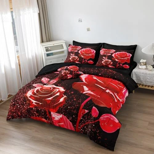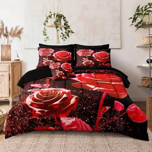 8 Pcs Bed in a Bag Red Rose Comforter Set Queen Size Rose Flower Bedding Set