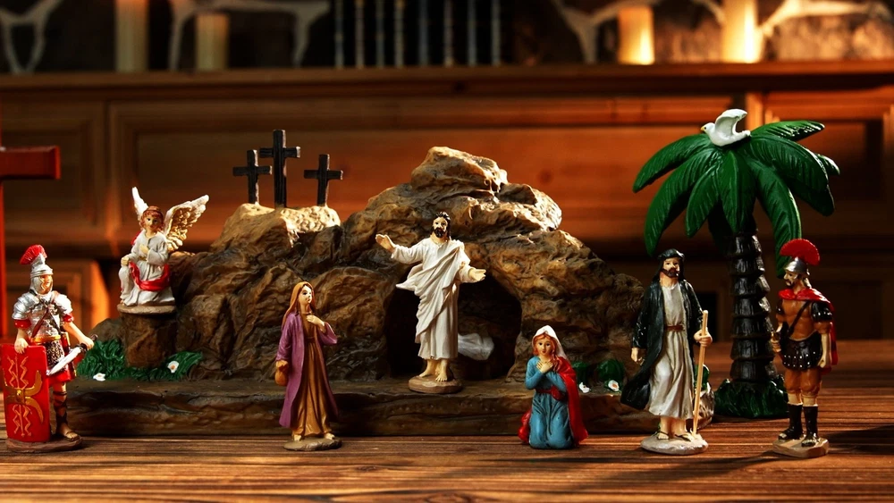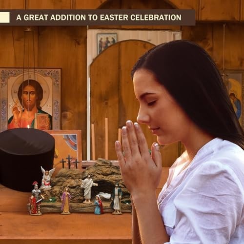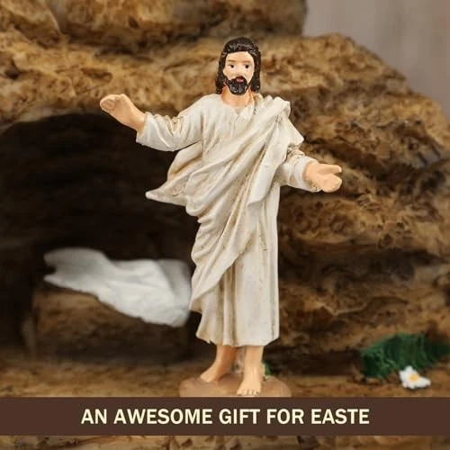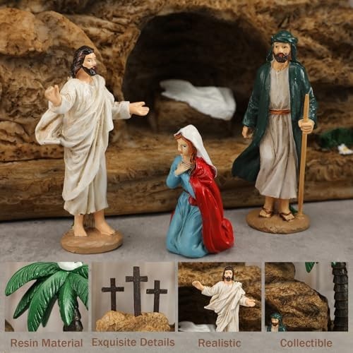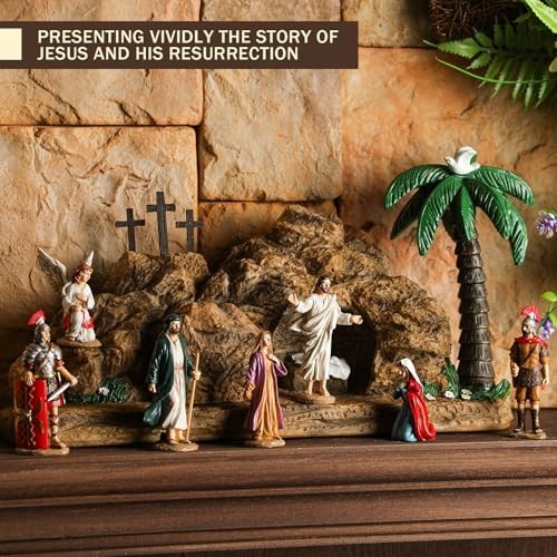 Easter Resurrection Scene Set Transform your Easter celebrations with this beautifully crafted Resurrection Scene Set. This inspiring hand-painted ornament set includes: 1 Easter Empty Tomb 7 Resurrection Witnesses This captivating scene captures the miracle of the resurrection, making it a perfect centerpiece for your holiday festivities. Key Features: Safe Material: Made from high-quality resin, this nativity scene decoration is both safe and durable. Each piece is carefully hand-painted, ensuring a lightweight yet sturdy design that can be enjoyed for years to come. Ideal Size: The Easter empty tomb measures 14 x 7 x 4 inches, while each of the 7 resurrection witnesses stands at 3.15 inches high. Experience the beauty of the resurrection story through this stunning light tomb scene. Versatile Display: The 7 wooden bundles can be arranged individually on tables or shelves, allowing you to create a charming and meaningful display. Perfect for coffee tables, TV cabinets, or any space that needs a touch of Easter spirit. Perfect Gift Idea: This resurrection figurine set makes an excellent gift for family and friends, symbolizing friendship, love, and gratitude. Ideal for various occasions such as: Easter celebrations Spring parties Weddings Birthdays Create a festive atmosphere and bring good luck with this meaningful gift!