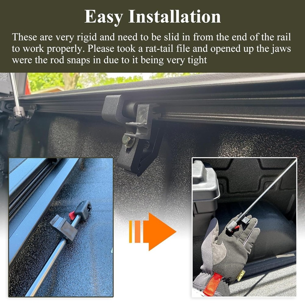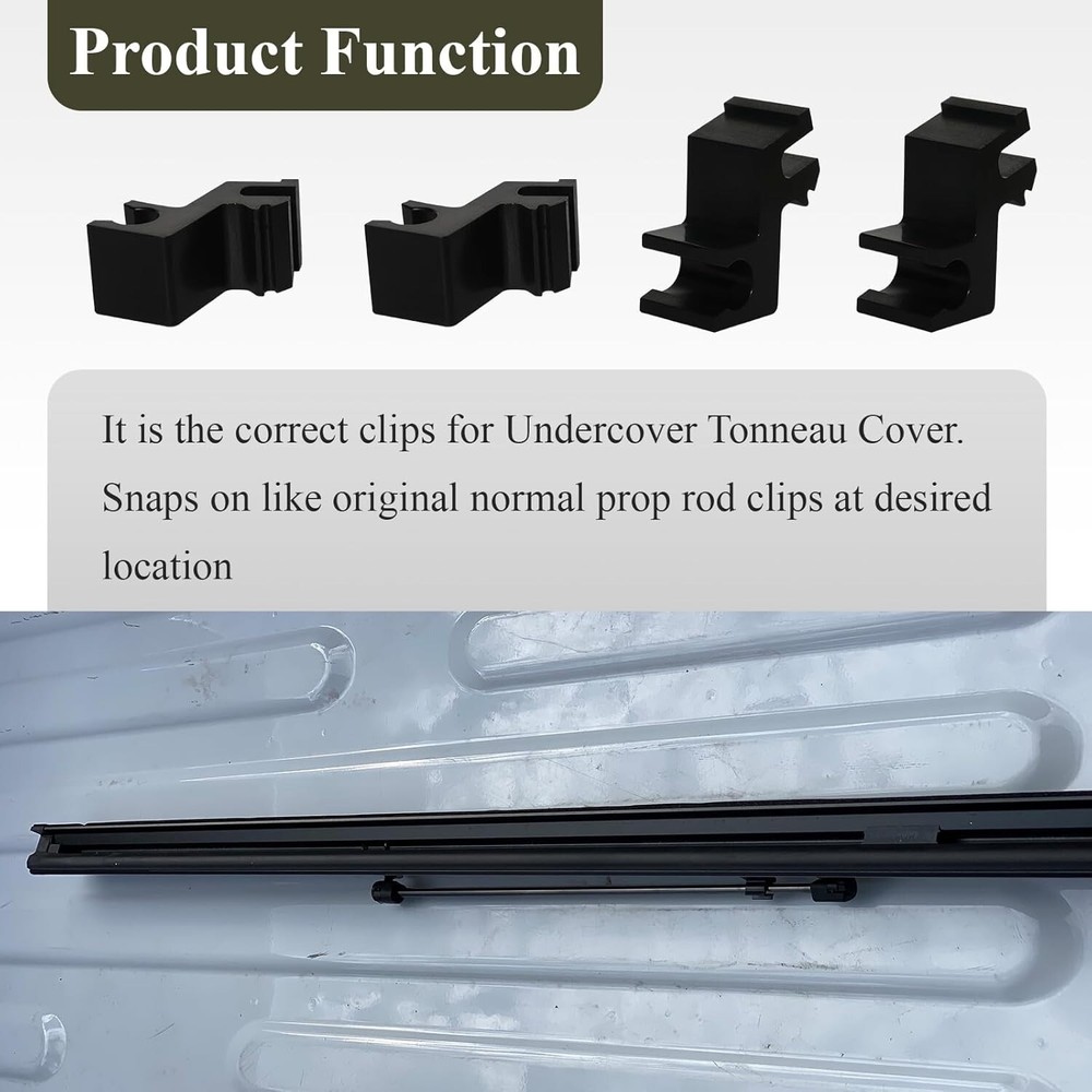 8 Pcs Prop Rod Clips Set Fit for Undercover Tonneau Prop Rod Truck Bed Cover Style:8 Pcs Color: Black Material: Plastic Fastener Type Snap In Finish Type: Plain Product Overview 8 Pcs Undercover Tonneau Prop Rod Clips Set Compatible Models Clips Fit for Undercover Ultra Flex Hard Folding Truck Bed Tonneau Cover Prop Rod It is the correct clips for Undercover Tonneau Cover. Snaps on like original normal prop rod clips at desired location These are very rigid and need to be slid in from the end of the rail to work properly. Please took a rat-tail file and opened up the jaws were the rod snaps in due to it being very tight Note Please don't try to snap them into the rail which is not the correct way to install.Remember slide them onto the rail from the back with the tailgate down Return Policy: We offer a 30 day return policy from the receiving date. Please contact us for a Free Return Label. Please use our return label so it will go back to our supplier and we can do a refund or replacement afterwards. Feedback: Your satisfaction is very important to us! If you have any problem with your order, please contact us and we will do our very best to make you satisfied. As long as you are happy with your purchase, please leave a positive feedback for us. We will always leave you a positive feedback in return. If you have any problem with your purchase, please do not leave a negative feedback. Please Contact us ... and your issue will be solved quickly and positively We are a small family-owned business trying to make a living, not a huge company that does not care ... We will ALWAYS do our best for you!