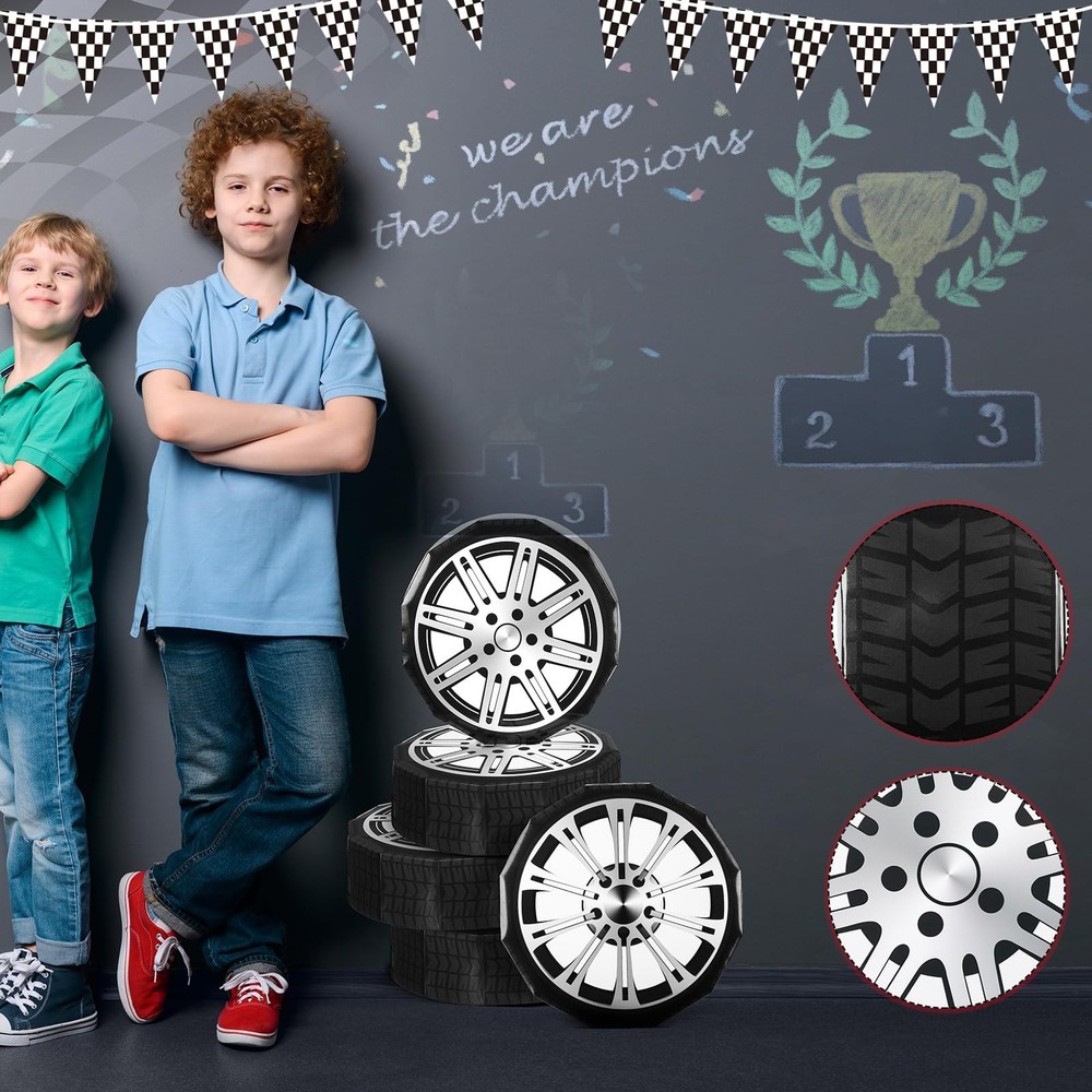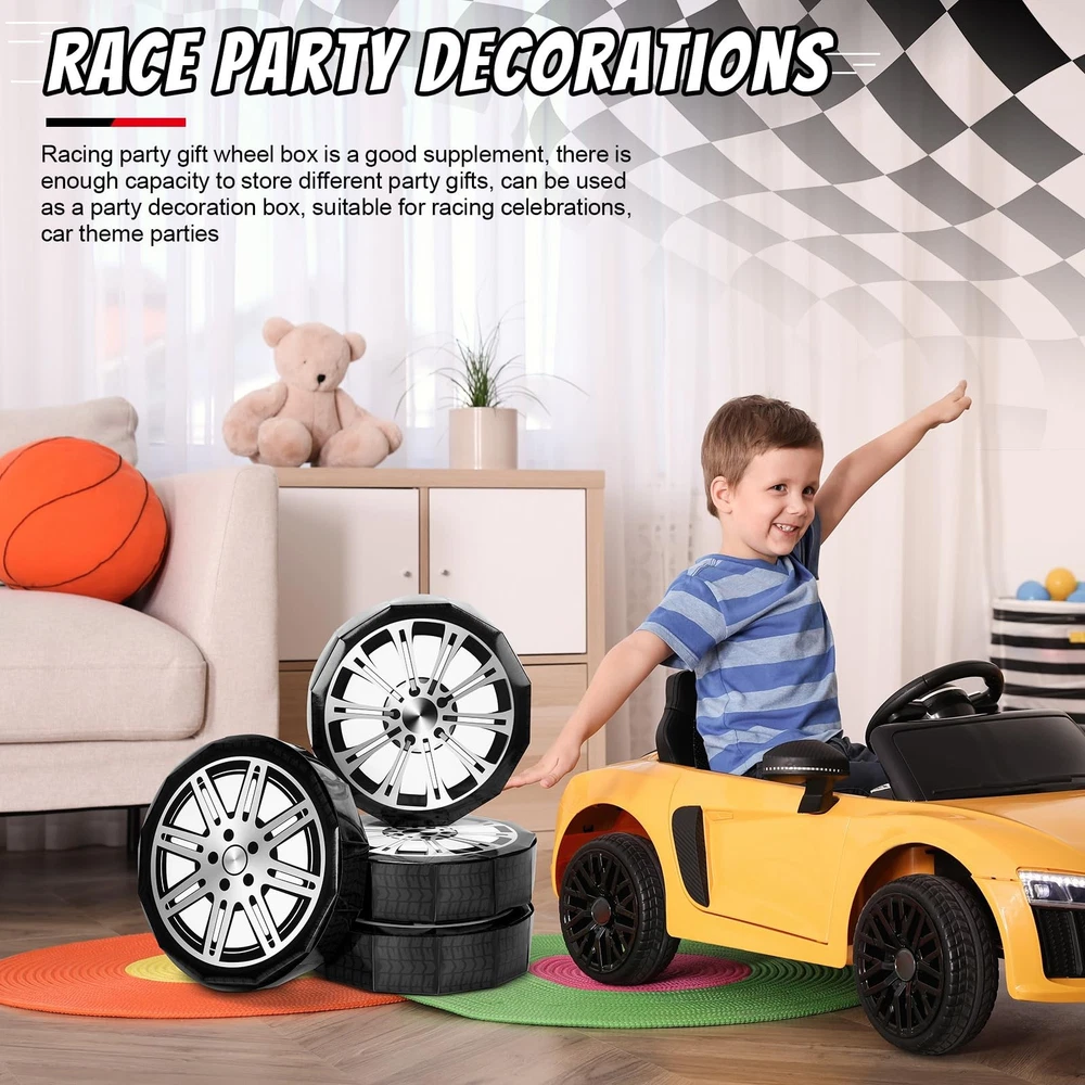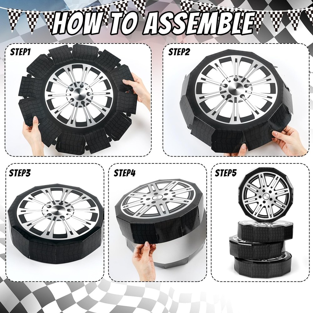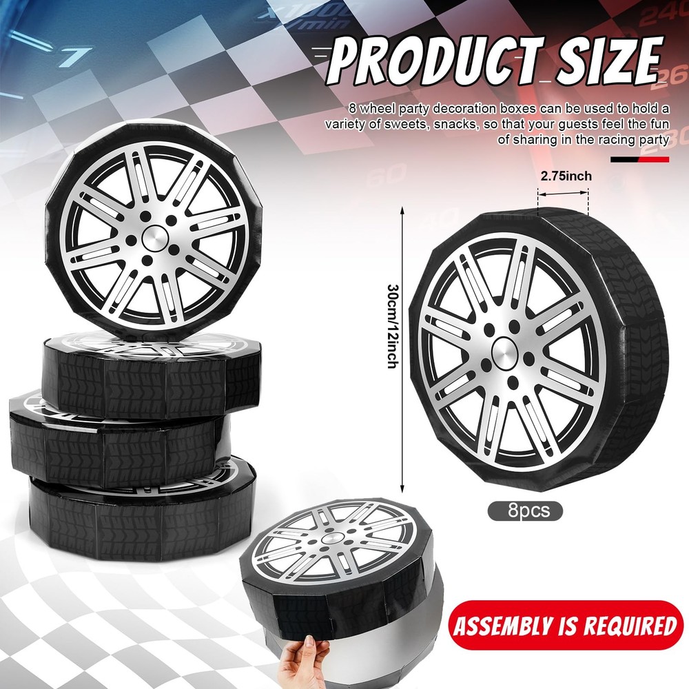 Features: Versatile decoration: These racing wheel boxes are not just storage, they also double as versatile party decorations. Depending on your preference, you can display them at different angles. Get creative in your party setting with these awesome wheel boxes! Easy to use: You don't need any special skills to assemble and use these boxes, the pre-folded seams do all the work for you. Just unpack, fold, and let these boxes add a dash of racing spark to your event. Specifications: Color: black and silver Material: paper Size: inner diameter 11.81 inches/ 30 cm Package includes: 8 x Race car party decorations boxes Notes: Manual measurement, please allow slight errors on size. The color may exist a slight difference due to different screen displays. Please note that the picture shows the assembled effect; the product needs to be assembled by yourself Racing Car Party Decoration Supplies: you will get 8 wheel party decorations boxes, this large size racing car tire box decoration can be applied to hold various candies, snacks, and let your guests feel the fun of sharing in the racing party; Please note that the picture shows the assembled effect; The product needs to be assembled by yourself Large Enough Size: these car wheels shaped large boxes have an inner diameter of 11.81 inches/ 30 cm, and use a simulated racing wheel pattern with double sided printing, black and silver color Easy to Assemble: a single box consists of 2 pieces, these racing car gift boxes are flat packed with pre folded seams, you should assemble the racing car box directly, and then you will get a simulated wheel box Durable Material: our racing car tire shaped box is made of durable 300g paper material, and the racing wheel can be displayed at different angles as a party decoration, sideways, three dimensional, flat, etc Multiple Usage: these racing car party gifts wheel shaped boxes are good additions, with enough capacity to store different party gifts, can be party decoration box, suitable for racing celebrations, car theme parties