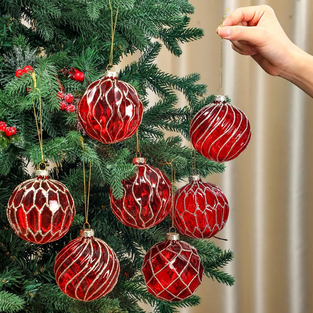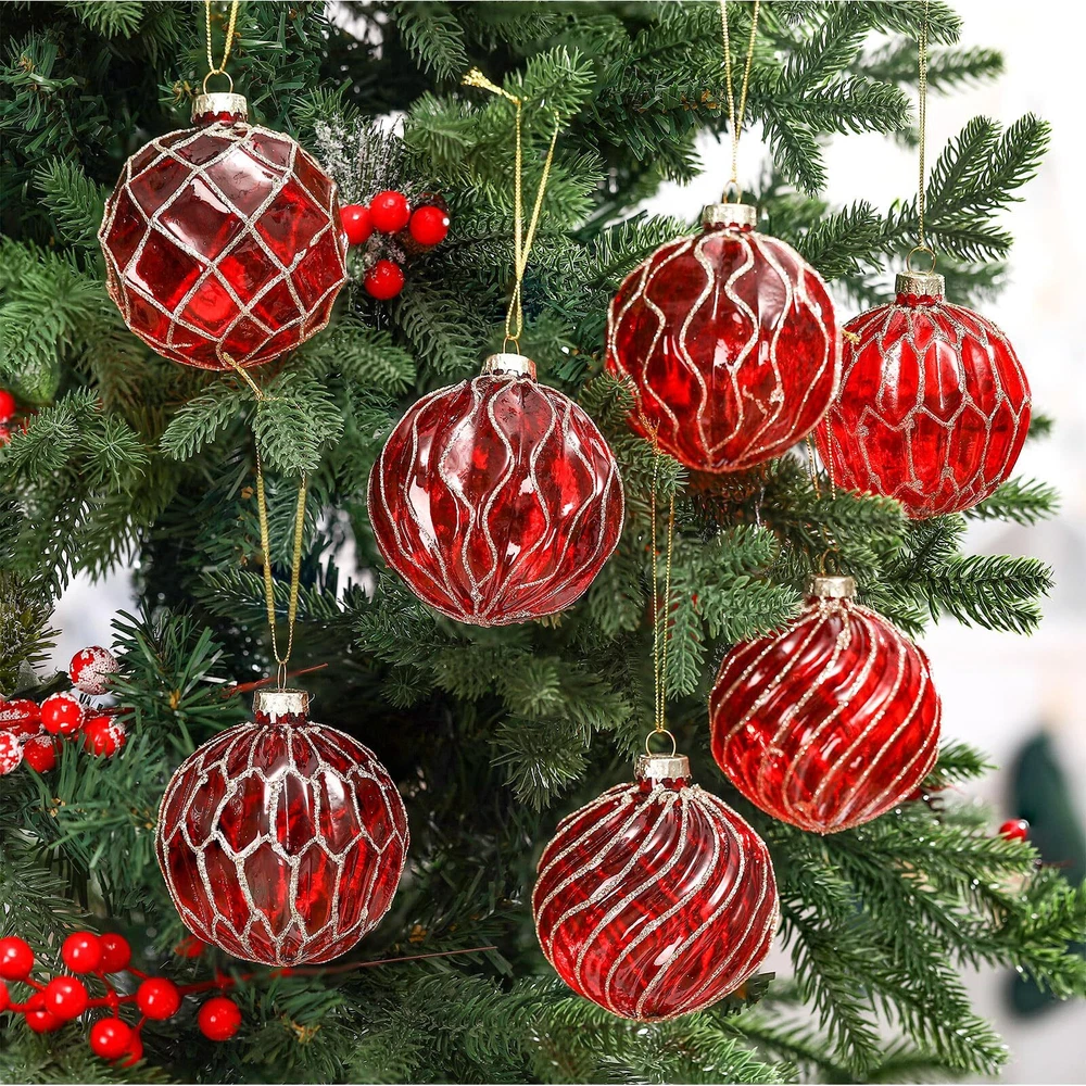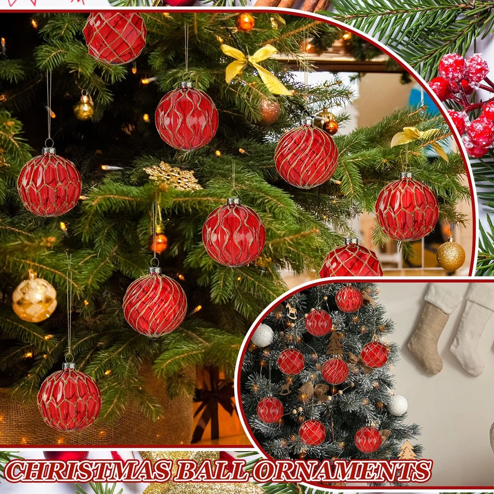 Features: Our glass Xmas ornaments can be applied in a wide range of events, you can hang them on Christmas tree, staircase, mantel, fireplace or other places, enhancing the festive ambiance in most spaces. These Christmas hanging balls can be a delicate present for your loved ones, family members and more, spreading the holiday cheer. Specifications: Material: glass Main color: red, gold Size: about 3.15 inches/ 8 cm Package includes: 8 x Glass Christmas ball ornaments Notes: Manual measurement, please allow slight errors on size. The color may exist a slight difference due to different screen displays. Package Contents: coming 8 glittery Christmas tree balls, mainly in red and gold colors, eye catching and beautiful, providing you with ample decorations to tastefully adorn your festive spaces, the bright colors and sufficient quantities to meet your Christmas tree decoration needs Glass Material: made from exquisite glass, these Christmas ball ornaments reflect light beautifully, enhancing the elegant appeal of your holiday decorations, and providing a warm and classic color palette suitable for the festive setting Vintage and Glitter Style: these glittery Xmas ornaments come in 4 distinctive styles, red transparent glass with gold trim, stylish and attractive, can help decorate your Christmas tree, adding variety and charm to your holiday decorations Ideal Size for Versatility: each Christmas tree decorations set is approximately 3.15 inches/ 8 cm, making it a suitable size to be charming, yet not overpowering; Use it to adorn trees, wreaths, garlands or other Christmas display, proper and rustic Versatile Decorations: this glittery Christmas ornament set is proper for various occasions, such as Christmas, anniversaries, weddings, parties, birthdays, housewarming, etc., can match with Christmas theme, provide attractive display and ornament