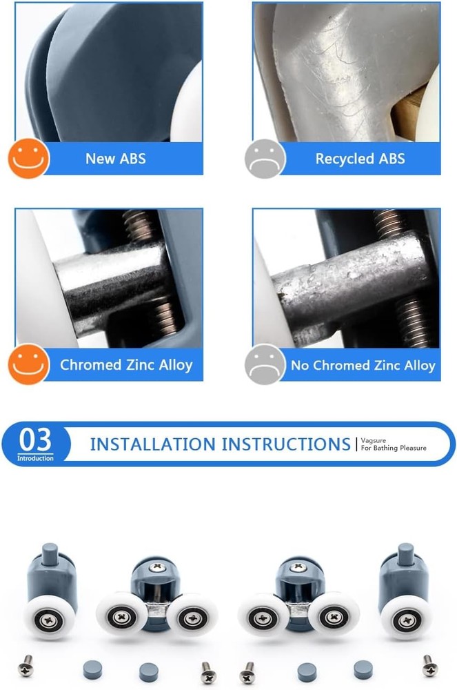 About this item Package includes: 4 double upper rollers and 4 single bottom rollers, in total 8 pcs Comes with screw cover caps. Spring loaded action can also fit curved showers. Designed with a nut and a plastic cover. Material: Plastic, Nylon, and stainless steel Diameter of the wheel: 23mm; Width of the wheel: 6mm. Minimum Hole size in the glass: 11mm. Maximum glass thickness: 6mm 8 pcs Double Shower Door Wheels Size: 2.36 x 0.79 x 0.79 inches