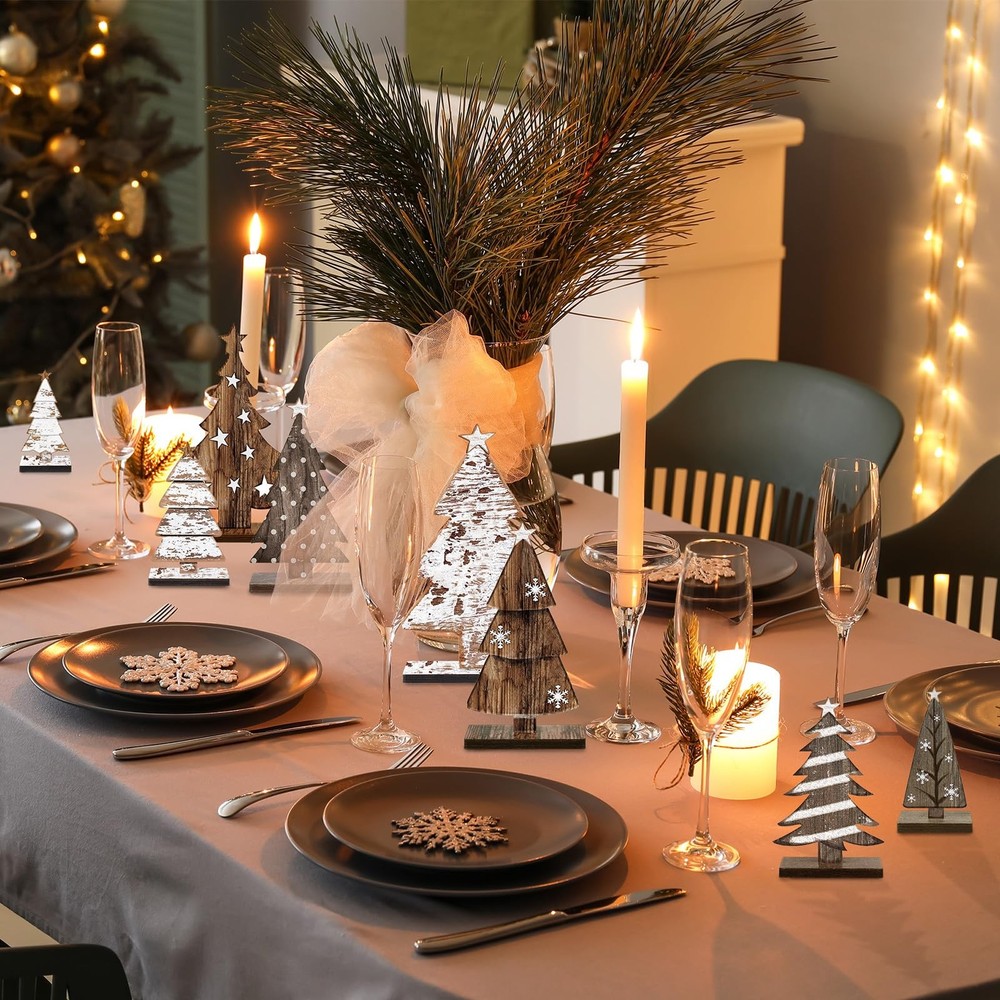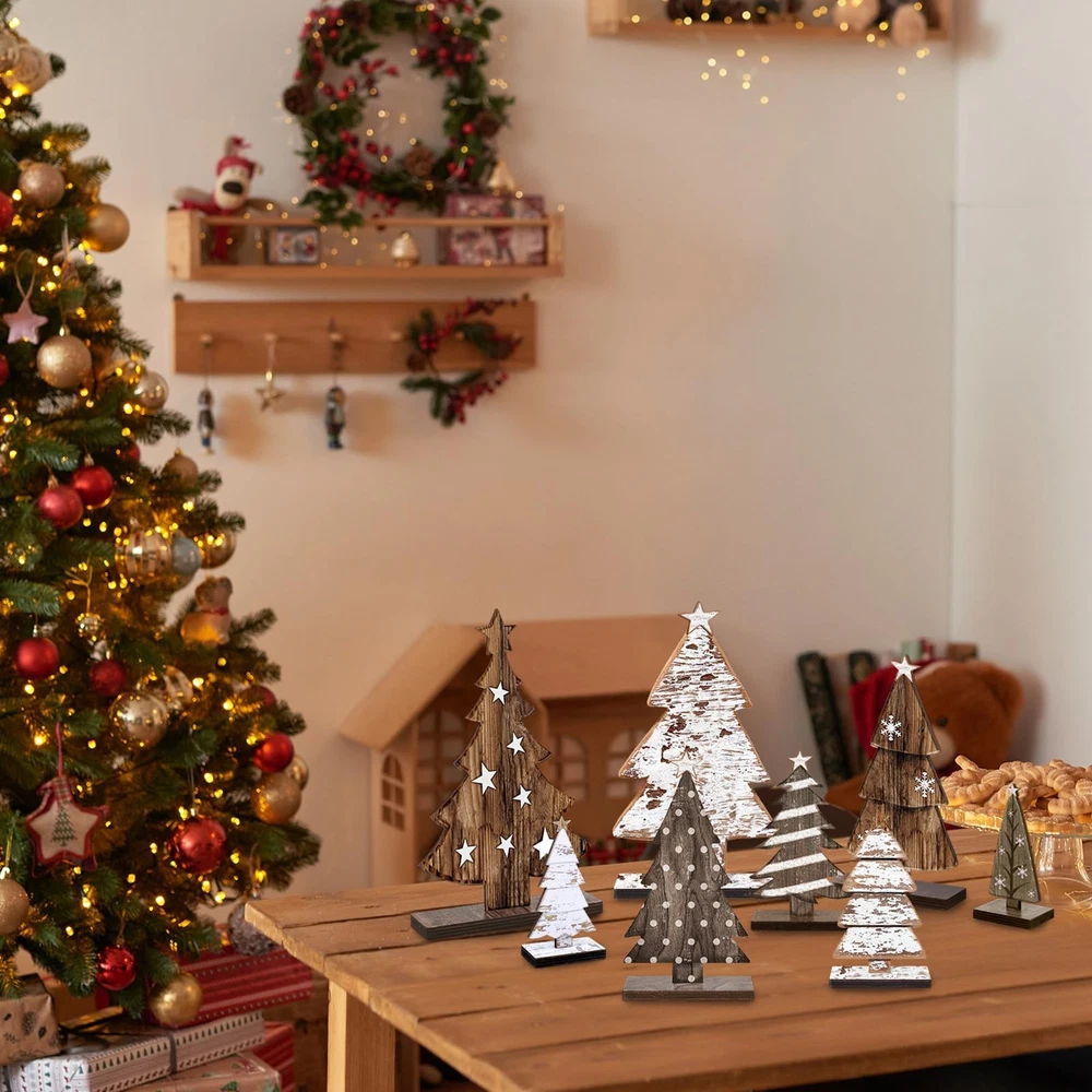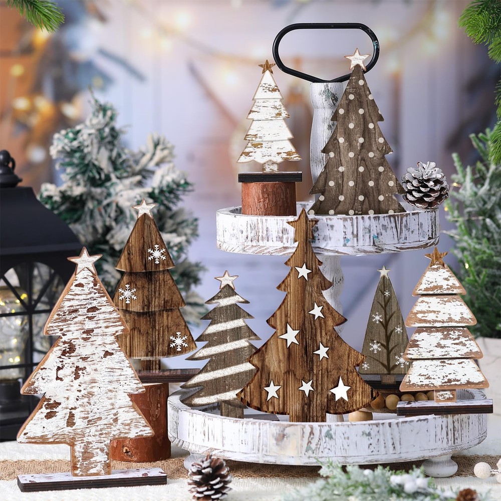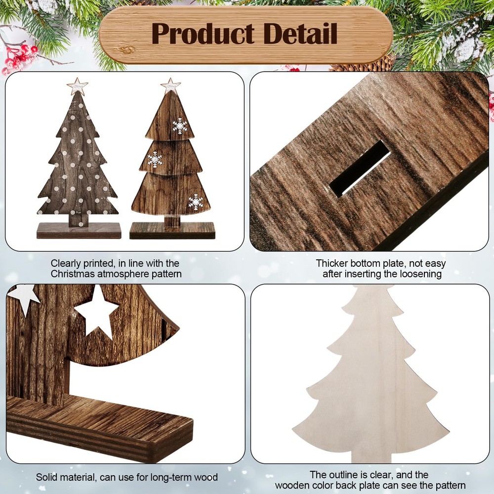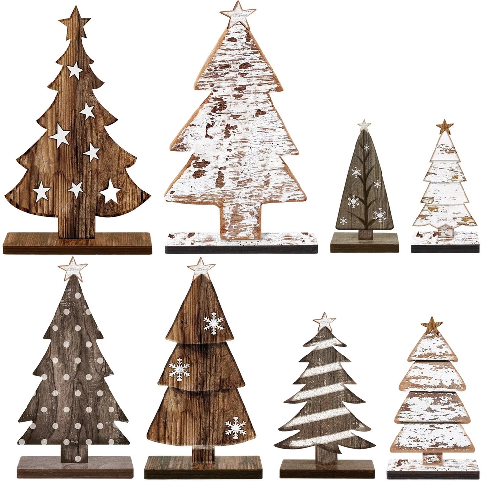 Features: Retro style: Inspired by the yesteryears, these Christmas-themed wooden decorations exude a retro charm. This vintage-inspired style can easily blend in with any ambiance, adding an old-world charm to your modern home. Makes a good gift: Packaged carefully and beautifully, this set of 8 Christmas-themed wooden decorations makes a thoughtful and much-appreciated holiday gift for loved ones. They'll love how these decorations enliven their Christmas setup and ambiance. Specifications: Material: wood Color: main white and brown Size: the length ranges from about 2.44 inch to 4.72 inch, and the height ranges from about 4.53 inch to 9.06 inch Package includes: 8 Pcs Style: christmas theme Notes: Manual measurement, please allow slight errors on size. The color may exist a slight difference due to different screen displays. Comes in a Set of 8 Pieces: our wooden christmas trees arrive in a pack of 8 pieces; This allows you to use them as a set for a coordinated theme or place them independently across various corners; Enhancing your home or party's overall Christmas display Sizes and Styles: adding depth to your Christmas decor, our wooden tabletop christmas trees come in 8 different styles and sizes; The length ranges from about 2.6 inch to 5.12 inch, and the height ranges from about 4.53 inch to 9.06 inch; This varied collection lets you bring life to different areas and corners of your room or table setup, enhancing the festive ambiance Material: crafted from durable wood for longevity, our wooden trees boast of excellent workmanship; The intricate wooden details combined with the vibrant colors are sure to add a rustic yet charming aesthetic to any space Perfect for the Holiday Season: these Christmas tree-shaped wooden decorations can be easily applied to various environments and occasions including homes kitchens parties masterpieces counters windows shelves and tables and can meet all your needs; These decorations can be applied not only as excellent Christmas indoor decorations, but also as perfect gifts for family or loved ones; These wooden Christmas tree decorations are sure to be loved by them Easy to Install: each Christmas tree sign is equipped with a complete supporting base; You only need to easily find the corresponding base, and then connect the interface of the base with the trunk of the Christmas tree, and you can install it firmly with a light plug; This rustic christmas decor is not only convenient to install, but also very stable, and it is not easy to shake or fall down