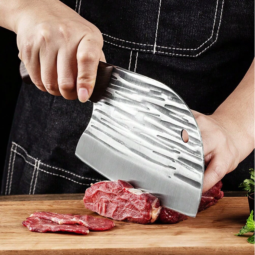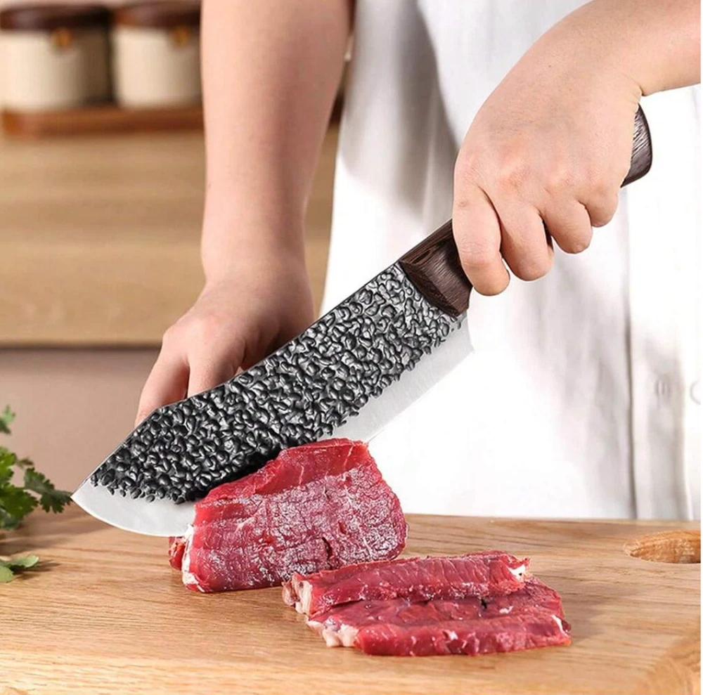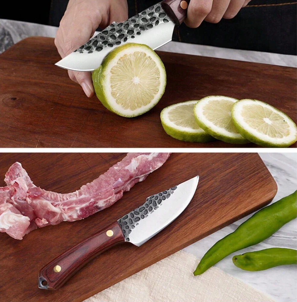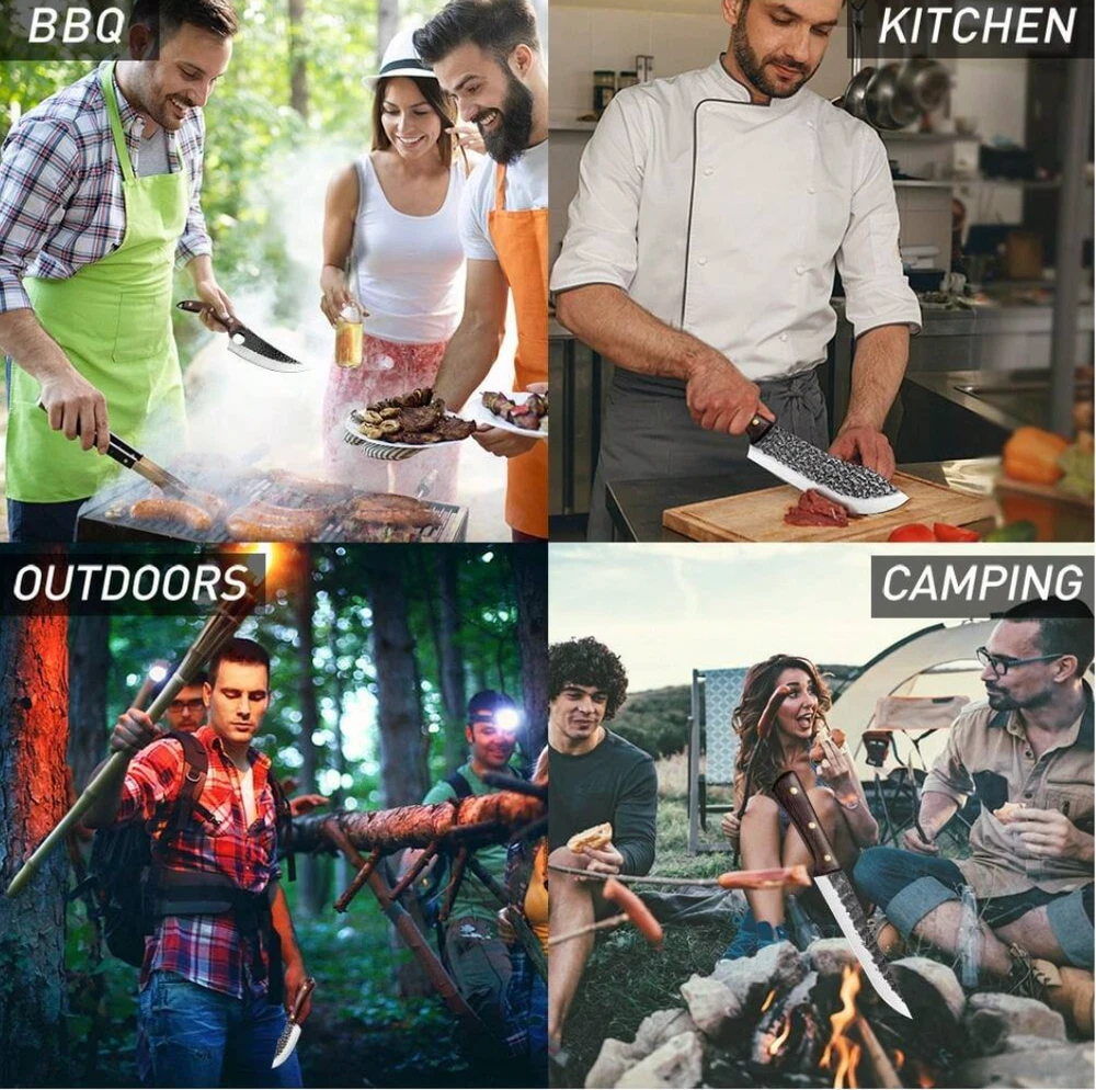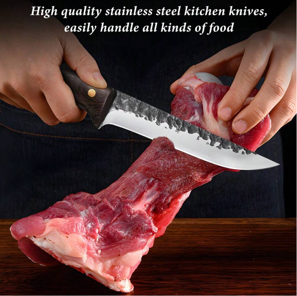 8 Pieces Butcher Knife, Knife Set, Forged Chef Knife for Meat Cutting, Professional Meat Cleaver for Kitchen, Camping, BBQ 8 Pieces Butcher Knife, Knife Set, Forged Chef Knife for Meat Cutting, Professional Meat Cleaver for Kitchen, Camping, BBQ Set includes a 9.64" cutting knife, an 11.88" butcher's knife, a 10.8" curved knife, an 11.8" meat knife, a 10.35" boning knife, a 10.23" small boning knife, an 8.18" multi-purpose knife, and a sharpening rod. Each knife is made of stainless steel and stays sharp for years to come. Ergonomically designed to ensure a comfortable and secure grip. Say goodbye to slippery handles, and you will enjoy easy and precise cutting. This butcher knife set is not only practical but also beautifully crafted, making it ideal for cooking enthusiasts. Give the gift of precision and style to yourself or a friend with this outstanding set of knives.