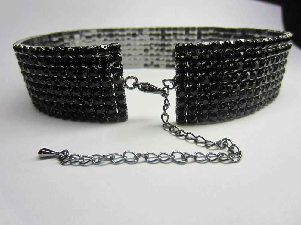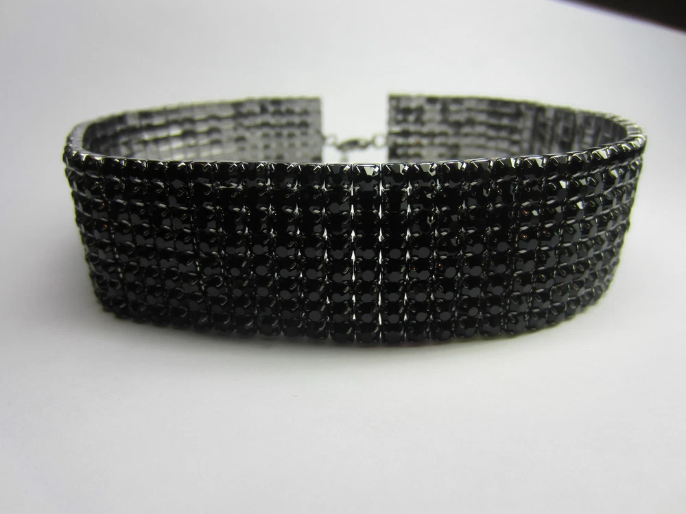8 Rows BLACK Rhinestone DANCER Stripper Stretch Necklace Choker Blacktone Metal