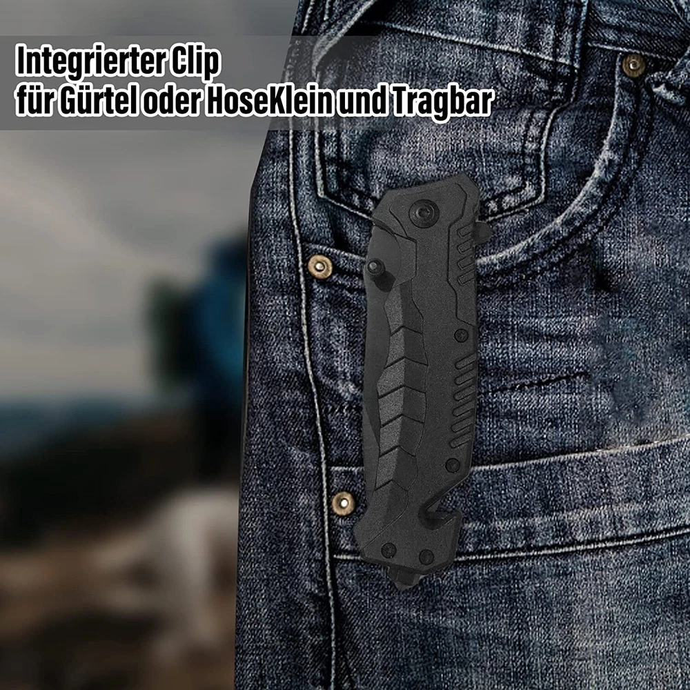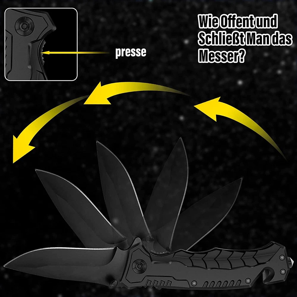 Knife type: folding knife You buy here a very high quality outdoor folding knife of the brand The extremely sharp blade, is made of stainless steel and can be opened comfortably with one hand, by means of flip function. The knife meets all the criteria you would expect from a Survival pocket knife! In addition to an extremely high overall stability of the knife, it additionally has a belt cutter and a glass breaker. In addition, you can easily carry your faithful companion with you with the existing belt clip and have your tools at hand at any time. Whether you are carving, cutting, guttering, refining or crushing, the robust, ergonomically shaped handle made of aluminium is perfect for you and carbon perfect in the hand. Features: robust and wear-resistant, sharp and durable, easy to carry, suitable for hand shape, carefully selected materials, mini and compact, foldable Specificaiton: Blade length: 9cm Blade angle: 50 ° Length of knife handle: 110mm Application: Outdoor, Self-defense Material: aluminium alloy+stainless steel 3cr13 Applicable audience: It is not recommended for minors to buy and use, and during use supervision by adults is required. P ackage included: 1 x Knife