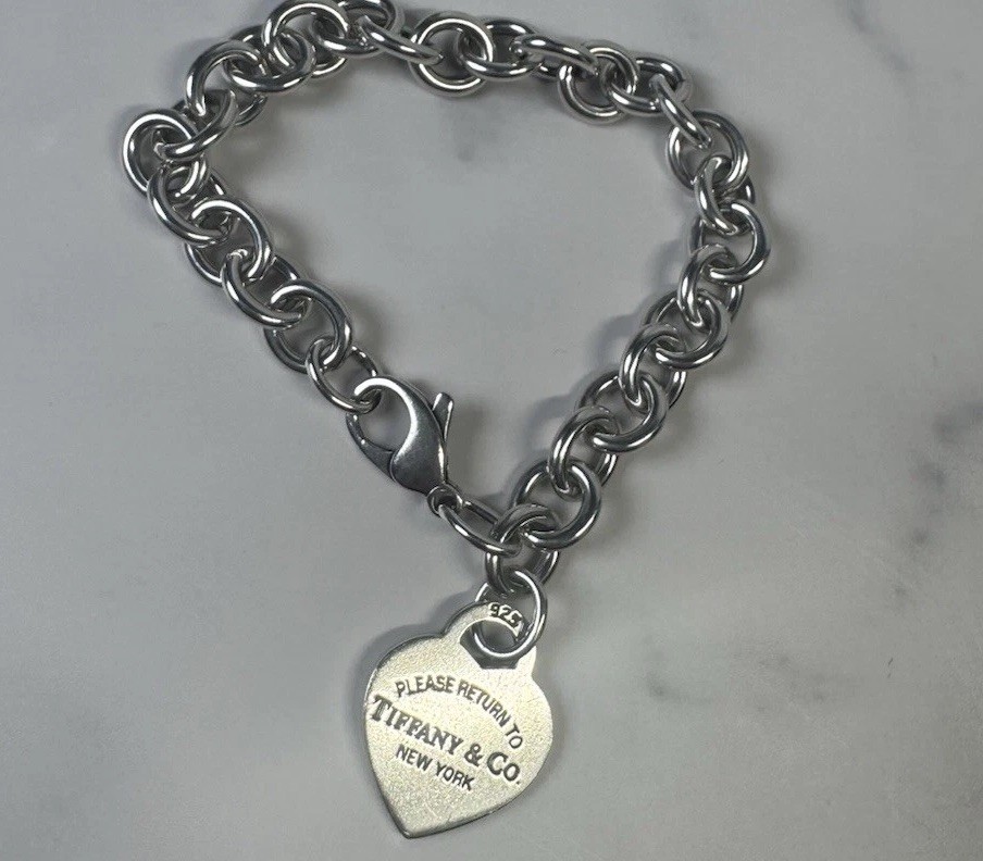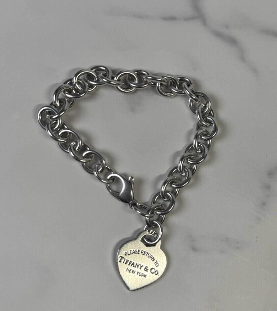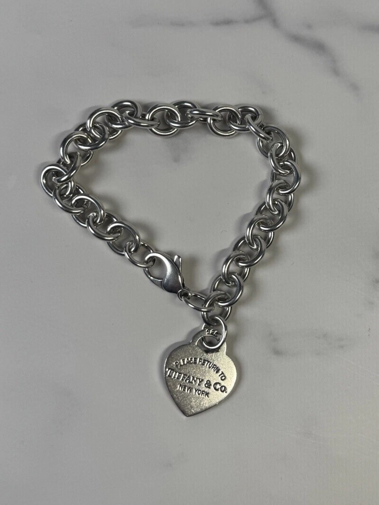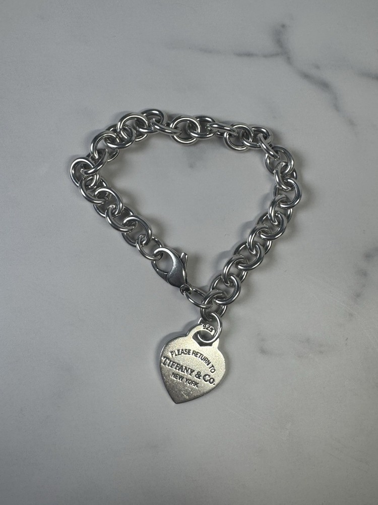 This 8" Return to Tiffany & Co Silver Heart Tag Charm Bracelet is a stunning piece of fine jewelry that features a heart-shaped tag charm in sterling silver. The bracelet has a lobster clasp for secure closure and comes with a blue pouch for easy gifting. With its signature Tiffany & Co. branding, this bracelet is a beautiful symbol of love and family, perfect for both special occasions and everyday wear. Made in the United States, this bracelet is a timeless and elegant accessory for any jewelry collection. Medium size heart, 34 grams.
