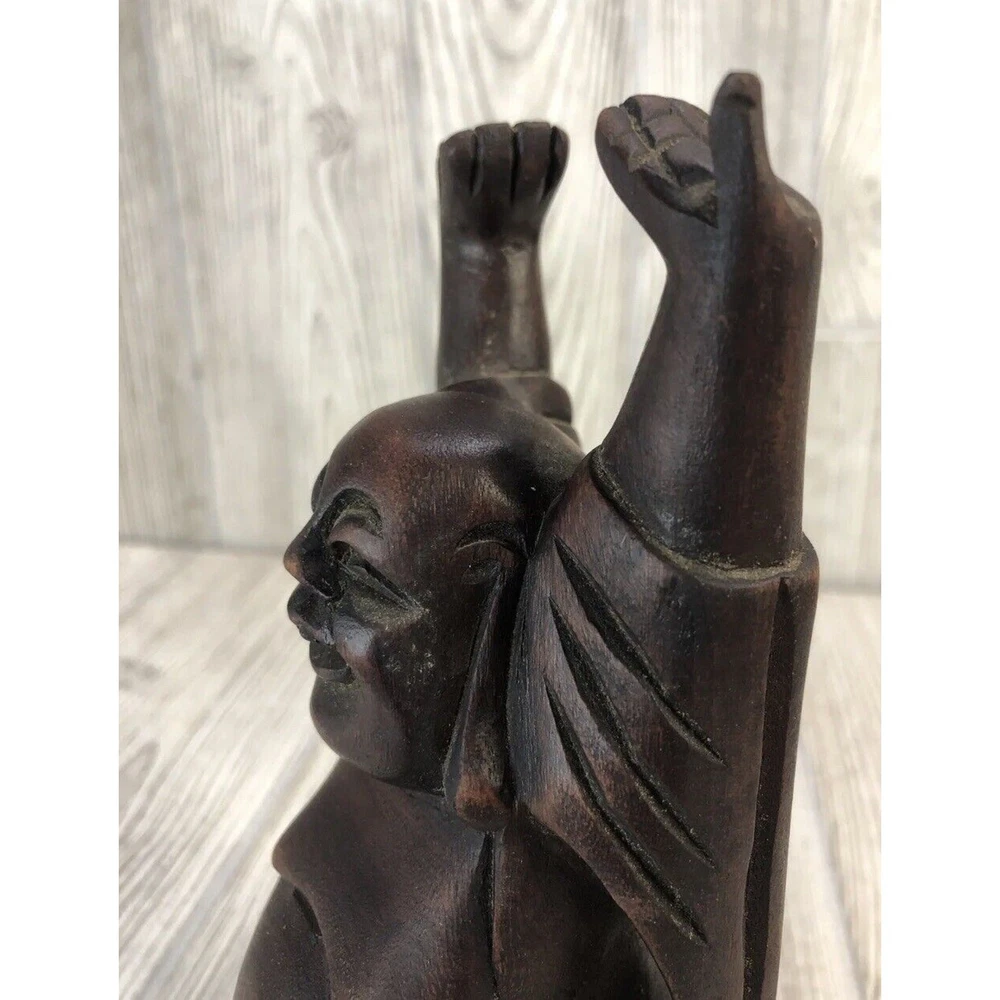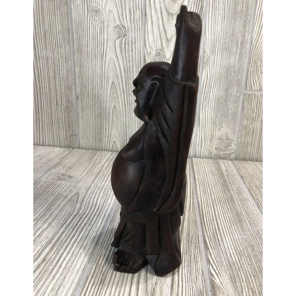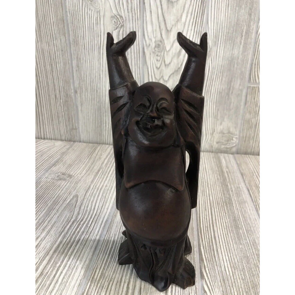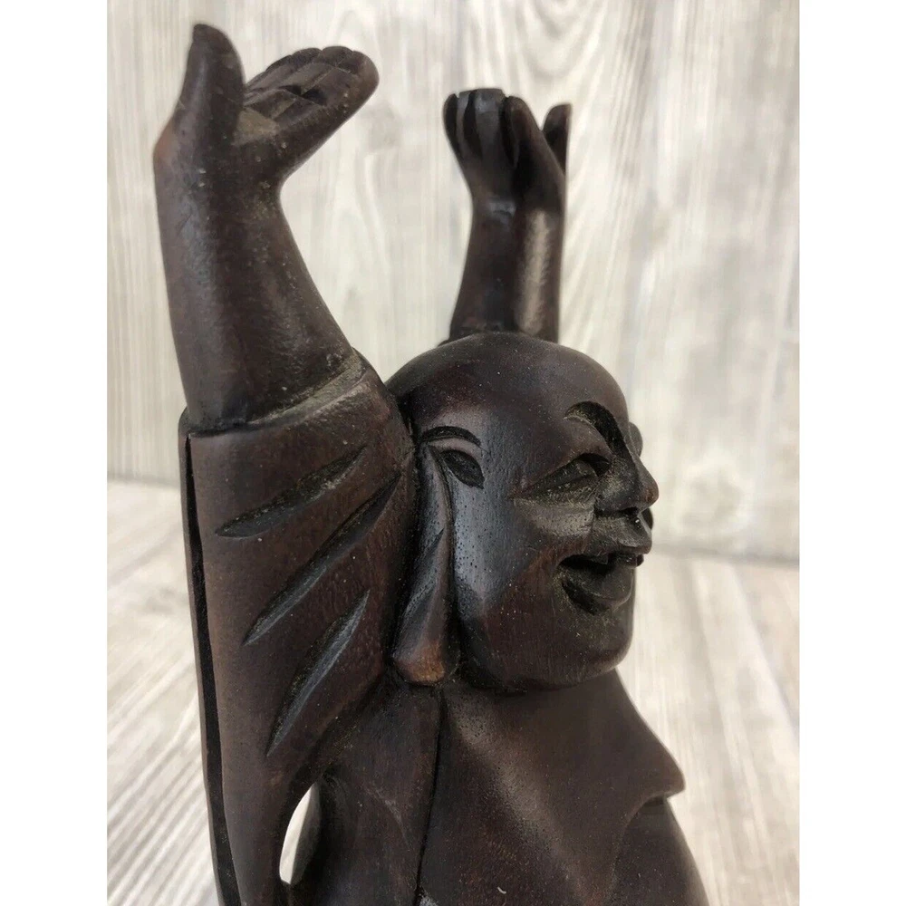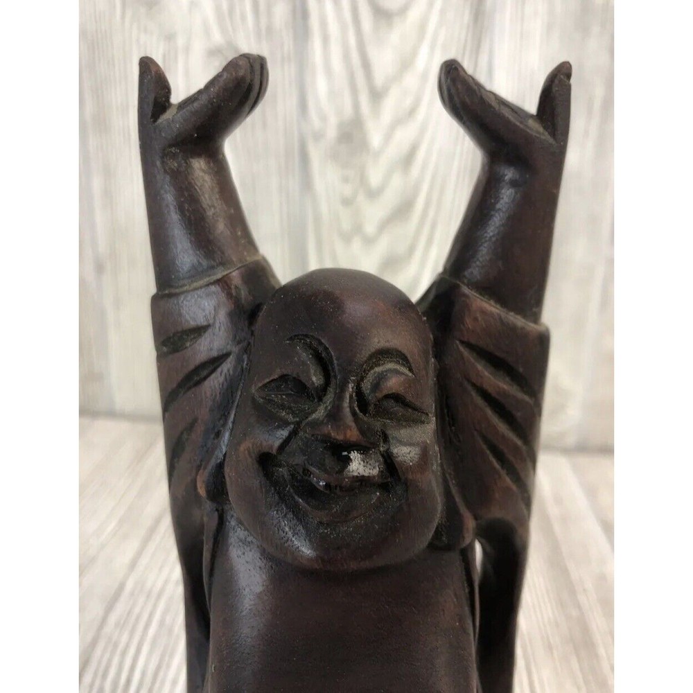 For sale is this 8" tall wooden Buddha statue. Vintage. Happy, Smiling Asian. Handcarved. Good condition, minor wear consistent with age and use. Chip on foot. See photos.