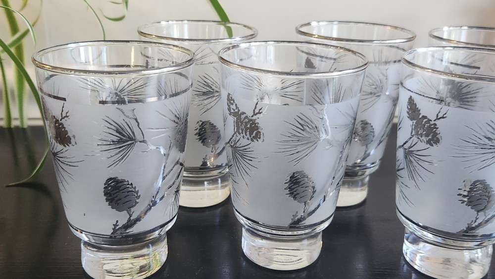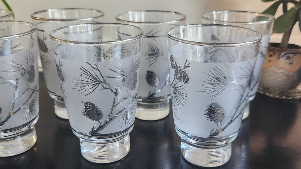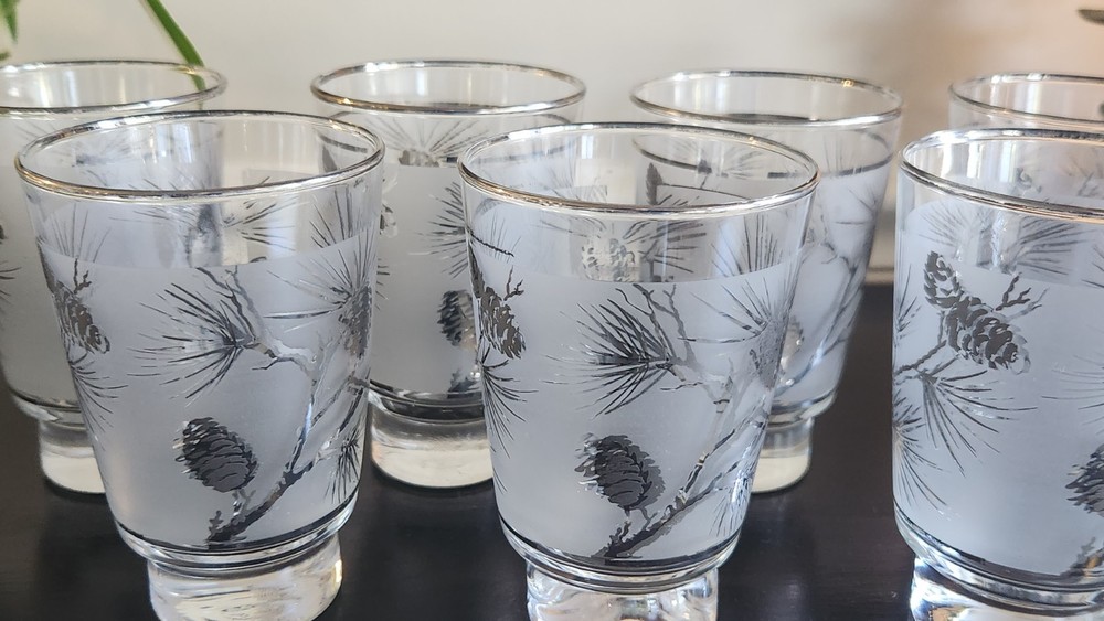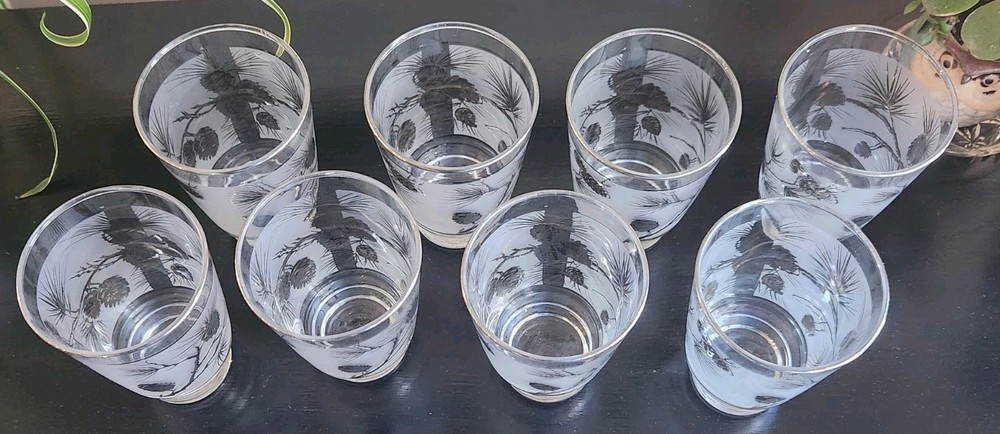 Very hard to find libbey ponderosa pine barware Eight 10 ounce glasses No chips or cracks There is some loss of the silver trim, particularly around the rim. Any questions, just ask. Thanks for looking!