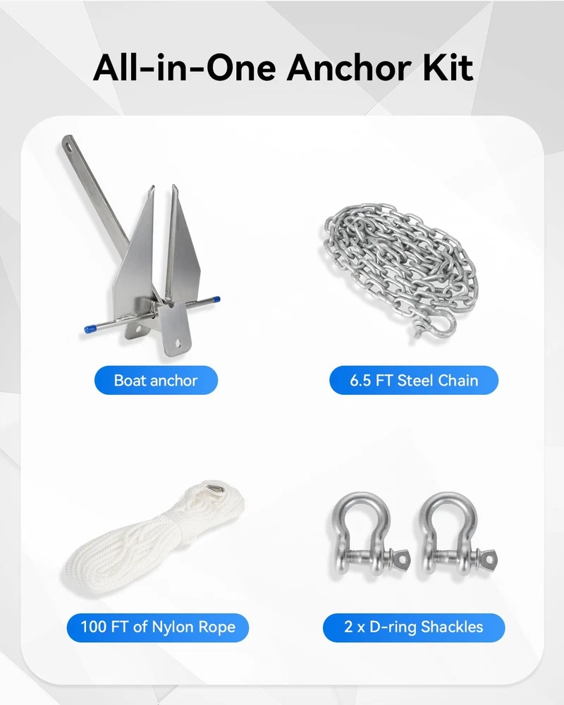 ► 8 lb Galvanized Fluke Anchor Kit Complete Boat Anchoring System for 12–22 ft Boats A reliable all-in-one anchoring solution designed for pontoons, fishing boats, dinghies, bass boats, and similar vessels between 12 and 22 feet. Perfect for lake days, coastal cruising, offshore fishing, and weekend boating trips. ✔ Fits 12–22 ft Boats Ideal for pontoons, fishing boats, dinghies, and bass boats Designed for vessels in the 12–22 ft range Suitable for lake, coastal, and nearshore use Provides dependable holding power for recreational boating ✔ Complete All-in-One Anchor Kit Includes everything needed for secure anchoring. No additional purchases required: (1) 8 lb Hot-Dip Galvanized Fluke Anchor (1) 6.5 ft Steel Anchor Chain (2) D-Ring Shackles (1) 100 ft Nylon Anchor Rope ✔ Strong Holding in Sand & Mud Fluke design digs deep into sand and mud bottoms Weighted chain improves anchor angle and grip Helps prevent dragging in wind or current Keeps your boat stable in changing conditions ✔ Hot-Dip Galvanized Steel Construction Rust-resistant finish Corrosion-resistant in saltwater and freshwater Built for long-term marine exposure Designed to withstand harsh environments ✔ Durable Nylon Anchor Rope 100 ft marine-grade nylon rope Excellent tensile strength Shock-absorbing stretch Soft to handle yet tough under load Provides flexibility and secure anchoring performance ⚠ Important Note Recommended for 12–22 ft boats under typical recreational conditions. Always verify proper anchoring technique and bottom conditions before use. On Apr 3, 2026 at 08:57:01 PDT, seller added the following information: