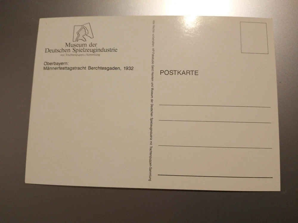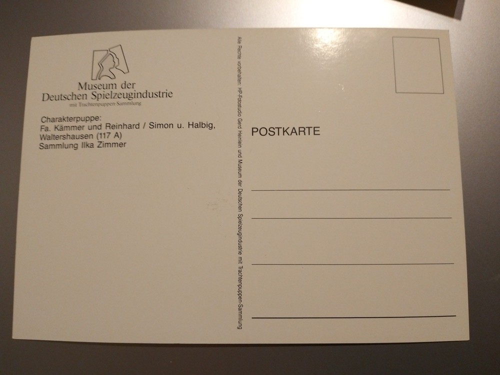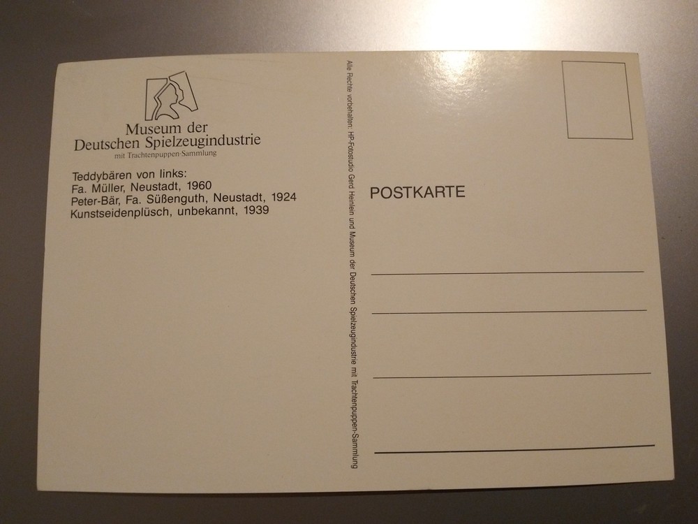 Tauchen Sie ein in die Welt der Nostalgie mit diesem exklusiven Set von 8 Fotopostkarten aus dem Museum der Deutschen Spielzeugindustrie in Neustadt bei Coburg. Jede Karte präsentiert liebevoll eingefangen Momente von Teddybären und alten Puppen, Motiven, die Liebhaber von Kunst und nostalgischer Romantik begeistern werden. Die Karten sind aus hochwertigem Karton gefertigt und zeugen von der handwerklichen Finesse und dem authentischen Charme deutscher Spielwarentraditionen. Diese Originalpostkarten sind ein wertvolles Sammlerstück für Kenner und bieten eine einzigartige Zeitreise in die Nachkriegszeit. Ob zum Sammeln, Verschicken oder als romantisches Geschenk, diese Motivkarten verbinden künstlerische Schönheit mit historischem Wert und sind ein kulturelles Kleinod aus Deutschland. Privat Verkauf keine Garantie und keine Rücknahme und Ausschluss jeglicher Gewährleistung.