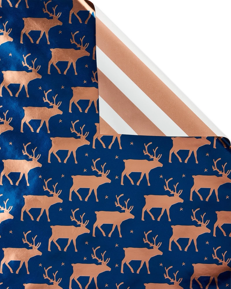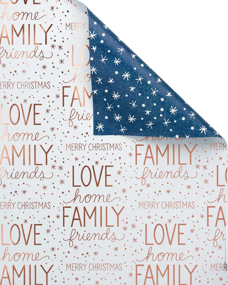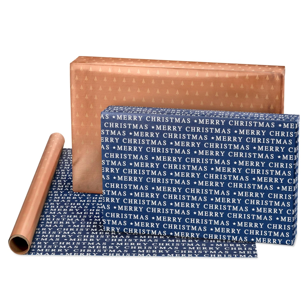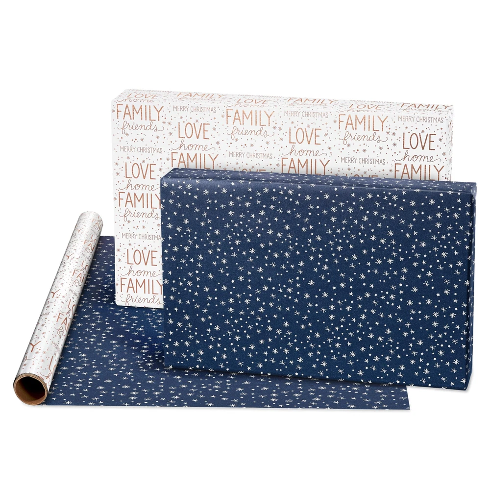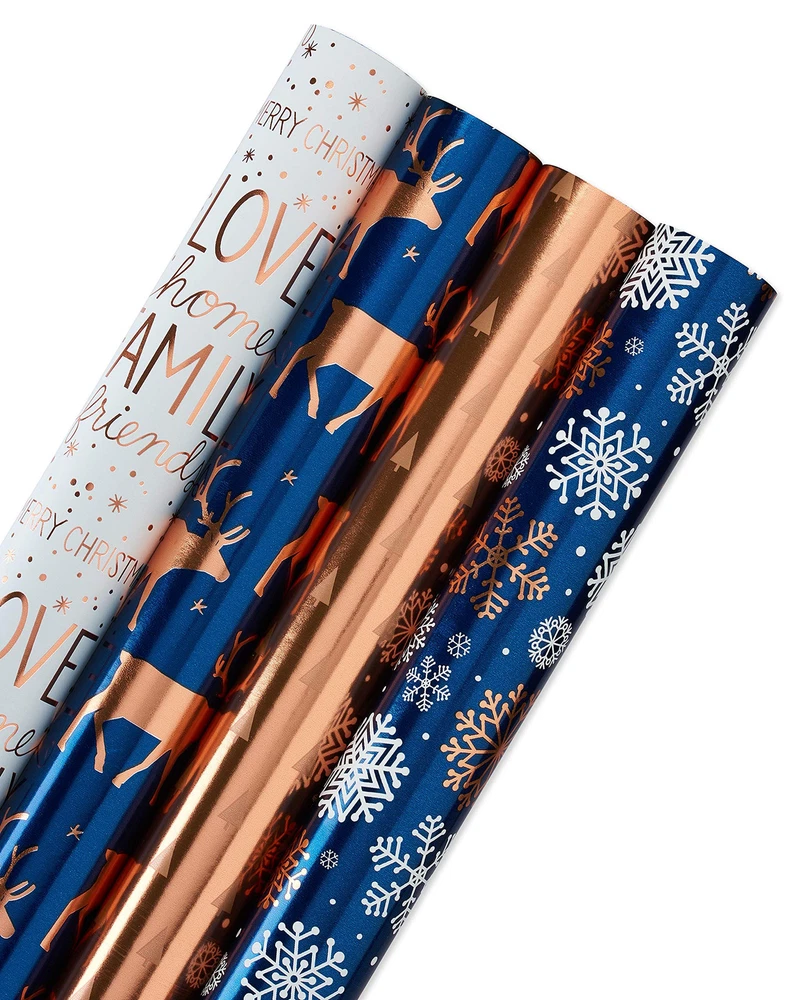 Wrap up your holiday gift wrapping with this 4-pack of reversible wrapping paper rolls. Each roll can wrap about 7 average-sized shirt boxes, so you’ll have plenty of room to wrap gifts of any size. And since each roll features coordinating designs on either side of its heavyweight paper, it’s easy to give your tree display some festive variety. offers exceptional greeting cards, gift wrap and celebration products so you can connect in ways that fit your personality and authentic style! Includes 4 rolls of reversible wrapping paper Each roll measures 30 inches wide by 8 feet, 20 total square feet. 4 rolls measure 80 square feet total. Each roll can wrap approximately 4 shirt boxes that measure 14.75 inches x 9.5 inches x 1.88 inches. The 4 roll pack can wrap 28 shirt boxes! Made with heavyweight paper that’s recyclable and assembled in the USA These navy and rose gold Christmas wrapping paper rolls have a metallic foil finish and features festive designs including reindeer, snowflakes, Christmas trees, stripes, polka dots and lettering with warm holiday messages. These wrapping paper rolls are the perfect gift packaging option with coordinating designs will add variety and style to your holiday Christmas gift wrapping! Perfect for wrapping Christmas gifts for family and more!
