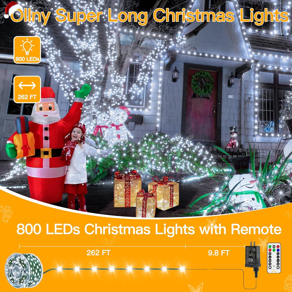 800 LED 262 FT Outdoor Christmas Lights with Green Wire IP67 Waterproof Plug-In