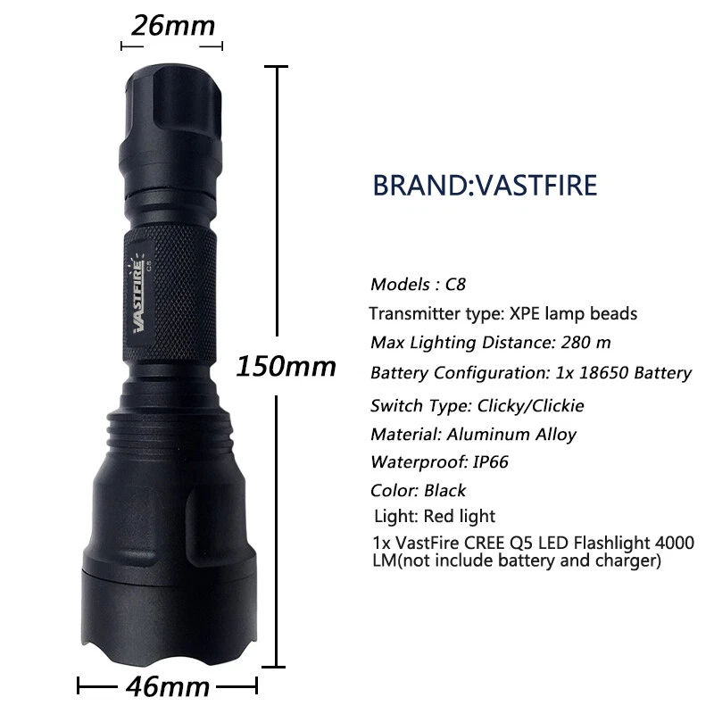 Type: Flashlight Main Colour: Black Color: Black Number of LEDs: 1 Torch Type: Lanterns Brightness: 6000 Lumens above Brand: VASTFIRE MPN: Does Apply Operating Range: 25 m Features: 1000 yards, Attack Head/Spikes, Batteries Included, Green, Handheld, Rechargable, Rechargeable, Wrist Strap Number of Batteries: 1 Custom Bundle: Yes Material: Aluminium