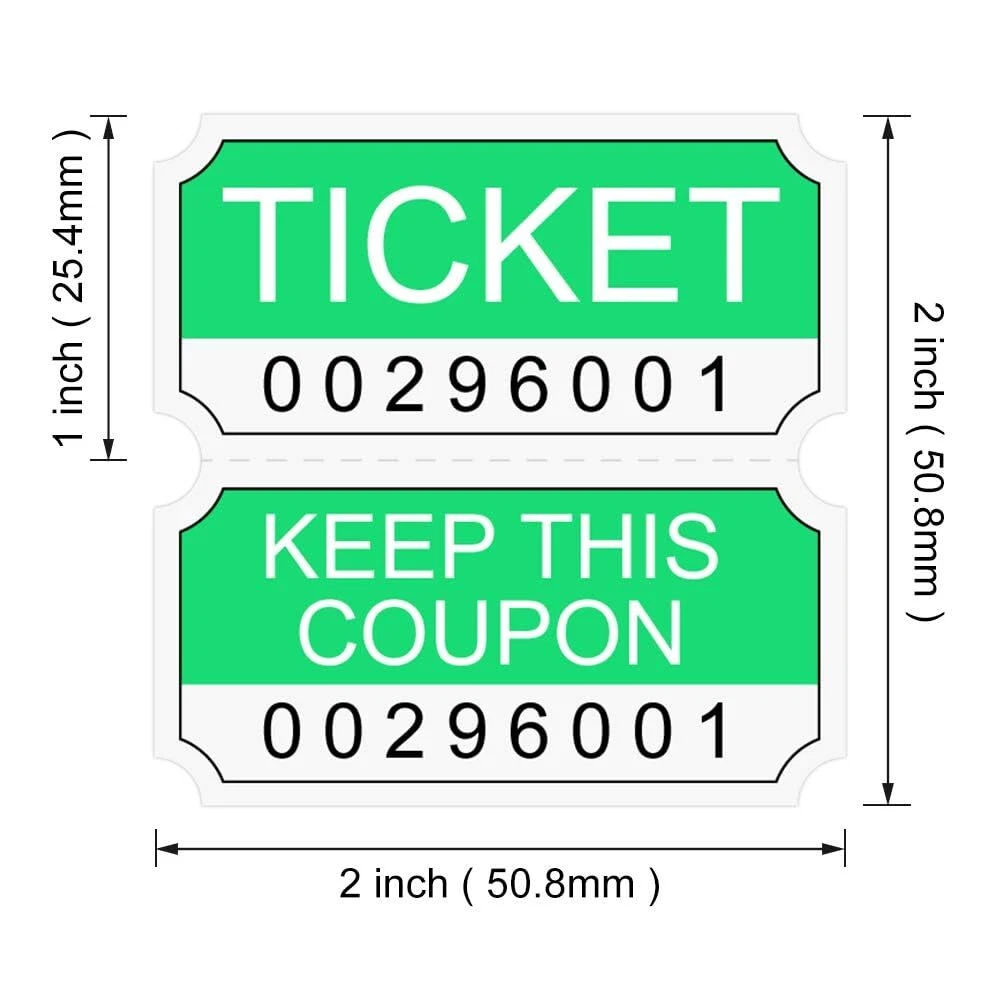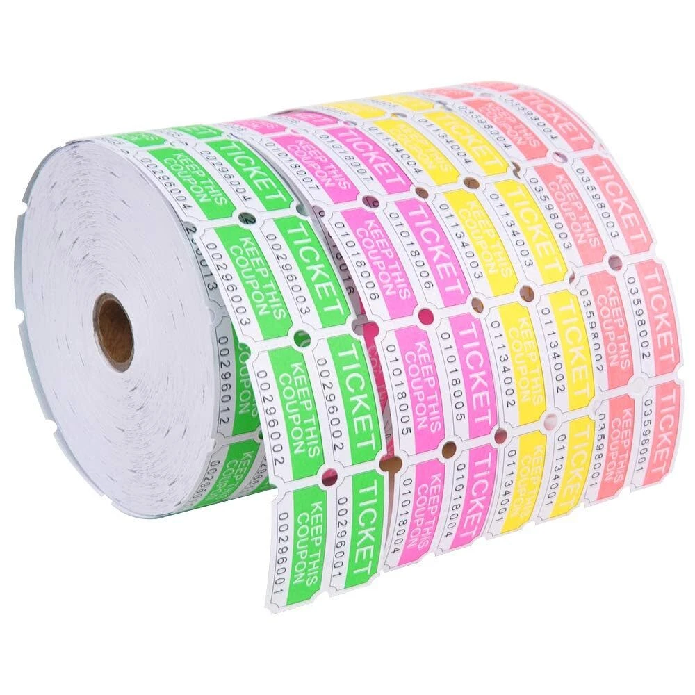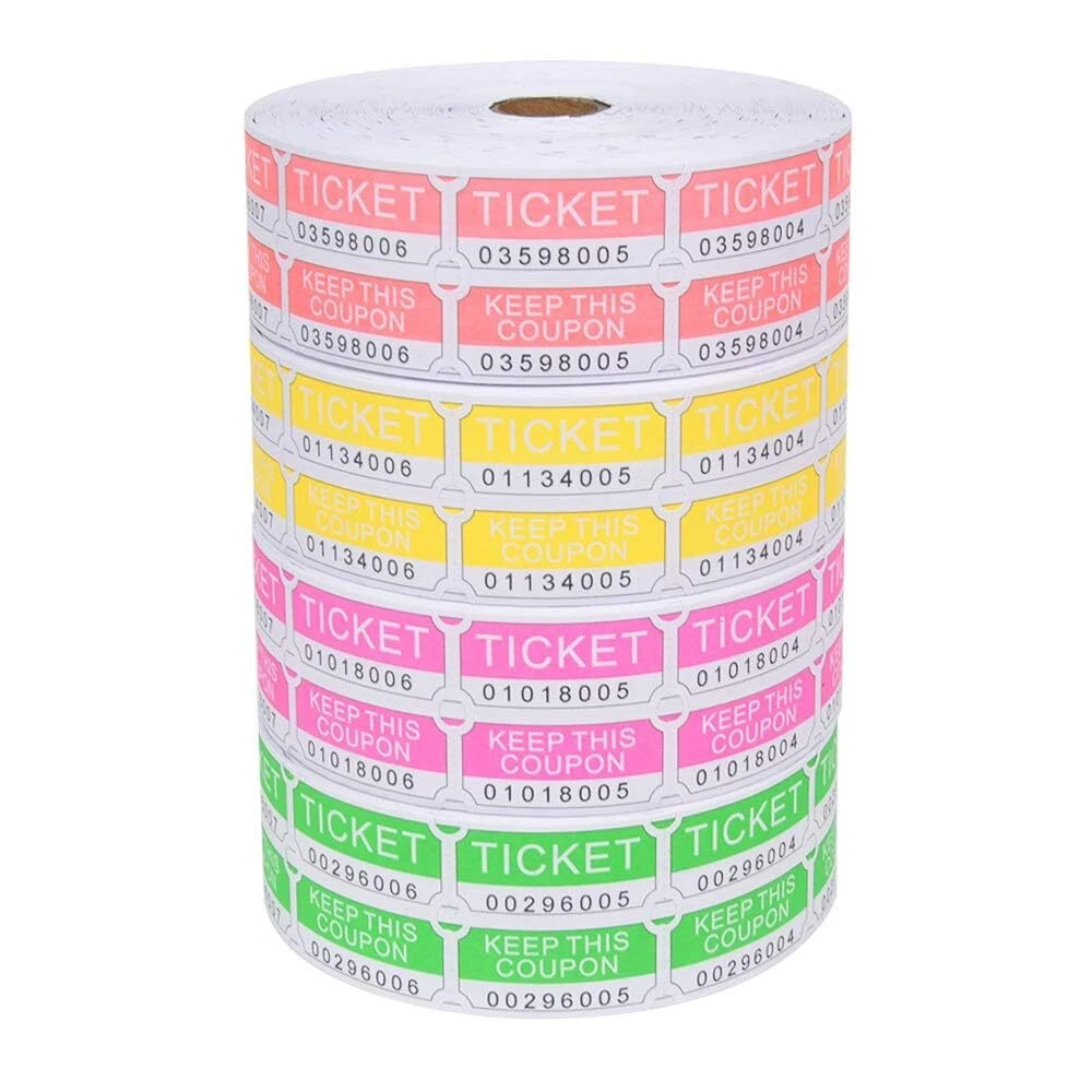 Add some excitement to your party or social event with this Double Roll of Raffle Tickets. Our consecutively numbered double tickets include 2000 tickets per roll and each ticket has a tear-off ticket stub. Our roll of tickets are perfect for raffles, fair and carnival games, school dances, prize drawings, admission tickets, and more. You will receive 4 colors - 1 each of Neon Green, Neon Pink, Neon Red and Neon Orange Roll of 2000 pairs 2” x 2” double tickets, each pair with a deposit ticket and keep ticket, and split into 2” x 1” halves Consecutive numbers are printed in edge of raffle tickets,which avoid fake tickets sneak into these tickets and make counting more efficient. There are perforated lines between raffle tickes,so that it's very easy to tear apart. Name/Address/City/Phone can be filled in the back of raffle tickets which be printed "TICKET".These raffle tickets include deposit tickets and keep tickets.