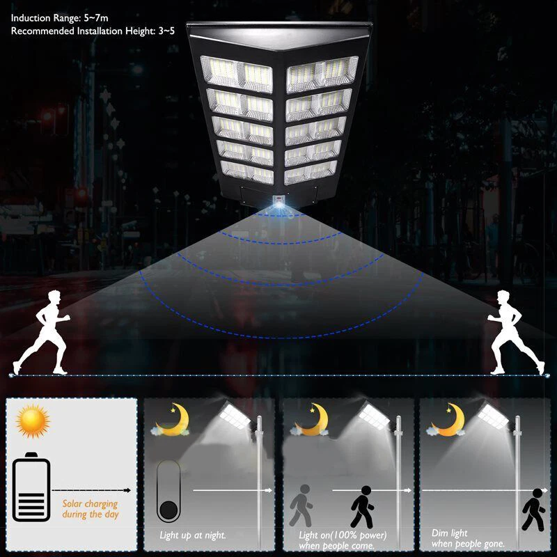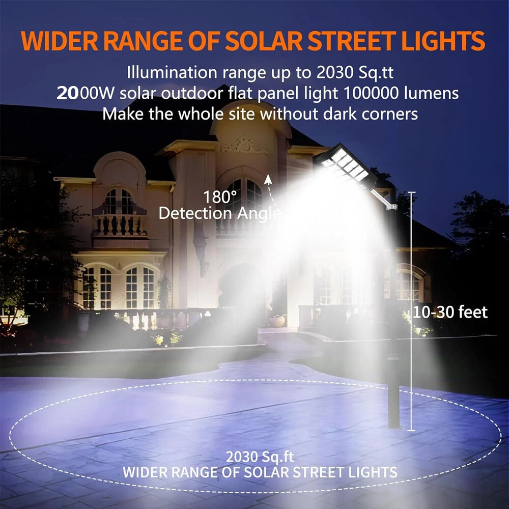 800LED 2000W Watts Commercial Solar Street Light Parking Lot Road Lamp New US Advantage 【Fast charging and Dusk to Dawn】 Our commercial solar street light outdoor comes with 6500k cool white light, Built-in Super Bright LED Beads, it is more bright other led beads, it provided the clear and bright vision. The conversion rate of solar panel installation reaches 22.5%. Fully charging 6-8 hours in the daytime, the led street light can continue to work for more than 14 hours . Powered by solar and save electricity bill, automatically turns on at dusk and turns off during the day. Dusk to Dawn. No worry lighting lasts. 【Motion Sensor + Remote Control+Timing mode】 These led road street light are equipped with remote control, it is good for long distance to control, remote distance:12m. You can choose different lighting modes ( Light Sensing Mode, Motion Sensing Mode ) and light brightness for your needs. There are 4 levels of brightness that can be adjusted. Remote control operation can be timed,it Provides 5 Timing sets: 2H/3H/5H/6H/8H. Radar sensor mode, the lights are 100% brightness when motion is detected, and the lights are dim and 30% brightness when no motion, intelligently saving electricity, and increasing the lifetime of street lights. 【220° solar panel design and wide-angle lighting】 We have upgraded the solar panel and it has two-way wide-angle lighting, the lighting angle reaches 220°, and benefits from super bright led beads, allowing it provide a wider range of lighting and brighter light compared with ordinary 180° street lights. Illumination area up to 1600-1900sq.ft, we recommended installation height:6-8M.It can be lighting up street and offer convenience for walking at night. 【IP67 Waterproof and Durable】 The outdoor solar street light adopts high-quality material, which is lightning-proof, rain-proof, oxidation-proof and anti-exposure. IP67 waterproof function makes it work on a rainy day. Its adaptable working temperature is -22℉~140℉. This outdoor Solar Parking lot Lights pole has 30000mAh battery capacity, is more stable and longtime lasting. 【Easy to install and wide application】 This street light solar powered has 2 installation ways, it is easy to install on poles and walls. The installation accessory included in the package, no wiring is required, which can be easily installed outdoor. Perfect for street and roads, parking lot, basketball court, garage, garden, street, courtyard, farmhouse and squares, etc. Features: 【No Power Calculation】 s olar lights for outdoor use provide 6500 K daylight white light. Equipped with 800 super bright LED . IP67 waterproof makes it good all year round even in bad weather. Solar powered, no electricity bill, automatically turns on at dusk and off during the day, continuous lighting for 20 hours on a full charge. 【Super Wide Angle Lighting】 The motion sensor outdoor lights are equipped with a bi-directional 45 degree wide angle lighting, which can provide a wider lighting spectrum and brighter light compared to ordinary street lamps. Lighting range up to 2000-2200sq.ft, induction range: 20-26ft; lighting blind spots. Escort the safety of you and your family. 【DUSK TO DOWN & MOTION SENSOR】 Auto ON at Dusk and Auto OFF at Dawn controller thanks to highly sensitive brightness sensor. The LED solar outdoor light does not need to be controlled manually, convenient and energy-saving street lamp. Intelligent and sensitive motion sensor, keeps 30% brightness when no motion, bright up to 100% brightness when motion is detected. Keep safety, but also energy saving. 【Intelligent Control】 The solar floodlights for outdoor use are equipped with a remote control that allows convenient use over long distances. You can choose different lighting modes (light detection mode, motion detection mode) and light brightness for your needs. There are 4 brightness levels that can be adjusted and offer 5 timing sets. The user manual of the remote control is shown in the product description. 【Easy Installation】 The solar powered street lights come with two installation methods: mast mounting and wall mounting, no wiring is required, which can be easily installed outdoors. Perfect for street and paths, parking lot, hiking trails, basketball court, pavements, farms, garage, garden, street, yard, squares etc. 【Waterproof & Durable】 The solar street lamp uses a high-quality ABS shell that is flash, rain, oxidation and exposure resistant. IP67 waterproof, can withstand all kinds of outdoor bad weather conditions. The adjustable working temperature is -50°F ~ 140°F. Specification: 2000W 800LED Wattage: 2000W Fully Charged Lighting: 20 hours Solar Panel: 6V/30W Solar Panel Size: 59*33.5 cm Battery Capacity: 3.2V 2.0AH Product Function: radar + light control + remote control Lamp Body Size: (H*W*L)68*8.5*35cm/26.77*3.35*13.78inch Lamp Beads: 800 PCS Light Source: LED Irradiation Area: 250 square meters Installation Height: 4-6m Material: ABS engineering plastic PC cover Waterproof :IP67 Remote Control :Normal light or induction mode Remote Control Battery Type: 2*AAA (included) Life: 100000 (h) Package Include: 1 x Solar Street Light (Mounting Pole is Include) 1 x Remote Control Payment Delivery details Returns About us Contact us Payment Thank you for considering our products. We would like to inform you that we only accept payment through eBay. If you have any questions regarding payment, please do not hesitate to contact us. We also offer discounts for bulk purchases, which you can avail of by sending us an email through eBay Message or by taking advantage of our existing promotional activities. Thank you for your interest and we hope you have a great shopping experience with us. Delivery details Thank you for choosing our products. All of our goods are shipped from our warehouse in the United States and we provide standard shipping methods. You can expect to receive your order within 1-5 days. If you need assist