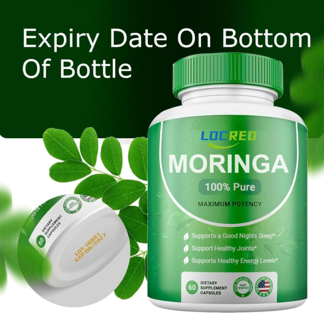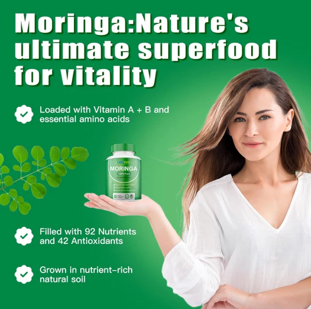 Moringa Powder Capsules - 800mg of Pure Nutrient US Warehouse - FREE & FAST Shipping in US Product Description: These statements have not been evaluated by the FDA. This product is not intended to diagnose, treat, cure, or prevent any disease or health condition. Product Description: Moringa Powder Capsules - 800mg of Pure Nutrient-Rich Moringa Powder - A Natural Green Antioxidant Superfood - Supports Energy, Skin Health, Gut Health+ Essential Vitamins & Amino Acids The Ultimate Green Superfood: Packed with more nutrients per gram than any other plant, Moringa contain 27 vitamins, 9 essential amino acids, 46 antioxidants + numerous other minerals & nutrients - a perfect boost to overall wellness and vitality. Vitamin Powerhouse: Contains 7 times more vitamin C than oranges, 10 times more vitamin A than carrots, 17 times more calcium than milk, 9 times more protein than yogurt, 15 times more potassium than bananas, and 25 times more iron than spinach. Difference: we're committed to superior quality and transparency. Our Moringa is passionately grown, ethically sourced, and produced with your health in mind. Holistic Health Benefits: Supports Immune function, Gut health, Skin health, & Energy with our natural, nutrient-dense Moringa. Feedback: 1.Any question for your order, please contact us in time, we will reply to you within 24 hours and give you a satisfactory answer. 2.If you are satisfied with our products and services, hope to take up your a little precious time to leave feedback reviews for our products.Thanks! 3.Your satisfaction is our effort. Welcome to order again! Have a great day! Our Policy: 100% Satisfaction Guarantee 20% of restocking fee will be charged for return item