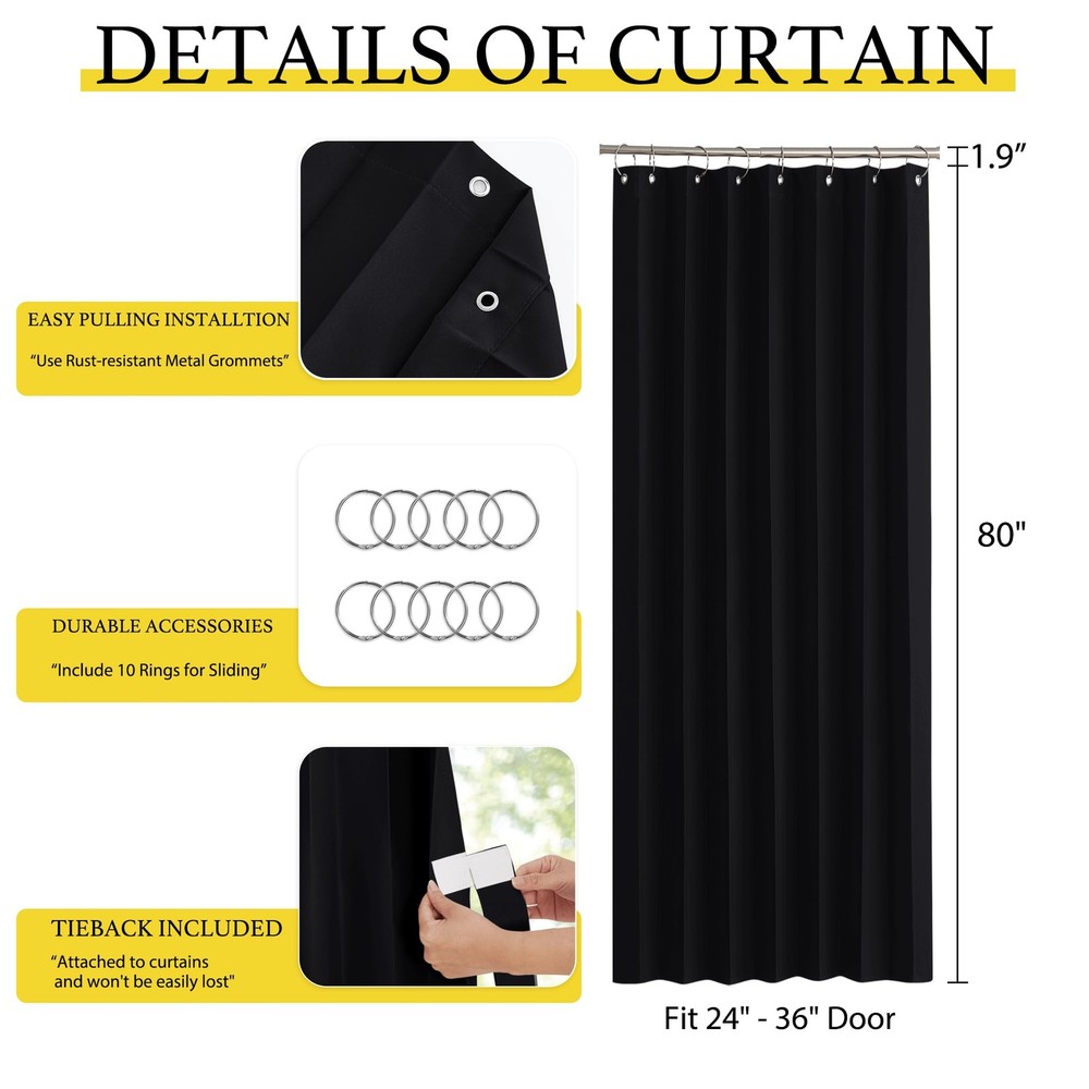 We all love Door Curtains for the way they make our home elegant and welcoming. Product Info.: The door curtain package comes with 1 panel and Hooks. Each panel measures 38 inches wide by 80 inches long. The length excludes the rings.It's easy hanging and removing on an existing rod. Genius Idea of Door: Are you tired of all the same doors? Depressed by small Spaces? Shy away from expensive doors? Need more conveniently pass through? Now you don't have to worry, we offer a brand new temporary door, this easy install soft blackout drape is perfect for you instead of doors now. Fabric Function: No formaldehyde, no chemical coating, no pungent smell, high-quality material is safe for babies and small kids. Blackout curtain liners block out sunlight, harmful UV rays, noise, and heat while offering privacy. Versatile Home Decor: Use the simple, modern and soft drapery as an exterior door curtain or interior door curtain between kitchen, dining room, bedroom, living room, patio glass door, and closet, hallway. Easy Care: blackout curtains are made to last. Machine washable in normal temperature water, use mild detergent, no bleaching, tumble or natural dry. Steam ironing can easily remove the wrinkles or any fold marks.