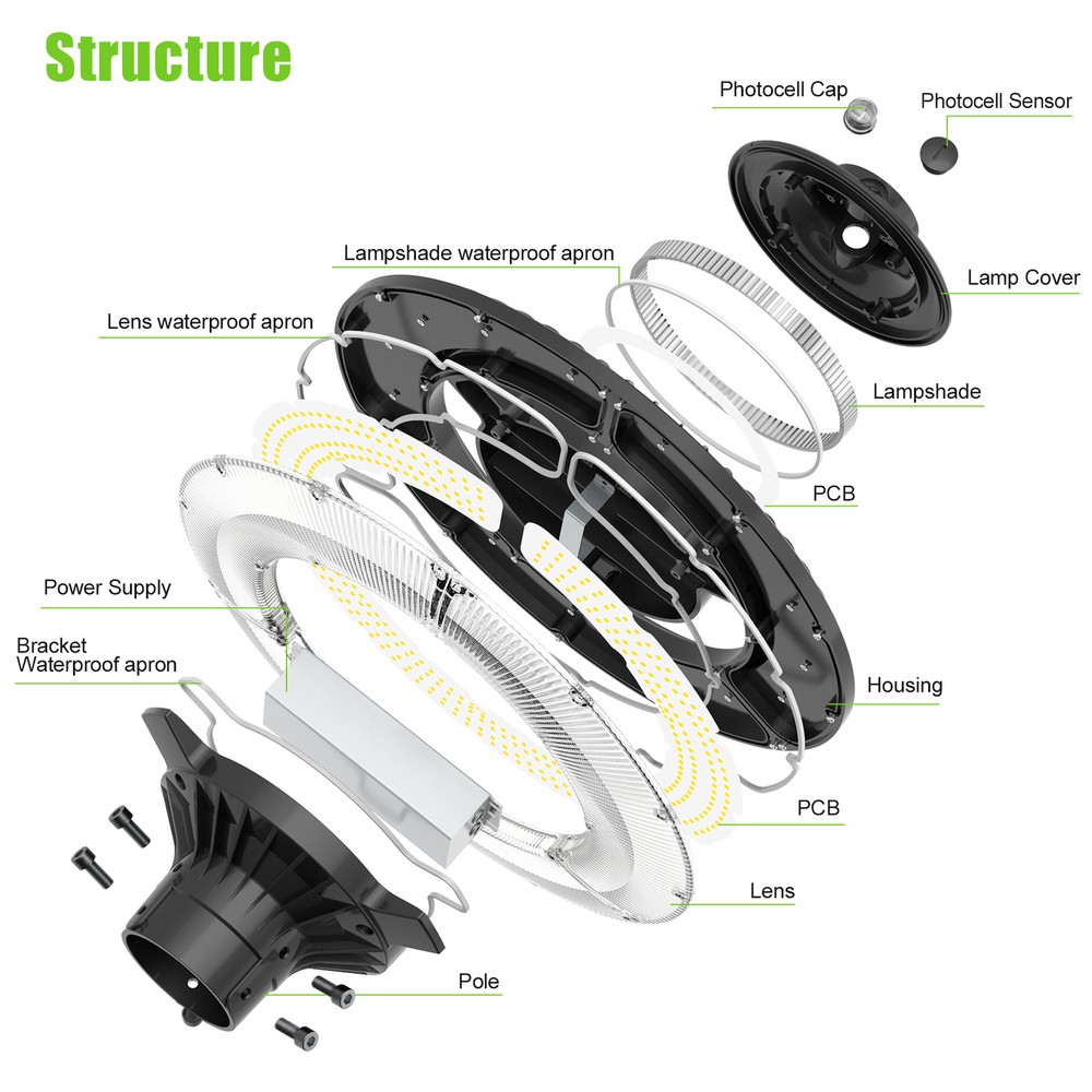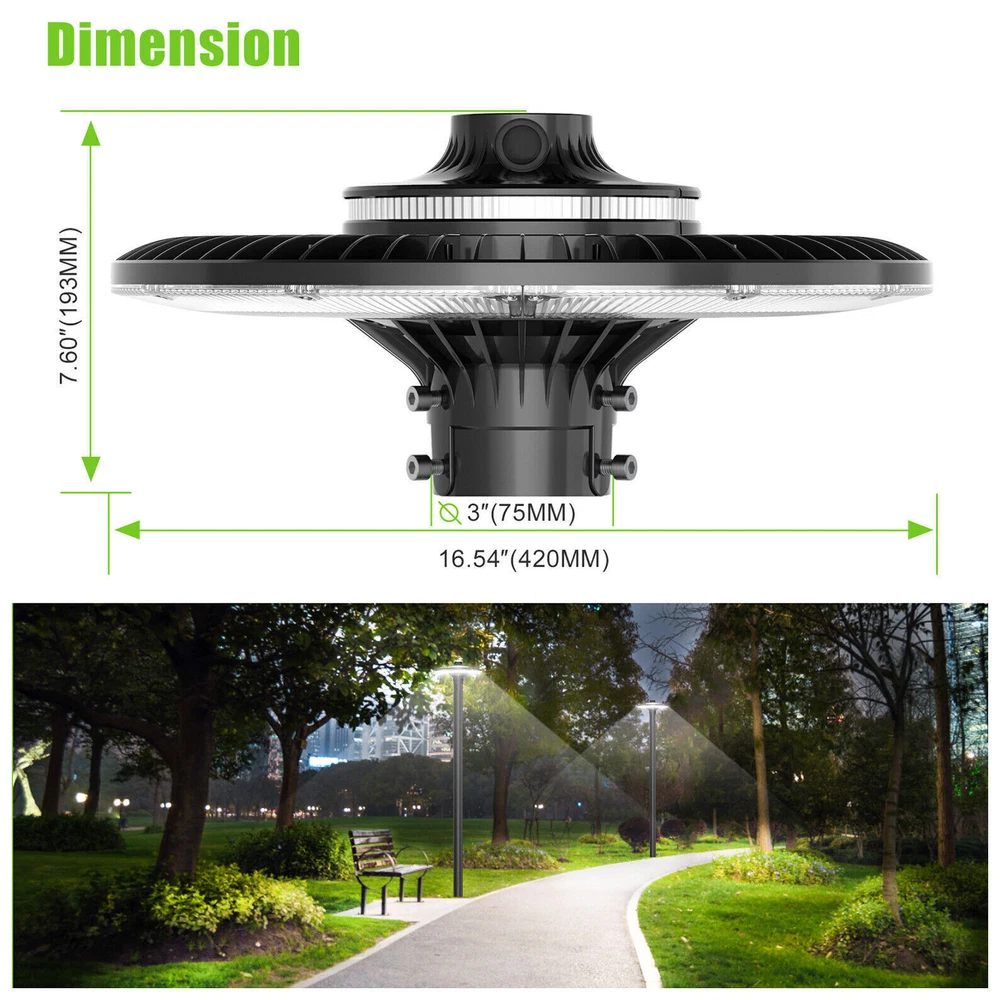 SAFE & SECURE SHOPPING 100% SATISFACTION GUARANTEED FAST SHIPPING 80W Led Post Light Dusk to Dawn Outdoor Garden Circular Pole Lighting Product Description 80W Led Post Light Dusk to Dawn Outdoor Garden Circular Pole Lighting Adjust CCT ADJUSTABLE CCT - The LED post top light AC 100-277V universal voltage has unique function of daylight white 5000K. FULLY WEATHERPROOF - Die-cast aluminum metal body and impact-resistant, IP65 waterproof rate for outdoor wet locations, perfect option for worry-free outdoor lighting. The commercial-grade housing features a lens made of high quality-shatter resistant epoxy designed to stand heat and impact! ENERGY EFFICIENT - With high performance of power factor >0.9, more than 50,000hours lifespan, reduce your electricity running cost with up to 80% by replacing 500W MH/HPS/HID bulbs with 150W LED. The energy savings and the long-lasting lifespan of YELLORE LED Top Post Fixtures makes for a brighter, smarter and more sustainable lighting solution. SUPERIOR BRIGHTER - This durable post light fixture has a lumen count of 10800 and a 120° beam angle, making it perfect for illuminating parking lots, street, sport fields, yard and general lighting applications. Anti-shock, anti-moisture , no glare, no strobe light, no ghosting WARRANTY - KUKUPPO offers you lasting safety and reliability backed by a 5-year warranty to cover any defects or quality control issues. Any LED technical or installations questions , please let us know anytime. Wattage:80W Input Voltage Range :AC100-277V Frequency :50-60Hz Power factor :>0.9 Protection Grade :IP65 Luminous Flux(lm) :10800Lm Color temperature(CCT) :5000K CRI :>80 Efficacy :150 lm/w Beam Angle :120 degree Life Span:50,000+ Hours Excellent heat dissipation :Heavy-duty structure aluminum manufacturing provides excellent thermal transfer to Extend component life. High Performance with superior quality Die-cast aluminum metal body and impact-resistant, the commercial-grade housing features a lens made of high quality-shatter resistant epoxy designed to stand heat and impact! Built for all conditions Designed for both wet and damp locations, enclosed designed stands up to Rust, Corrosion, Cracking and any Electrical Shocks or Fires due to Moisture. Widely application The compact composition and the light output makes the post light fixture ideal for commercial, industrial as well as residential application. Mainly use in the Parking Lot, Street, School, Garden, Stadium, Roadway, Path , Outdoor garden ect. About Us Payment Shipping Terms Returns Contact Us About Us 1. 10 Years LED Light Manufacturer 2.Certified Safety LED Light Products 3.US Warehouse Fast & Convenient Delivery 30,000 sq.ft production area &100 employees professional team. UL,cUL,cETL,ETL,DLC approved products standard produce by certified request. 6 separately production line strictly control quality & speed production Professional Aging test machine&SMT Machine&IES test system&Reflow oven Payment 1. We only accept payment by PayPal . Your ebay address must match your paypal address. PO BOX can not delivered. 2. Please make payment within 7 days. If you don't need it, please inform us to cancel it, for eBay will open UNPAID dispute automatically in eighth day. 3. Paypal allows you to complete your purchase quickly and securely. It offers a variety of payment options including all the major card carriers. Shipping ★★★ ★ ★ USA Warehouse! 2-5days Fast shipping! 1. We will ONLY ship item to eBay physical Paypal address. Your eBay address must match Paypal address. 2. We ship daily Monday - Friday . All orders will be shipped within one working day after payment. 3. Tracking number will be upload on ebay within 24 hours after shipment. 4. Shipping Time: 2-5 working days for US buyers. ★ ★ ★ All of our products are shipped from our 3 different warehouses in the US.(KY/OH/TX) Terms 1. Please kindly CONTACT US via eBay message if there is any problem, instead of Open Case or Return Requests, We will always try our best to solve the problem for you. 2. We provide a 30 days satisfaction or return guarantee for exchange or refund. 3. The package must be in its original packaging and include all of the original accessories or items that came with it when returning an item. The item and package should be in original and perfect condition. Returns 1. Sellers pay return shipping costs. Sellers pay for return, replacement or exchange shipping if there's a problem with the item. For example, if the item a. Doesn't match listing description b. Damaged or defective when received c. Missing spare parts d. Counterfeit or imitation goods 2. Buyers need to pay return shipping costs. If the buyer changes mind about a purchase and wants to return an item, there may need to pay return shipping costs. For example a. Chose the wrong size or feel that the product is not suitable for buyers himself b. No need this product after received c. Find a more suitable price elsewhere than choose a return. Contact Us 1.Office Time: 9:30 - 18:30, Monday - Saturday (UTC+8) 2.Please contact us with eBay Messa ge . 3.We will respond you within 24 hours on business day. Your feedback is very important to us, please leave us a Positive Feedback with all 5-star for the Detailed Selling Rating when you received the item. If there is some problem about the product, please take communication with us before leaving neutral/negative feedback or opening ebay/paypal case, we will do our best to resolve your problem. We try our best to reply to your emails as soon as possible, however, due to high volume of daily incoming emails and time zone difference; we may not be able to reply your emails immediately. Please allow 24 business hours for us to response. Copyright © 2022 Tongtool