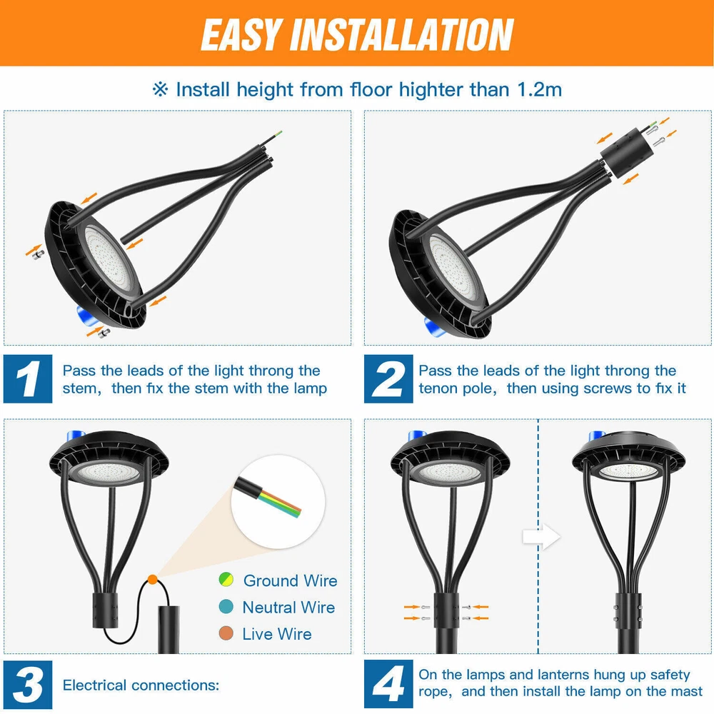 Product Description Dusk To Dawn 80W Led Post Top Lights For Street Garden Pathway Parking lot Road Light Up Larger Area - The 80w light post bring 11200Lm with SMD3030 chips, up to 140lm/watt, AC 100-277V universal voltage and 120°beam angle. 5000K color temperature of lighting is a nice choice for street light illumination. Anti-shock, anti-moisture, no glare, no strobe light, no ghosting, protecting your eyes. Dust to Dawn Photocell - The Led circular post top pole light comes with photocell sensor outside automatically turns ON at sundown/night and light post at sunrise/daytime with dusk to dawn, high power factor >0.9, more than 50000hours lifespan, reduce your electricity consumption, save your electronic bill. Provides a continuous, efficient outdoor lighting environment. Commercial Grade Material - The DLC/ETL Listed post pole light fixture made of die-casting aluminum body + protective glass cover. The scientific design helps the exterior light post top to dissipate better, achieve the best use of the led lighting post. IP65 waterproof for drying, wet environment, sandstorms, snowstorms, and harsh weather conditions. Wide Application - The circular post top design give the lamp a uniform brightness and can be applied to a variety of outdoor scences, such as pathway, street, front yard, city expressway, trunk/rustic road, factories, playground, school, garden, courtyard, parking lot, public park, walkway, exterior, driveway, store, farmyard or any other commercial and industrial area. Installation and Warranty - The pole mount of our post area light fits for a 2 3/8-inch OD tenon & less than or equal to 3 inch standard pole, very easy to install and transfor(Please see the video on the product page for more installation info). KUKUPPO offer you lasting safety and reliability backed by a 5-year warranty. For a bulk order, email us in advance to get a different offer. Rated Wattage: 80W Luminous Flux: 11200Lm Color Temperature: 5000K Protection Grade: IP65 Material : Aluminum Body+Glass Cover Input Voltage : AC100-277V 50/60Hz Dimension: Dia 460x625 mm Base: 2 Pins Wire Power Factor: >90% Beam Angle : 120 degrees Average Lifetime : More than 50000 hours Flexible Installation The pole mount of our post area light fits for a 2 3/8-inch OD tenon & less than or equal to 3 inch standard pole, very easy to install and transfor Commercial Grade Material DLC/ETL Listed quality. Scientific design helps the exterior light post top to dissipate better, achieve the best use of the led lighting post. Durable Support Rod Made of thick aluminum, stable and strong, waterproof and rustproof. High performance quality provides with lasting safety and reliability. Ultra Bright LED Chips With SMD3030 chips, up to 140lm/watt. Anti-shock, anti-moisture, no glare, no strobe light, no ghosting, protecting your eyes. Kindly Note Please note that the light can not be used IN the water. Please confirm the wire connection is right while installing. Maintenance Please pay attention to the dust protection of led post top lights. Please use a rag to stain the water and wipe it in the same direction. ●Don't force it back and forth to avoid damage to the garden lights. ●Don't switch the power switch frequently to avoid unnecessary energy loss. About Us Payment Shipping Returns Contact Us SHENZHEN NUOGUAN TECHNOLOGY CO. LTD founded in 2010. We are high-technology comany specialized in manufacture Commercial and industrial LED light. Advanced production equipment and excellend R&D ability help us to combining service ,production sell together provide top-level products to our customers. 1. Payment is expected within 7 days of auction close. Or Unpaid Items will be forfeited per eBay . 2. Taxes may be applicable at checkout as states adopt new laws and regulations regarding sales tax collection. 1. We ONLY ship to USA . 2. Orders processed within 1-2 business day of payment verification. There’s no Delivery service or courier service on Saturdays, Sundays or Public Holidays. 3. We have 3 different warehouse in US,so due to stock status and time differences, we will choose to ship your item from our first available warehouse for fast delivery. 4. We offer Free Shipping within the Lower 48 states! All packages are sent via UPS or USPS.The delivery time for UPS Ground is typically 2-5 business days. We strive to ensure 100% satisfaction for each and every one of our customers. we offer a 30-day 100% money-back guarantee on all eBay orders. If your item isn't just as you wished, simply send it back to us and we'll refund or replace your item. Please note that all returns must be authorized by our Customer Service department. please contact us though message first if you have any problem. USA Warehouse. Fast shipping! We are appreciated your purchasing form our eBay store. Office Time: 9:30 - 18:30, Monday - Saturday (UTC+8) Please contact us with eBay Message. We will respond you within 24 hours on business day. About Us SHENZHEN NUOGUAN TECHNOLOGY CO. LTD founded in 2010. We are high-technology comany specialized in manufacture Commercial and industrial LED light. Advanced production equipment and excellend R&D ability help us to combining service ,production sell together provide top-level products to our customers. Payment 1. Payment is expected within 7 days of auction close. Or Unpaid Items will be forfeited per eBay . 2. Taxes may be applicable at checkout as states adopt new laws and regulations regarding sales tax collection. Shipping 1. We ONLY ship to USA . 2. Orders processed within 1-2 business day of payment verification. There’s no Delivery service or courier service on Saturdays, Sundays or Public Holidays. 3. We have 3 different warehouse in US,so due to stock status and time differences, we will choose to ship your item from our first available warehouse for fast delivery. 4. We offer Free Shipping within the Lower 48 states! All packages are sent via UPS or USPS.The delivery time for UPS Ground 