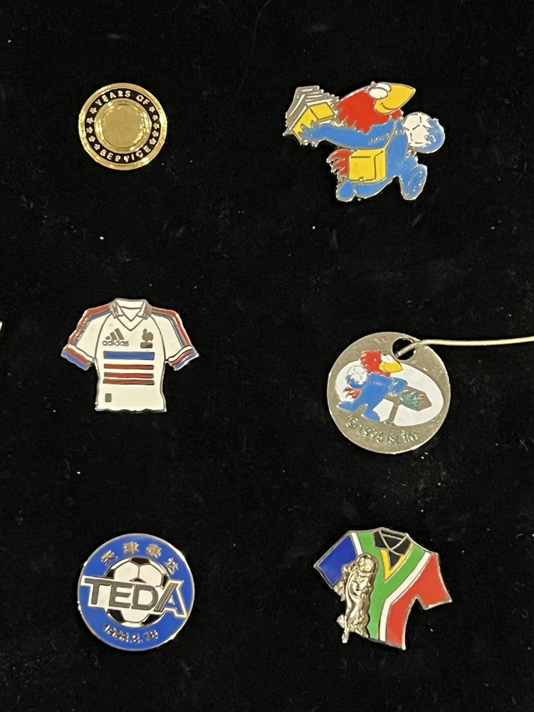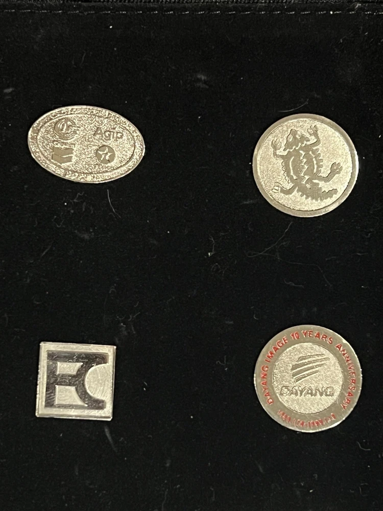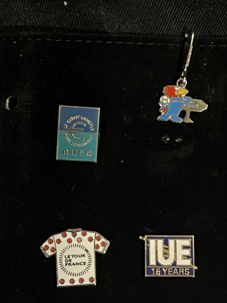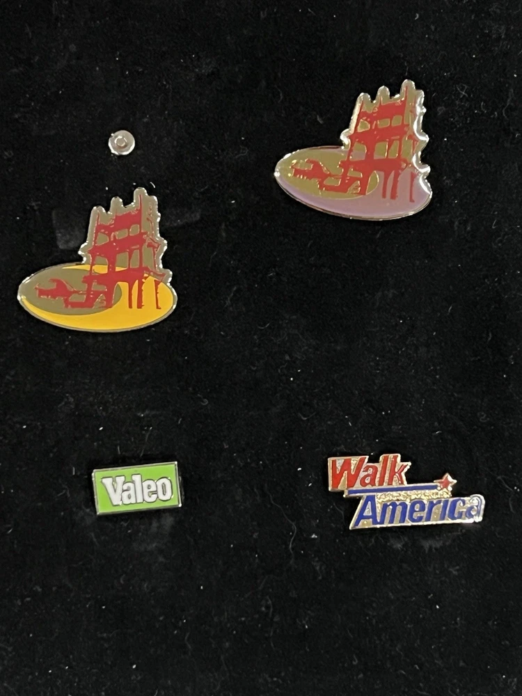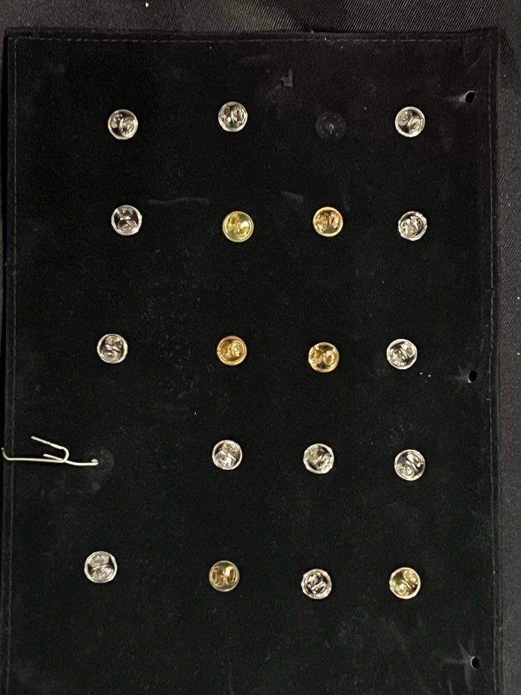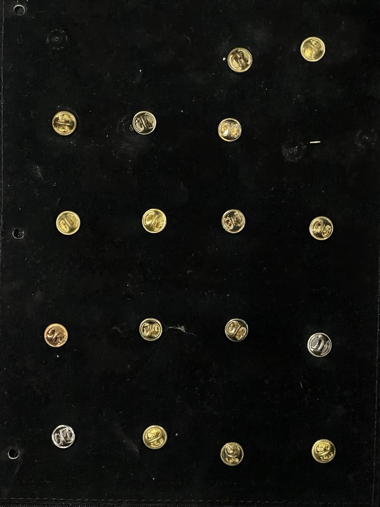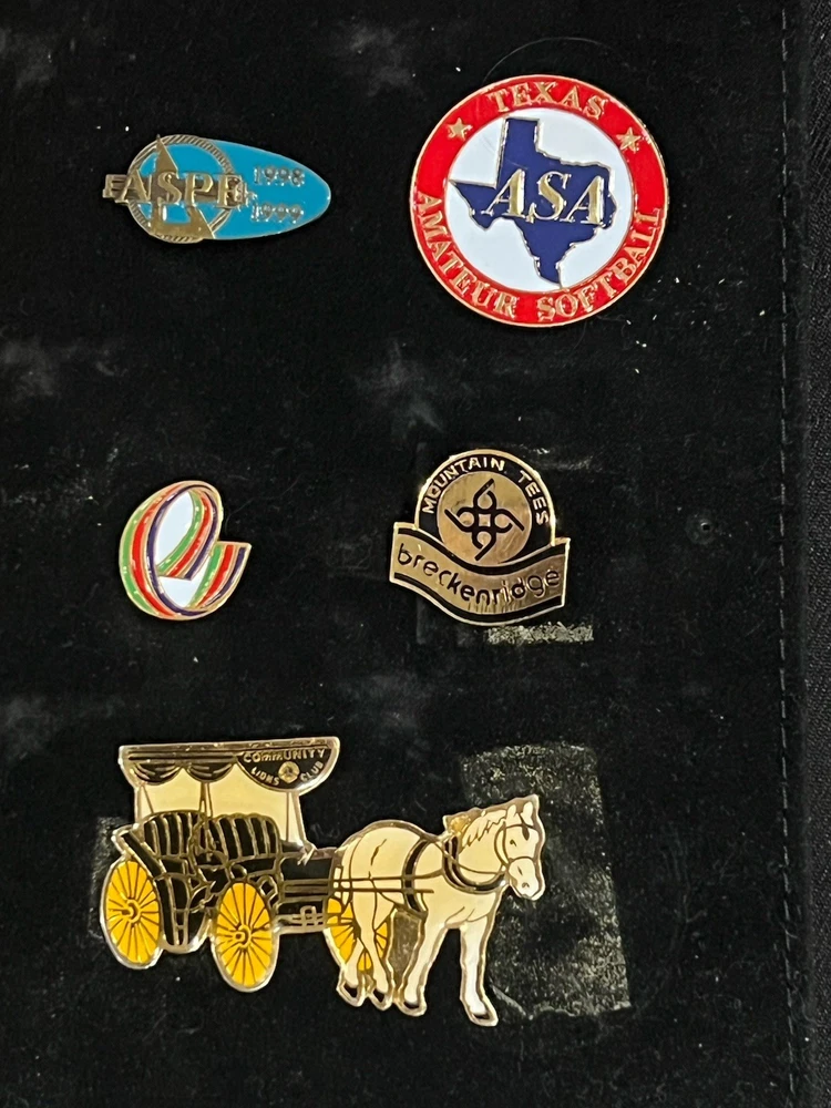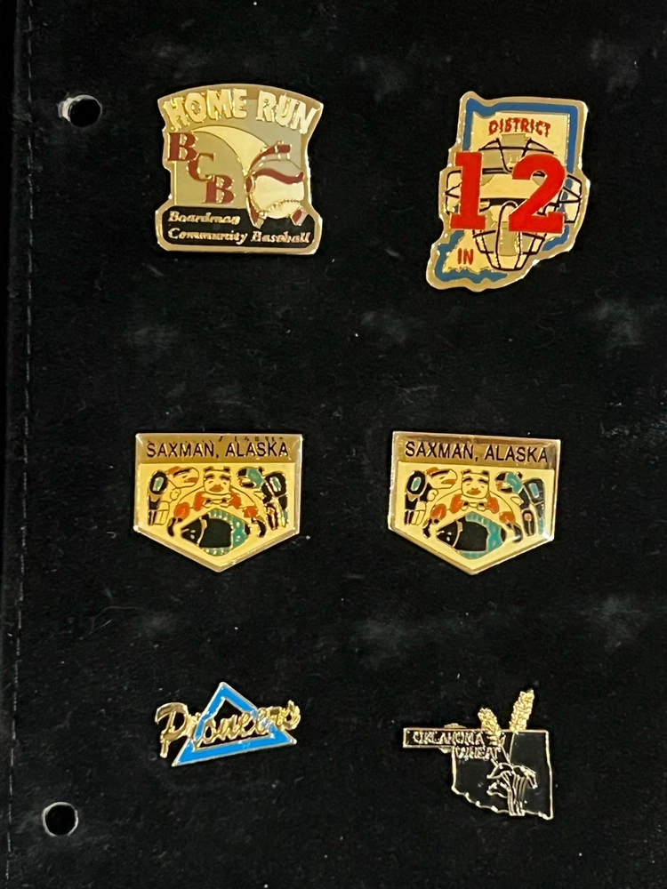 Large 80-piece lapel pin and emblem collection pulled from a manufacturer’s original sample book. Includes a mix of flats, lapel pins with posts, brooch backs, a pendant, and one keychain charm. These pieces were used for client presentations, color tests, production approvals, and internal reference. Many designs were never widely released to the public. What’s Included (80 Pieces Total): • Page 1 (20 pcs): All flats (no posts) — several loose on their adhesive dots. • Page 2 (20 pcs): • 17 standard post-back pins • 2 flats (bottom row) • 1 brooch-style pin (Breckenridge horse & carriage) • Page 3 (20 pcs): • 18 post-back lapel pins • 1 keychain clip charm (Jayhawk-style mascot) • 1 pendant with top loop • Page 4 (20 pcs): • 19 post-back lapel pins • 1 damaged piece (pin face separated from its post; included as-is) Themes Across the Collection: • Corporate & promotional (Microsoft Tech-Ed ’99, Gateway Japan, Safety-Kleen, Valeo, RSVP, Walk America, etc.) • International & travel (Japan Fukuoka Dome ’99, Seibu Dome ’99, Alaska Saxman tribal designs, rugby clubs, European designs) • Sports & event pins (USA Olympics, Ironman, baseball tournaments, district events, marathon/charity pieces) • Colorway & design variants typical of manufacturer sample presentations • Enamel, cloisonné-style, stamped metal, flats, and layered finishes Condition Highlights: • Most pins are clean enamel post-backs with butterfly clutches • Flats show expected light handling wear from sample book storage • One pendant and one charm included • One pin (Page 4, Row 4 Item 3) has detached from its post • Binder page felt/adhesive will show aging • Sold exactly as pictured Great for: Collectors • crafters • resale • repurposing • pin traders • display art • costume designers • prop departments needing period-correct small-format enamel pieces Please see pics for complete description and condition. Thanks for shopping!