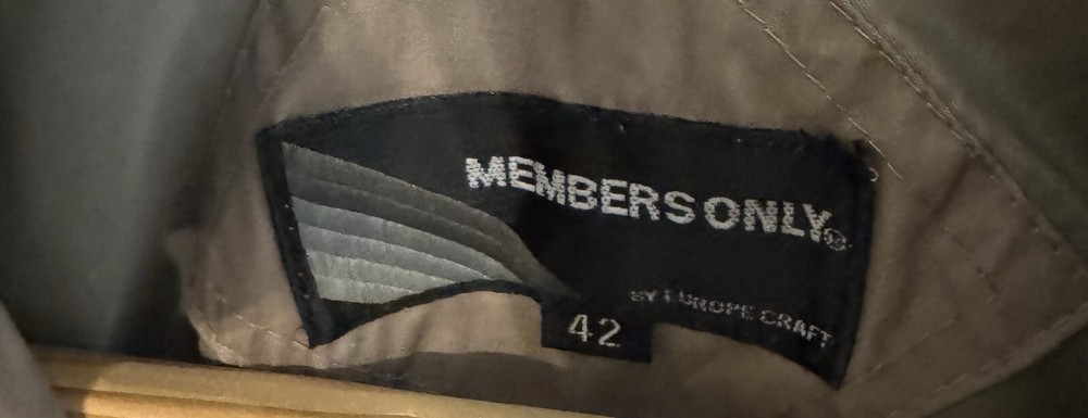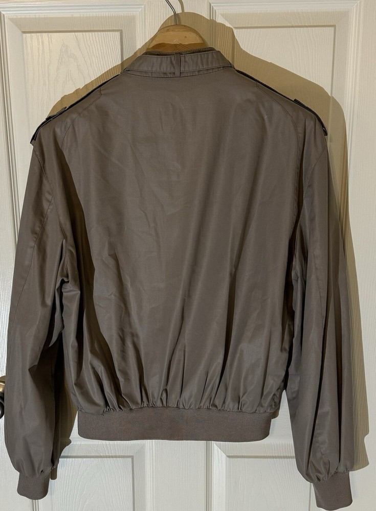 Crafted with a classic aesthetic, the Members Only 80s Bomber Jacket is a quintessential piece for enthusiasts of retro style. Its dark tan khaki color and solid pattern exude a timeless appeal, while the polyester outer shell and nylon lining ensure durability and comfort. The jacket is a size 42, offering a regular fit that's ideal for casual wear or travel. The bomber jacket features a lightweight design, making it perfect for layering during moderate weather. Its iconic 80s theme is complemented by the practicality of a zip closure and zipper accents for an edge of style. Made in Hong Kong, this jacket embraces the spirit of the classic cafe racer look, without the fuss of modern embellishments. There is small tear on the inside above the tag. Please see all of the pictures.