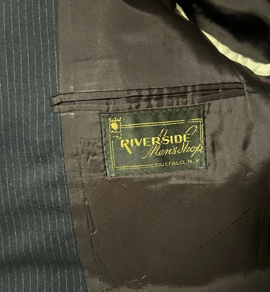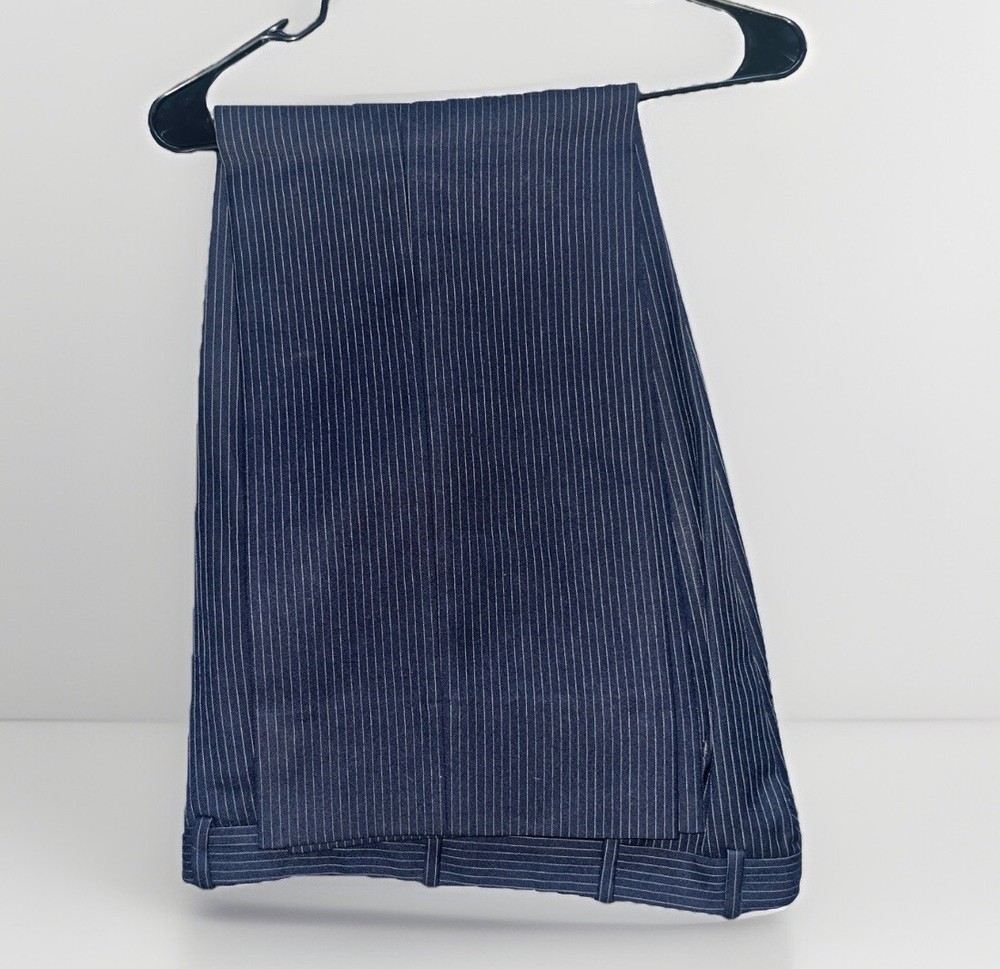 Rare and Sophisticated Piece From Aug 18th 1987. My Husband actually put it on and Not Only Did it Fit him Perfectly, it Literally Made his Person POP! A Beautiful Piece that Turns you into a Model! (Real and Solidly Authentic Wool) Elevate your wardrobe with the timeless sophistication of the 80's Vintage Men's Blue Wool Pinstripe 2 Piece Suit from Riverside Men’s Shop New York. The classic fit ensures comfort without compromising on style, featuring a single-breasted design that adds a touch of elegance to any ensemble. Crafted from high-quality wool, this suit boasts a striking blue hue with a subtle striped pattern that exudes a sense of refinement. Ideal for various occasions, the two-piece set, sized at 40 Regular with a W34, offers a seamless blend of function and fashion, making it a must-have for the discerning gentleman's collection.