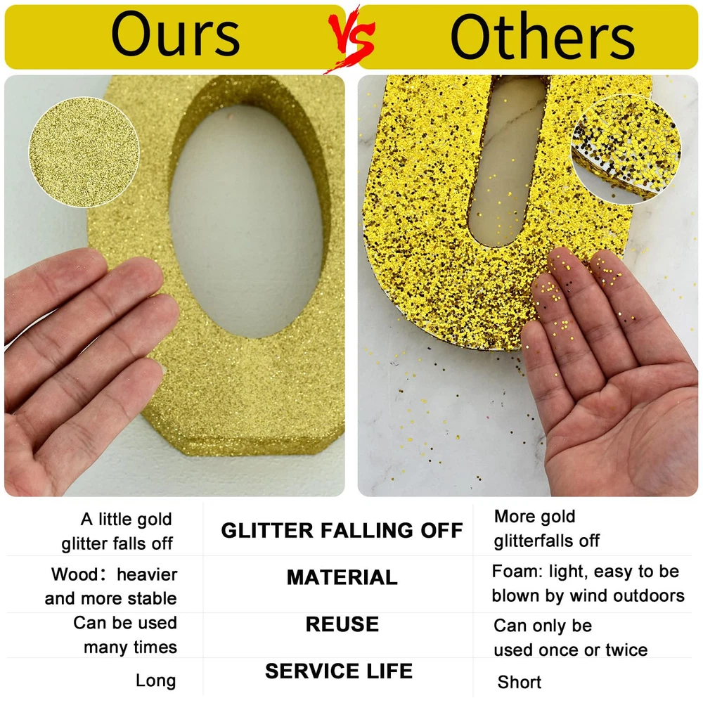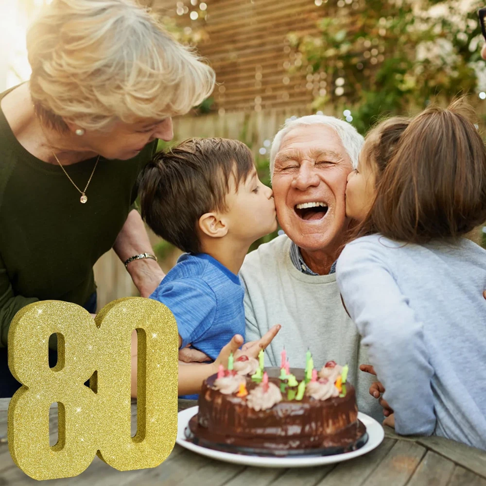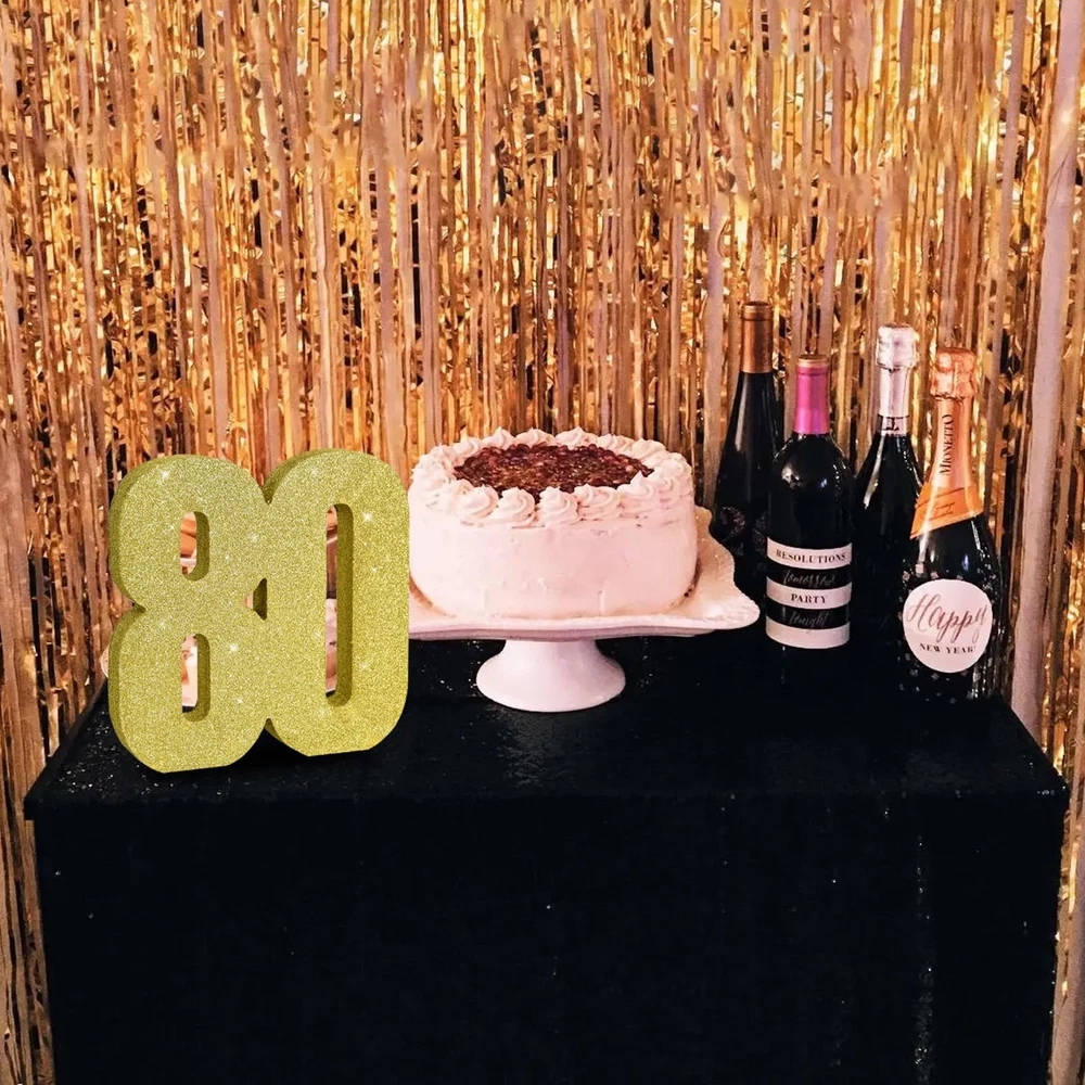 Product informatio 1*80 gold glitter number decoration. Size: 20*20*3CM.(7.8*7.8*1.2 Inch) Exquisite design The appearance is made of fine golden glitter, and the "80"-shaped wooden decoration is fully wrapped 360 degrees. When light hits it, it reflects and glows, attracting everyone's attention.This is a great party decoration. The shining points twinkle like the charming starry sky. Usage scenario Suitable for 80th birthday party, 80th anniversary party, 80th anniversary celebration party. Especially used during the day when there is strong light or at night when there is light. It will brighten up your party. Advantage All-in-one product design, no assembly required. You just open the package and place it where you want to decorate and add to the party atmosphere. The items compared with other products, the powder falling off phenomenon is relatively small. It won't cause problems for your party. ITEM INFORMATION AND SIZE: 1 Pcs * 80 Gold Glitter Number Ornament. Size: 7.8 * 7.8 * 1 inches (20*20*2.5cm). Before purchasing, Please check the size carefully to make sure it meets your needs PLEASE NOTE: Adorned with gold glitter powder, this item beautifully reflects light and is perfect for party decorations. However, please note that due to the use of glitter powder in its craftsmanship, a small amount will fall off. This is normal and should be expected. Therefore, please take care to keep other items free from the powder HIGH QUALITY: The item uses high-quality wood and glitter powder, and the texture is great. Compared with other item, the phenomenon of powder falling off is relatively minor. It won't ruin your party EASY TO USE: The integrated design of the product requires no assembly. You only need to unpack it and place it where you want to decorate, adding to the party atmosphere USAGE SCENARIOS: This Gold Glitter Number Centerpiece is a Great Party Decoration for Birthday,Halloween,Thanksgiving,Christmas,Valentine's Day,2025 Graduation,Birthday,Wedding,Bridal Shower,Bachelorette,New Year Eve,Halloween,Christmas,Independence Day,Father's Day,Mother's Day or Other Party Occasions
