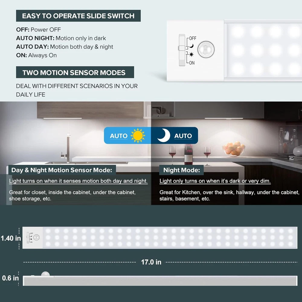 84 Super Bright LEDs: This LED light emits 220 lumens of 6000K clean white light from 84 super bright LEDs; LEDs emit no harmful rays and very little heat, perfect for closet, cabinet, kitchen, stairs, wardrobe, attic, basement, cupboard, drawer, emergency supplies storage room, garage, mailbox, medicine cabinet, gun safe, storage unit, vanity mirror, ceilings, wall, roof. Long Lasting Battery: Equipped with a 3200 mAh rechargeable battery; each charge lasts up to 120 days with 10 times a day usage of 20 seconds each time, providing 2 times longer battery run time. Intelligent Motion Sensor: Features ON/OFF/AUTO NIGHT/AUTO DAY & NIGHT 4 modes slide switch; BLS Constant-Sense technology allows it to constantly pick up motions, staying on as long as you are nearby and automatically turning off 20 seconds after you walk away. Easy Cordless Installation: With a built-in strong magnet and premium quality 3M adhesive sticker, this under cabinet light can be easily installed and detached for charging; it can be mounted on any iron surface like refrigerator, shelf, storage rack, etc. 30 Months Warranty: Comes with 30 days money back guarantee and 30-months hassle-free replacement warranty for a low-carbon life. Product Description Are you tired of indoor motion sensor light with iffy motion sensor? Are you tired of draining Alkaline batteries or keep charging your battery light every two days? Do you want a rechargeable motion sensor light with better battery life? The BLS T36-17" Ultra Thin Sensor Lights Indoor is created for you. It’s built with large rechargeable battery that provides excellent battery life and high quality 3M adhesives, reliable motion sensor, built-in magnets and more. ULTRA LONG BATTERY RUN TIME This battery operated light is equipped with 3200 mAh rechargeable battery. Each charge last up to 120 days (Use it 10 times a day, 20 seconds each time), 2 times battery run life of other similar LED lights! ) No need to purchase batteries, save you time and money! SMART MOTION SENSOR LIGHT WITH CONSTANT-SENSE The two motion sensor modes are suitable for different scenarios in your daily life: 1.AUTO DAY & NIGHT / Day & Night Motion Sensor Mode: Light turns on when it senses motion both day and night. Great for closet, inside the cabinet, under the cabinet, shoe storage, etc. 2.AUTO NIGHT / Night Motion Sensor Mode: Light only turns on when it’s dark or very dim. Great for Kitchen, over the sink, hallway, gun safe, under the cabinet, stairs, basement, etc. EASY TO INSTALL The light has built-in strong magnet, installation takes a few seconds with the provided 3M Sticker. Easily attached to and detachable from the magnet plate with 3M sticker. Premium quality 3M adhesives stick firmly, will not damage your furniture. This LED light can be also be attached to any iron surface, eg. Refrigerator, shelf, storage rack, etc. No wires, tools, screws or nuts are required. Different Applications: Suitable for different places, bring safety and convenience to you and your family! Closet Light Specification: LED: 84 Rechargeable Battery 3200mAh Timer: 20 senconds with constant sense Package Includes: 1 x 84-LEDs motion sensor lights 1x Magnet Plates with 3M Adhesives 1 x USB charging cable 1 x Manual Kitchen Light Different Applications: Offer Extra Lighting for Anywhere in Your Home: closet, kitchen, sink, cabinet, gun safe, bedroom, wardrobe, workshop, kitchen cupboards, bookcase, shed, garage, hallway, stairway, laundry, drawers, steps etc. Night Light Our Brand: At BLS, we strives to make the best Closet Light on earth. Bring safety and convenience to you and your family! We provides 100% satisfactory after-sales service and lifelong quality support for all BLS products! Purchase now and enjoy your low carbon life with us.
