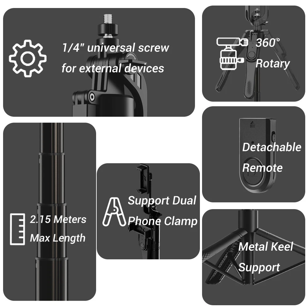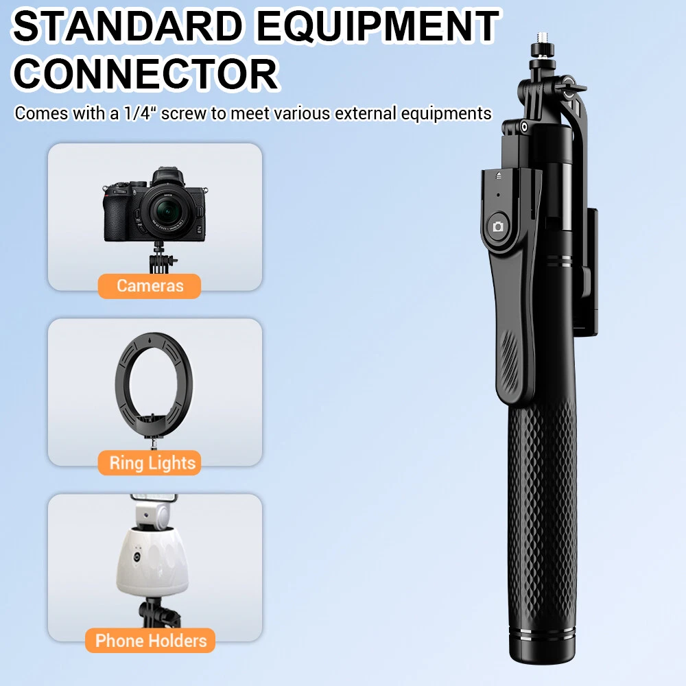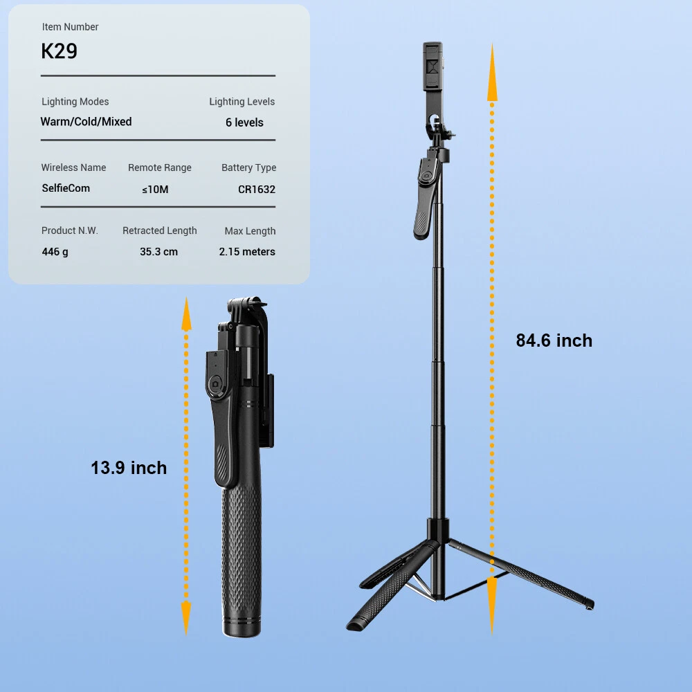 Meinuousa Your Best Online Business Partner 40" Portable Wireless Selfie Stick Remote Tripod Phone Stand For Iphone Samsung About this item 【3 Legs Design Selfie Stick Tripod 】Our selfie stick tripod have great stability and user experience when taking photos/videos. The upgraded 3-point support, combined with the metal ribs of the base and the aluminum alloy telescopic rod, provides better balance and load-bearing capacity than ordinary tripods. 【360°Rotating Balance Grip】The selfie stick supports 360° panoramic shooting and 180° up and down shooting, allowing you to capture the perfect panoramic shooting effect. 【Balance Handle and 1/4 Screw,】have a Balance Handle.and 1/4 Screw, You can also mount an action camera or ring light, making it not only a tripod for your cell phone, but also an action camera/ring light stand. 【Remote Shutter】Free your hands and enjoy taking photos remotely with the selfie stick tripod with remote control. It can maintain a stable connection at a distance of up to 33 feet/10 meters and is compatible with most smartphones such as Android and iPhone. 【Portable and Compact Design】 Compact design, can be carried around without taking up much space. Our selfie stick easily extends from 14"/353mm to 84.6"/2150mm, longer than similar tripods on the market. No need to twist or lock, it can be extended at a specific height to meet different shooting needs. 【Wide Compatibility】The retractable tripod can be used as a grip, selfie stick or gopro tripod, mini and lightweight. The tripod cell phone holder has a mounting range of approximately 2.36-3.54 inches in size for 4-7'' cell phones. Our selfie stick is designed to solve the common pain points of traditional selfie sticks, such as shaky shots and limited range of motion. 【Base Non-Slip】 Upgraded Non-Slip base can help you capture every precious moment even on smooth floors and glass tabletops. Specifications: Lighting mode: Natural Light/Warm Yellow Light/Cool White light Lighting gear: 6 levels adjustable Product net weight: 446g Remote control distance: 10M Battery model: CR1632 Stretch length: 2.15 meters Storage length: 35.3cm Compatible with iPhone 13,13 Mini,13 Pro,13 Pro Max,12,12 Max,12 Pro,12 Pro Max,11 Pro Max, 11 Pro, 11, Xs, Xs Max, X, 8, 8 Plus, 7, 7 Plus, SE, 6s, 6s Plus, 6, 6 Plus, 5S, 5C, 5, 4s, 4; Samsung Galaxy S20, S10, S10+, S9, S9+, S8, S8+, S7, S7 Edge, S6, S6 Edge, S5, S5 Mini, S4, S4 Mini, Note 9, 8, 7, 5, 4, 3, 2, and more Android phones. Package Include: 1x Phone Tripod 1x Bluetooth Remote Shutter 2x Fill light 1x user manual Payment Shipping Returns Contact Us About US - We accept the payment through :Credit, debit, and gift cards, Apple Pay, Google Pay, PayPal, and PayPal Credit. - Payment must be fulfilled within 4 days after the end of auction. - Please make sure your ebay address is correct. Or not, please correct it before payment. - If you are a big customer, Please contact with us about the item's PRICE and SHIPPING. - Your feedback & suggestion is deeply appreciated, thanks. 1. Please make sure your address in ebay is correct. 2. We will only follow your address listed in the ebay orders for the shipment. 1. We can exchange the item within 30 days after you received it if it is defective. 2. Returned item must have all original packaging and accessories. 3. Buyer are responsible for the returning shipping costs. 1. We greatly appreciate your POSITIVE feedback. 2. Negative or Neutral feedback does not resolve any underlying issues that you may be experiencing as a buyer. 3. Any question or unsatisfaction please contact us with ebay message, we will sincerely solve for you. Feedback is very important to us, if you are satisfied with us, please leave us 5 star positive feedback to us. If you h have any problem, please contact us first BEFORE you give us neutral or negative feedback, so we can try our best to help you solve your problem. All rights reserved.