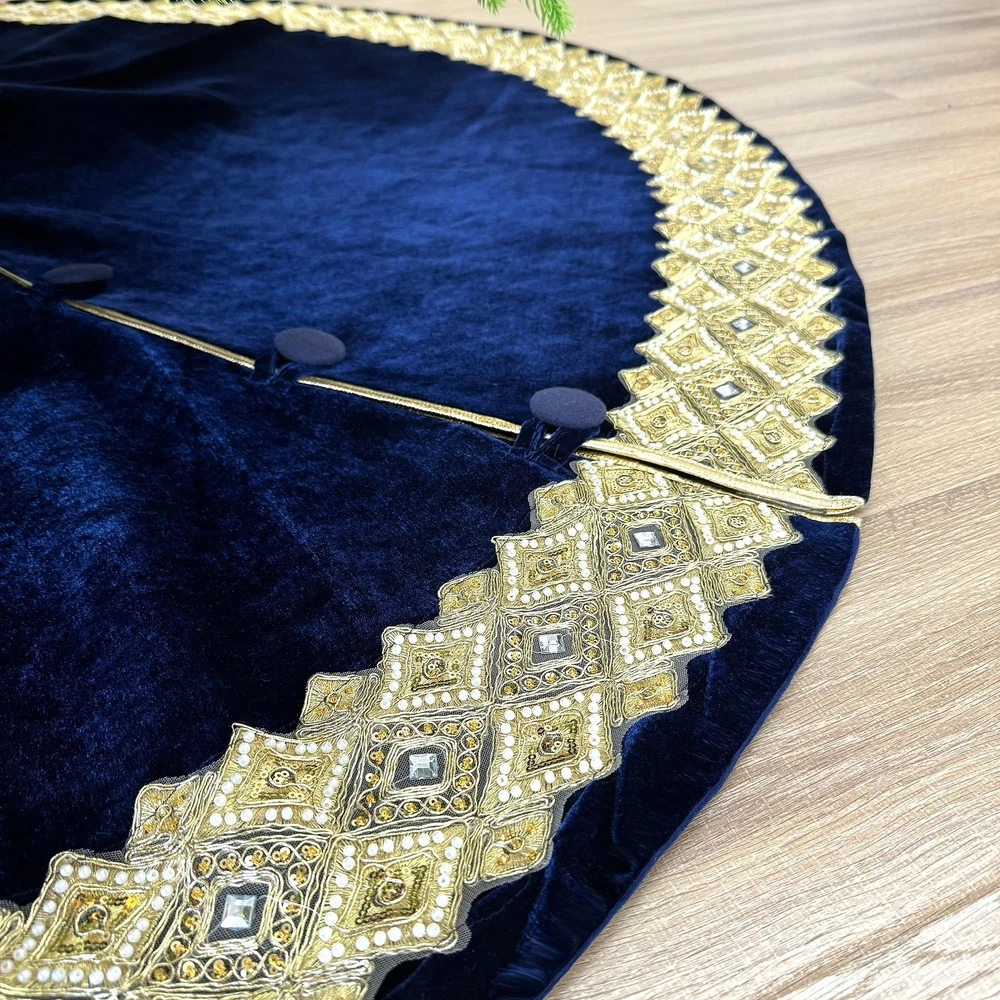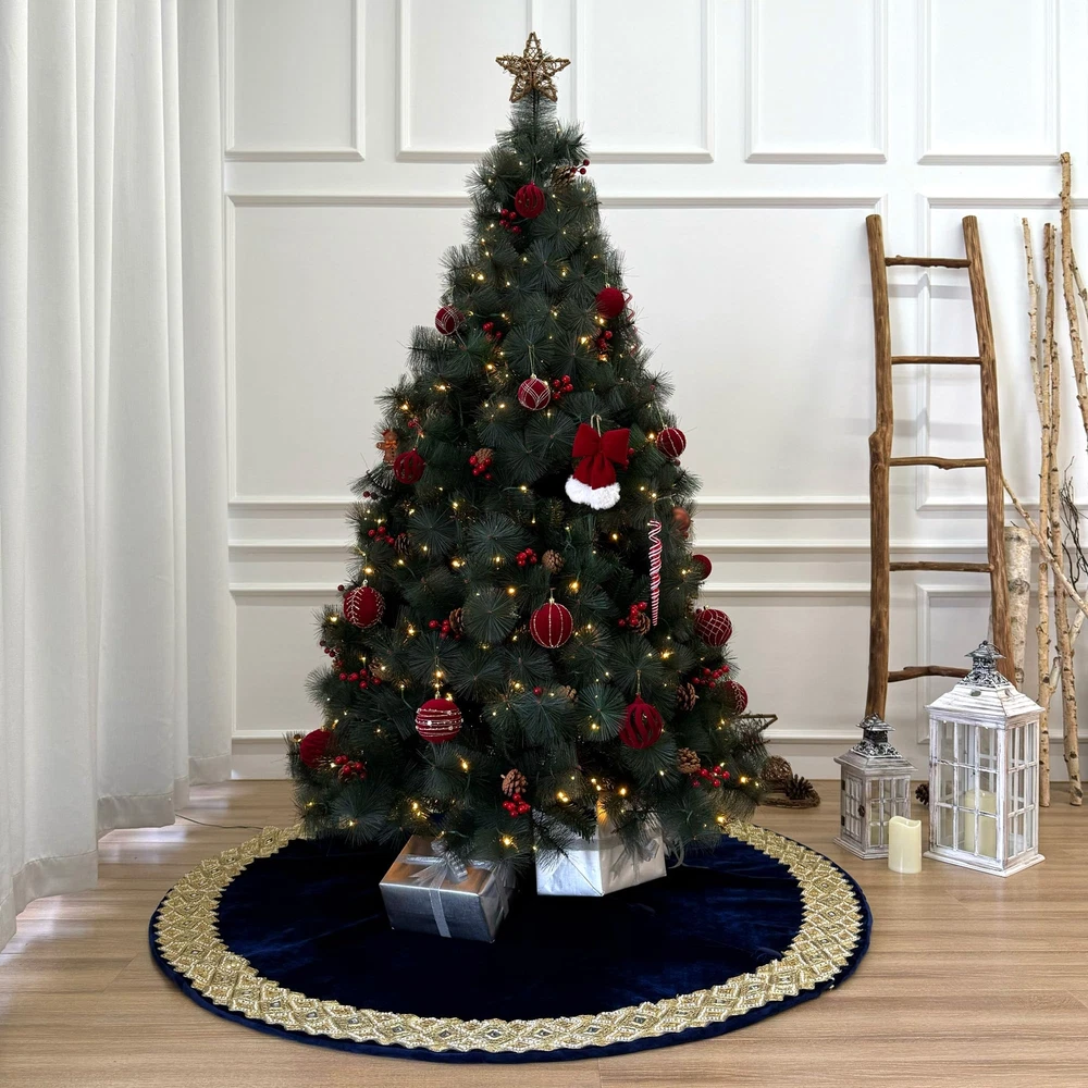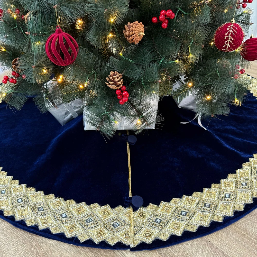 : Excellence in Festive Dรฉcor Welcome to Brought to you by Lit Ambition LLC, an American small business based in Laguna Beach, California. Since 1997, we've been a beacon for exquisite Christmas tree skirts and stockings. Every piece we craft echoes our deep understanding of holiday decoration desires, merging superior materials with time-tested craftsmanship. Our Commitment: - 24/7 US-based customer service - Rigorous quality checks on each product - Pledge to address any defects or shipping damages - Ethical manufacturing through partnerships adhering to amfori BSCI principles, ensuring fair wages and safe work environments for all. ๐ Gilded Splendor: Crafted from lustrous velvet, this extravagant tree skirt features a wide border adorned with a jeweled gold band. The band sparkles with mirrors and faux gemstones, creating a captivating display when illuminated by your tree's lights. Its timeless elegance makes it the perfect complement for Renaissance-themed or similarly opulent Christmas decorations. ๐ Grand in Scale: Measuring a generous 84 inches, this tree skirt gracefully adorns 8ft and taller trees, making it the ideal choice for grand setups seeking an equally impactful tree skirt. While many manufacturers compromise on size, our expertise guarantees impeccable quality for tree skirts of this grand scale. ๐ Easy On/Off Button Loops: Round, oversized cloth-covered buttons perfectly match the grandeur of the tree skirt. The 60" tree skirt includes 3 buttons, while the 72" and 84" versions each comes with 5 buttons. Easily secure the tree skirt around your tree base with its button loop closure, elegantly concealing the tree stand and wires underneath from view. ๐ Button Loop Closure: Three sets of oversized round buttons and matching loops make it simple to secure the tree skirt around the base, elegantly hiding the tree stand and wires underneath from view. Dressing your tree will feel like adorning it in fine attire. ๐ Care Instructions: Spot clean only. After the holidays, conveniently store the skirt in the included zip-up bag and box, keeping it pristine for seasons to come.