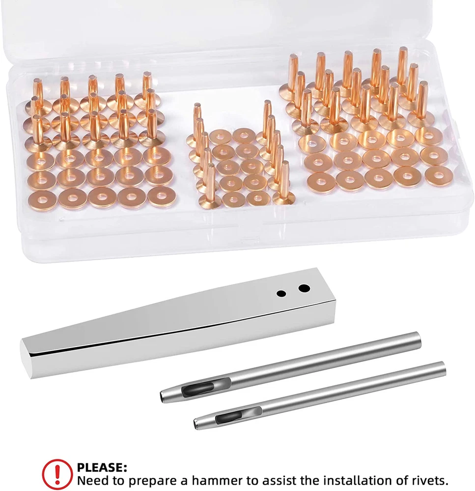 [Unbelievable! 40 Set Solid Copper Rivets and Burrs for Leather] Totally 40 rivets and burrs set: 15 x copper rivets and burrs(11mm x 4mm x 19 mm), 15 x copper rivets and burrs(11mm x 4mm x 14.5 mm), 10 x copper rivets and burrs(10mm x 3.4mm x 19 mm), 1 x 2 IN 1 rivet and burr setter is used for both size 9 and size 12 burrs rivet. 2 x leather hole punch cutters(Dia. 3.5mm and Dia. 4mm). [Stunning Size 9 and Size 12 Copper Rivet Fastener Install Setting Tool and Extra Dia. 3.5mm and Dia. 4mm Precision Round Leather Hole Punch] 2 IN 1 Stainless steel heavy duty setter, one tool can install the rivets in No. 9 Size, No. 12 Size. Bigger convenient and higher efficient. Size: 4.7"x 0.79" x 0.43"(L x W x H); 2Pcs Heavy-duty permanent round hollow hole punch cutters, quenching treatment, more rigid and durable. [In Less Than Few Mintues, Make A Nice Finished Rivet, Enjoyed The Happiness Brought By Leather Craftsmanship] Whether you are a hobbyist of leather crafts or a professional, it is worth having the copper rivets kit, which is EASY to operate and QUICK to install. Don't worry about installation failure. [More Quantity & It Is Far More Cost-effective, 40 Set, 2 Lengths, 2 Sizes Copper Rivets for Leather] 40 x Rivet and burr set, more quantity than the other market ones. Two lengths in 19mm and 14.5mm, two sizes in tube diameter 4mm and 3.3mm, and the most commonly used copper color, perfectly meet your daily needs, and bring you more fun with leather crafts. [Large Range Of Applications, This Exquisitely Leather Craft Kit Is Not To Be Missed] Good rivet tool set bring you more happiness. Leather tools for art manual crafts, leather repairs, rivets for leather, jeans, keychain, bag, strap, purse, belts, wallets, collars, shoes, boat canvas and so on. Really nice leather working kit. Product Description JUNESunShine Copper Rivet and Burr with 2 IN 1 Stainless Steel Burr Setter, Round Punch Cutters Ideal for: leather DIY, leather crafts, leather repair, tack repairs. Great for embellishment or strength, leather reinforcement. Use on: leather belts, halters, bridles, purses, handbag, backpacks, bags, bracelets, leather-crafting, leather ornaments, canvas and so on. What is the reason for choosing JUNESunShine copper rivets w/ setter? SAVE: Luxury matching, 40 sets of copper rivets, 1pc heavy duty 2 IN 1 stainless steel burr setter, 2pcs leather hole punch cutters. Large quantity, high cost performance. NO WORRY: We have specially matched the materials needed for red copper rivet installation. Customers only need to prepare the hammer and rivet plier. No need to spend extra time shopping for accessories. EASY: Very simple installation method. There are pictures of installation instructions on the product list. Please take a few minutes to browse it. QUICK: Within a few minutes, customers can quickly install rivets. Please: The copper rivet and burr setter kit is specially matched by JUNESunShine, and it takes time for manual sorting and packing. The red copper color is bright. When people concentrate on 2 to 4 hours of sorting and packing work, the eyes may be a little tired; If you receive the copper rivets and find a defect or any problem, please e-mail us, we will provide the good solution; What's in the package? 15 set copper rivet and burr (Shaft: 5/32"(4mm). Length: 3/4"(19mm). Head cap: 11mm); 15 set copper rivet and burr (Shaft: 5/32"(4mm). Length: 9/16"(14.5mm). Head cap: 11mm); 15 set copper rivet and burr (Shaft: 0.13"(3.4mm). Length: 3/4"(19mm). Head cap: 10mm); 1pc #9 and #12 stainless steel burr setter; 1pc hollow punch (Dia. 3.5mm); 1pc hollow punch (Dia. 4mm)