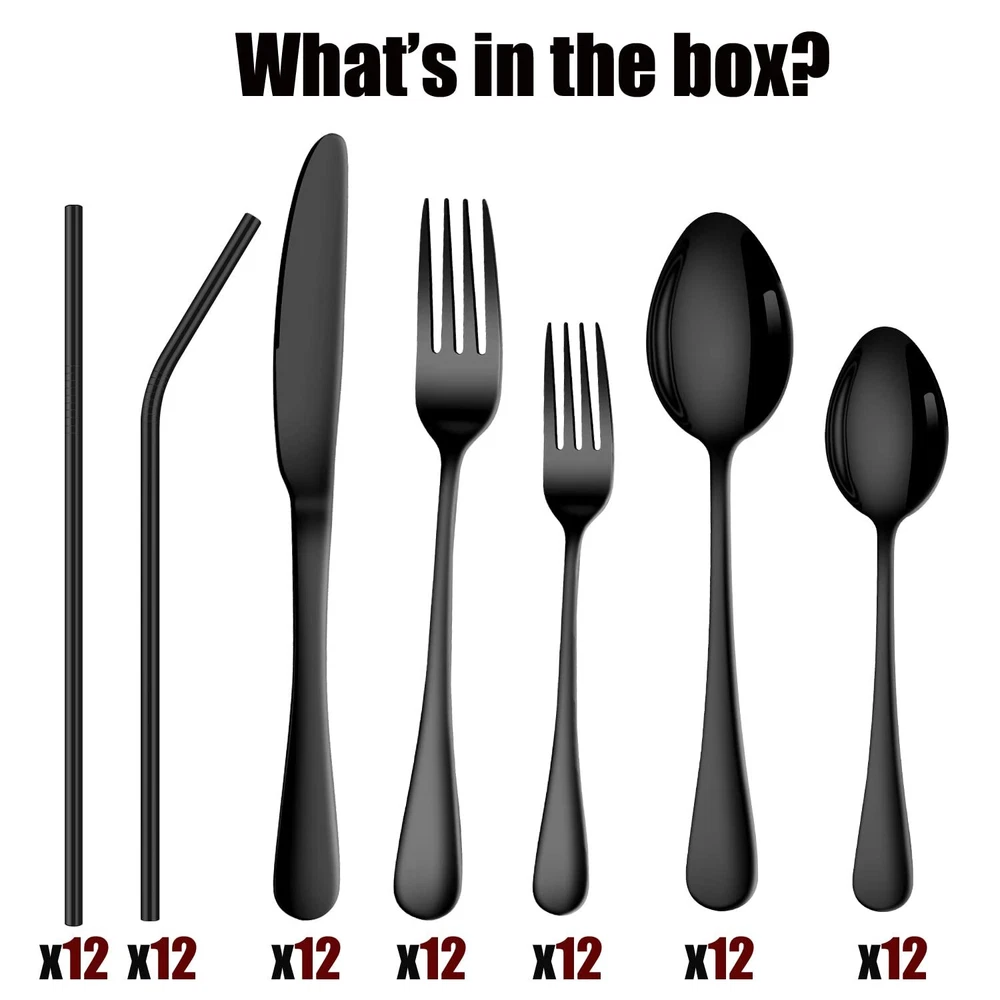 The perfect silverware set to expand your cutlery set collection with or gift to someone as a birthday, Christmas, or wedding present. This 84-piece flatware set includes 12 knives, 12 cake forks, 12 dessert forks, 12 teaspoons, 12 dessert spoons, 12 straight straws and 12 bent straws, the right fit to dine a party of twelve. These kitchen utensils are made of premium stainless steel, designed to last for many years with proper care. This all-in-one apartment essential cutlery set will take away the stress of home accessory shopping while adding style and elegance to your kitchen decor. Ideal for any family gathering, party, restaurant, hotel, or wedding, this silverware cutlery set is fit for residential and commercial use, or to a sparkling touch to any special occasion. Ergonomically designed kitchen utensils, they are easy to hold and fit the way we naturally eat to avoid any discomfort. Best of all, this high-quality utensil set is dishwasher safe for quick and hassle-free cleanup. Stylish and durable design - this silverware set is crafted by superior quality rust-resistant stainless steel, strong enough to withstand the rigors of everyday use; these kitchen utensils are also easy to maintain and made to last. 84-pieces of flatware included - this cutlery utensil set features 12 knives, 12 cake forks, 12 dessert forks, 12 teaspoons, 12 dessert spoons, 12 straight straws and 12 bent straws; perfect to host an elegant dinner party of twelve or for use in a hotel, restaurant, or dinner. Dishwasher safe - this tableware flatware set is dishwasher safe, making clean up after dinner quick and easy by simply loading after use in the dishwasher; with proper care, this utensil set will always look as good as new, and last for many years. 100% stainless steel - made from only premium stainless steel without any included toxic materials or chemicals, this utensil set is both safe to use and charming; this kitchen cutlery set offers a classic modern design that will match with any kitchen decor. Perfect for any occasion - this flatware set offers you multi-use options, the perfect cutlery set to use at a wedding, Christmas party, restaurant, or family gathering; the perfect house-warming, birthday, or anniversary gift.