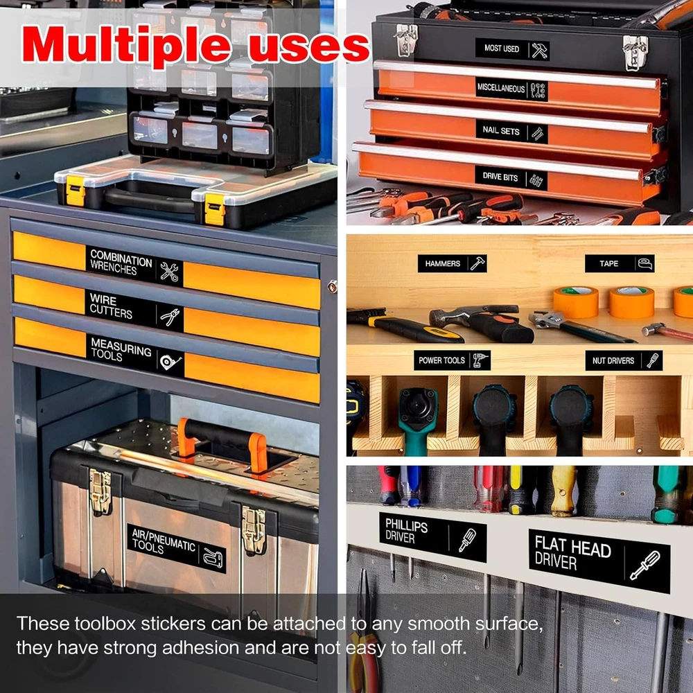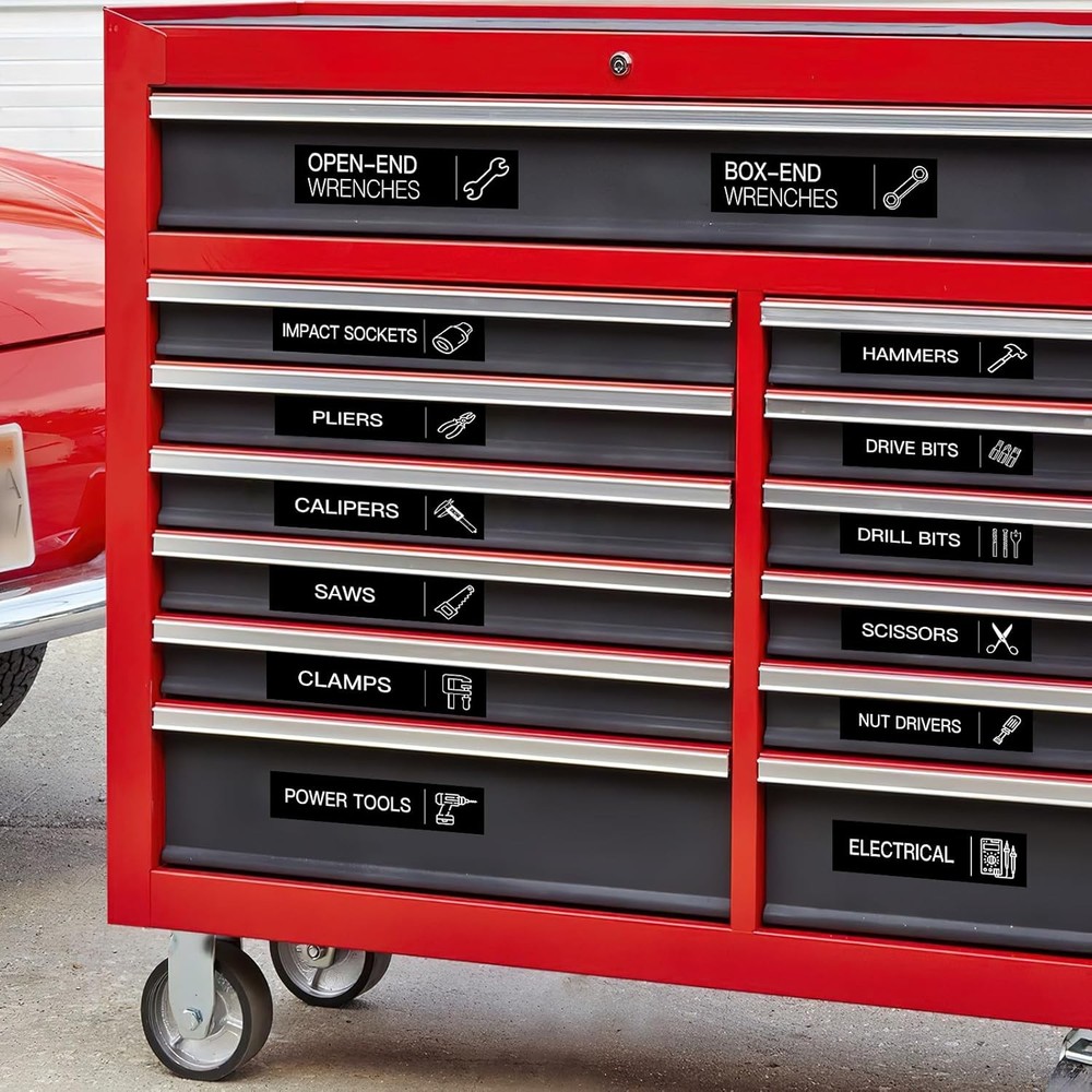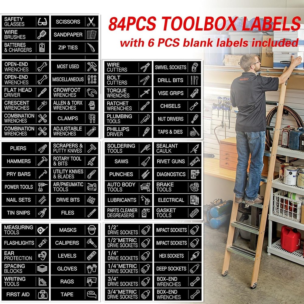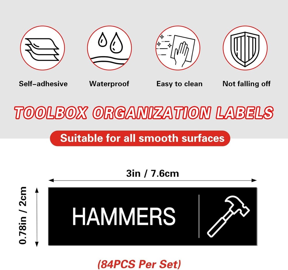 84 PCS Toolbox Organization Labels,Removable Tool 3 x 0.79 Inches, Black Product Details Manufacturer: HVSWLY Brand: HVSWLY Item Weight: 1.34 ounces Product Dimensions: 3 x 0.79 x 0.03 inches Item model number: TCD-90 Color: Black Shape: Rectangular Material Type: Plastic Size: 3 x 0.79 Inches Manufacturer Part Number: TCD-90 Color: Black Size: 3 x 0.79 Inches Material: Plastic Brand: HVSWLY Shape: Rectangular 【Package Includes】: You will receive 84 pcs black toolbox labels, including 78 labels already printed with tool names and tool pictures, and 6 blank labels that you can use to write the name of your own special items. Size: 3 x 0.79 inches. 【Premium Quality Material】: Our tool chest labels are made of waterproof smooth layer self-adhesive material, smooth surface, tear-resistant, good adhesion, won't peel off, can be stuck to any clean and smooth surface. 【Easy to Read】: These tool box accessories are exquisite designed, clear printing, beautiful fonts, easy to read. There are also various tool patterns printed on the label, which makes your toolbox look more professional and makes it easier for you to use it. 【Good Helper for Tool Organization】: With these tool box labels, you can quickly identify which tools are in which drawer, can save a lot of time to find and organize. Even when your family or friends use tools, they know to put them back in the correct position. 【Wide Application】: These toolbox stickers are not only suitable for metal toolboxes, but also for toolboxes made of stainless steel, aluminum, wood, plastic and other materials. Make your toolbox more tidy and make your life much easier. You will never be bothered by not being able to find your tools again.