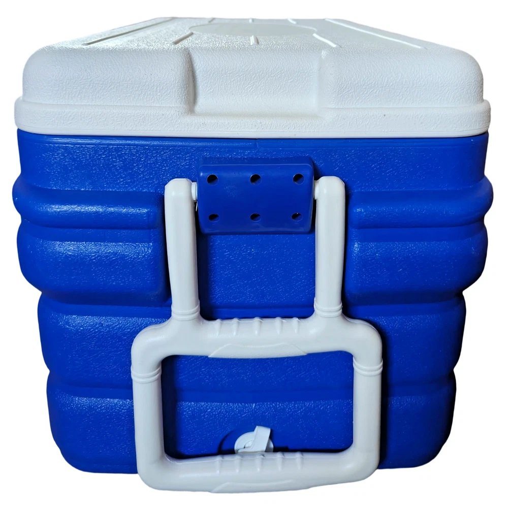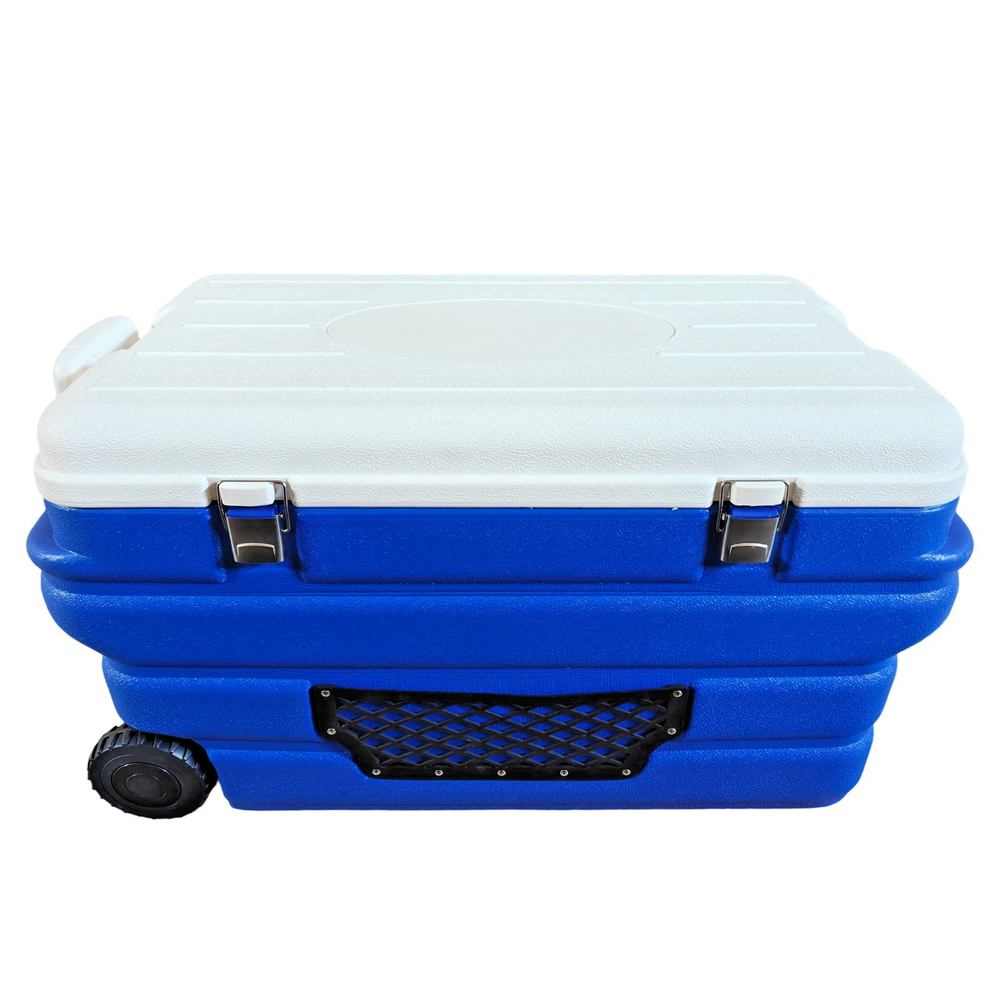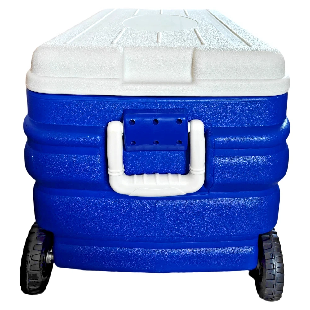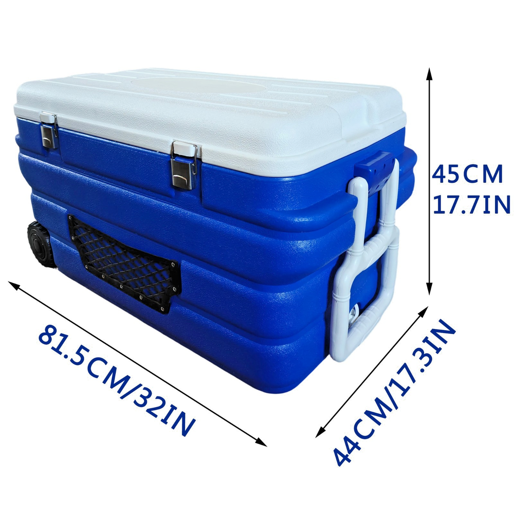 The 84-Quart Large Blue Plastic Cooler with Wheels is a versatile and durable option for outdoor activities such as camping, beach trips, fishing, traveling, and hiking. With a maximum insulation time of 72 hours and a capacity of 84.5 quarts, this ice box is perfect for keeping drinks and food cold for extended periods. The three compartments, portable design, and passive refrigeration type make it convenient for use in various settings. Made of lightweight yet sturdy plastic, this cooler weighs 27.6 lbs and features a matte finish, making it both practical and stylish for any adventure.