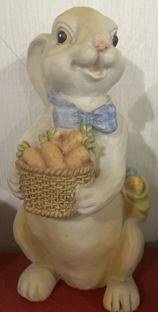 Brand: Unbranded Color: White w Multicolor trim Material: Resin? Item Length: 8.5 in Occasion: Easter / Spring Type: Figurine Theme: Spring and/or Easter Size: 8.5" high x 4.5" wide