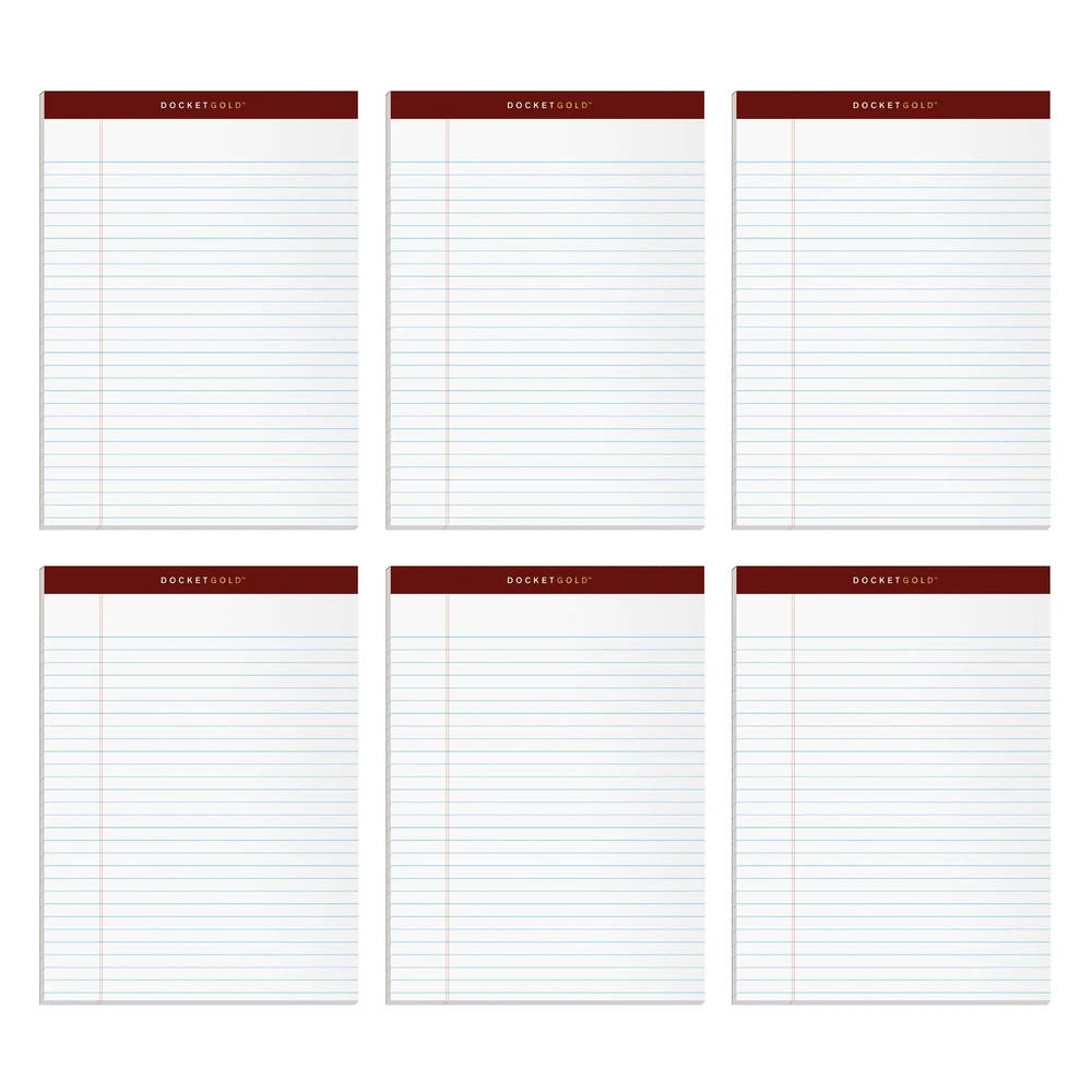 Docket Gold legal pads are a step up from your average legal pad. The thicker, higher-quality paper prevents ink bleed through and is smoother than standard paper. The backer is also twice as thick, making it less bendable and easier to write on when you're away from a desk or table. Docket Gold legal pads are made in America—manufactured in Covington, TN. You'll get 6 letter size legal pads, each with 50 sheets of white paper. Each sheet is perforated, so you can always remove it cleanly and start notes on the next page. These legal pads are wide ruled, also known as legal ruled (11/32" spacing between lines) so you can write a little larger. Each legal pad is 8.5 x 11.75 inches overall, and each sheet tears out to letter size (8.5 x 11 inches). The front of the page and the back of the page are the same. These Docket Gold writing pads are a professional choice for meeting notes, general notes, legal notes, and more. Stock up on a 6 pack of 8.5 x 11 legal pads; each white legal pad has 50 perforated, wide ruled sheets Docket Gold is a premium brand of legal pads; the chipboard back is thicker than your standard legal pad and the paper is a heavier weight to prevent write-though These legal pads are proudly made in the USA; all Docket Gold professional writing pads are manufactured in Tennessee The overall dimension of each pad is 8.5" x 11.75"; each perforated sheet tears off to letter size (8.5" x 11"); pages are wide rule for larger, more legible writing The premium paper and extra-sturdy backer is ideal for a professional environment; from legal notes to meeting notes, these Docket Gold legal pads are above the standard