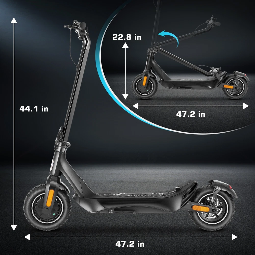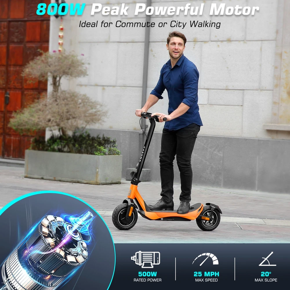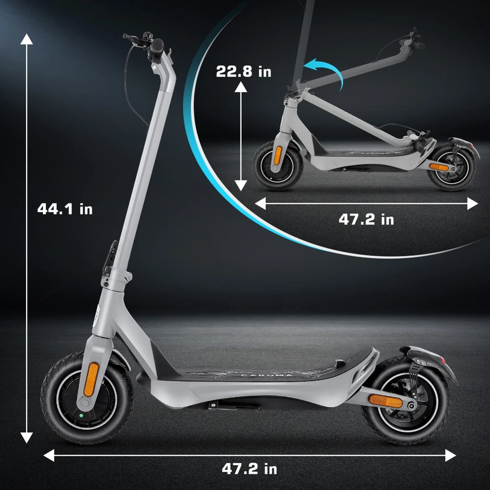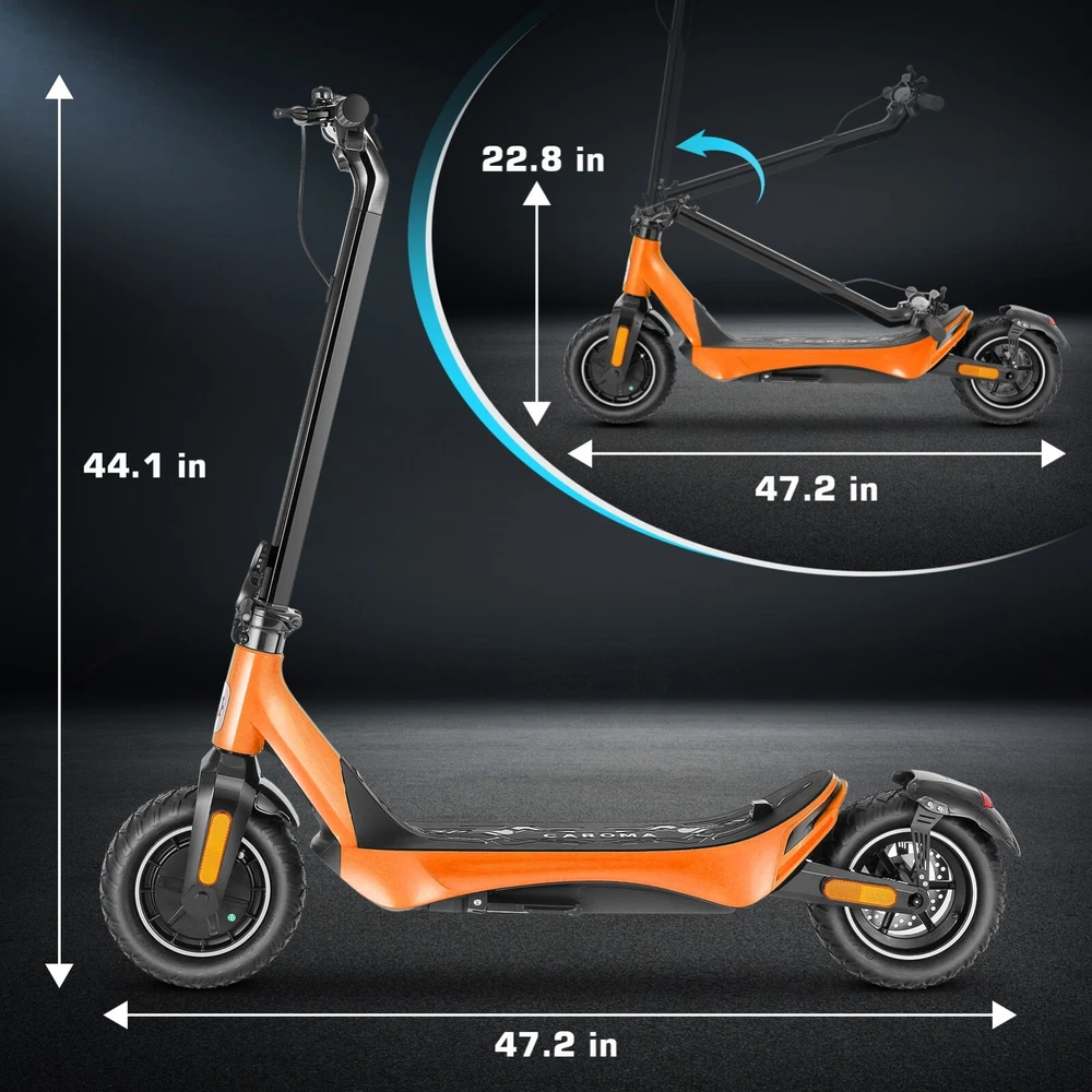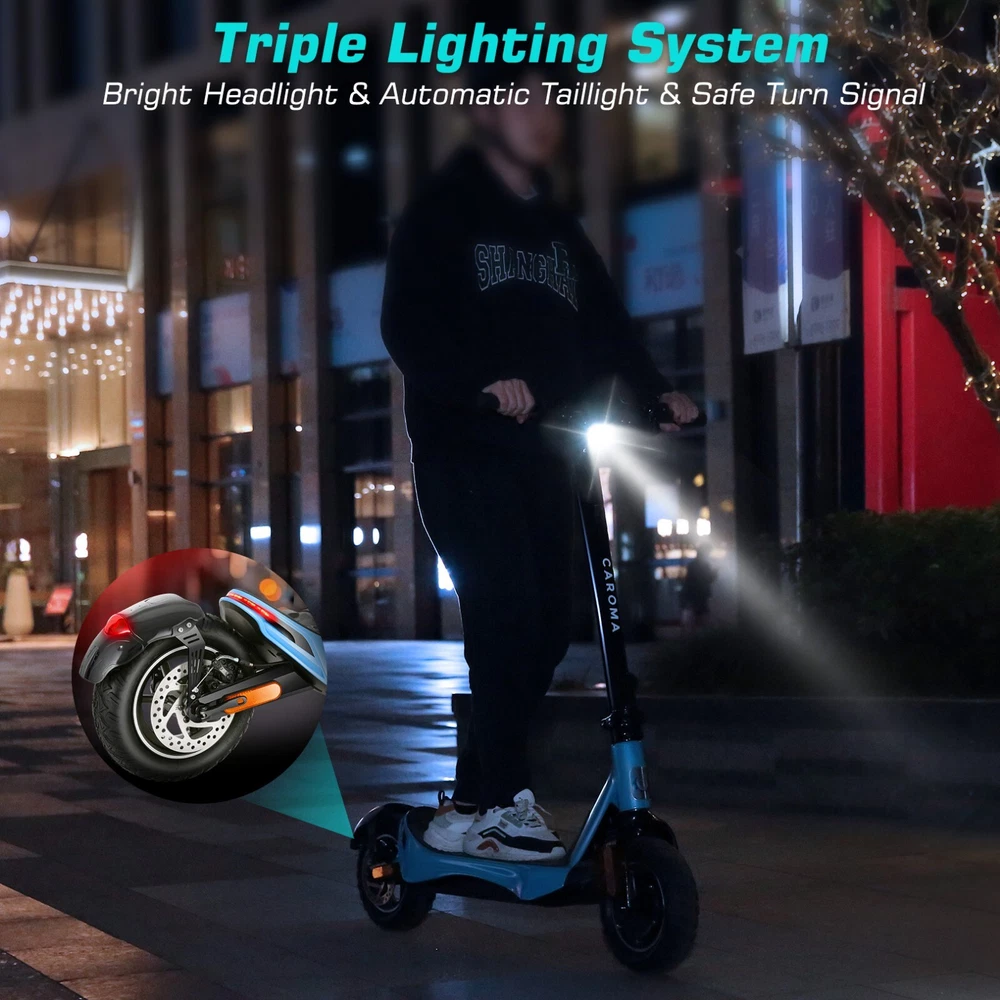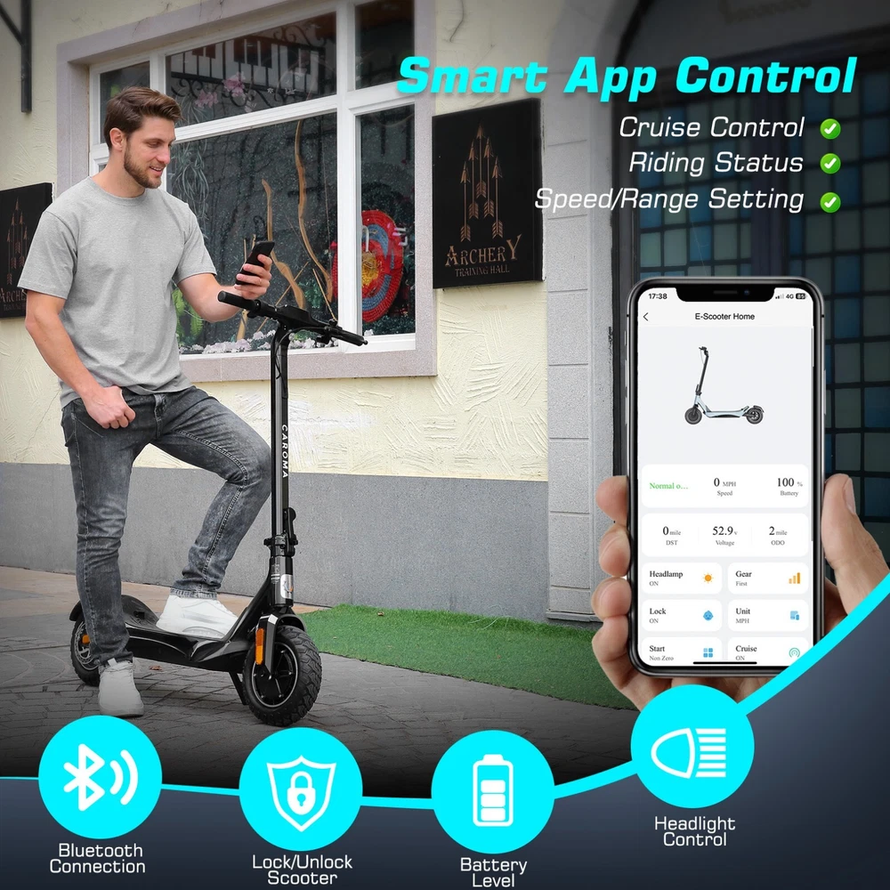 Product Description About this item Exceptional Power and Speed: The CAROMA electric scooter for adults boasts a rated 500W motor(800W peak power), allowing riders to reach speeds of up to 25mph. It's also capable of tackling 30% inclines, ensuring a smooth ride on various terrains Extended Range: With an upgraded large-capacity 48V 500Wh battery, this adult electric scooter offers an impressive maximum range of 30 miles. Whether you're commuting or exploring, this scooter keeps you on the move longer Smart APP Control : This fast electric scooter adults comes with a smart display screen and a smartphone app for easy monitoring and control. It also features intelligent Bluetooth control for a seamless, connected experience.You can also switch to zero-start mode via the app or by quickly pressing the headlight button three times Safety and Comfort: Equipped with bright front headlights, automatic tail lights, and safety turn signals, this e scooter for adults ensures safe rides even in low-light conditions. Its electronic handbrake and disc brake system provide reliable stopping power, while the 10-inch self-healing inflatable tires offer a comfortable ride Foldable and Portable: The folding electric scooter adults 300lbs is designed with convenience in mind. It's foldable for easy storage and transport, making it an ideal choice for commuters. Its maximum load capacity of 300lbs also ensures it caters to a wide range of users Safety: The product is UL 2272 certified