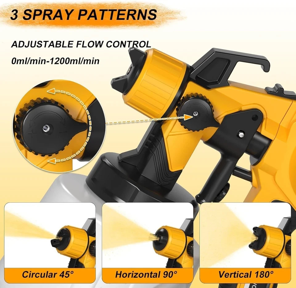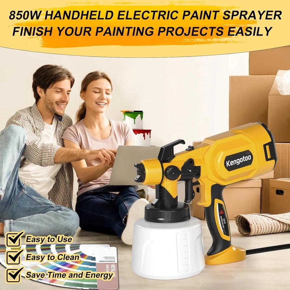 BETTER THAN A BRUSH - The Kengotoo HVLP Paint Sprayer is an easy to use electric paint sprayer that gives a smooth finish with no brush marks. It's the best paint sprayer option for painting furniture, cabinets, walls, fences and more 4 NOZZLES & 3 SPRAY PATTERNS - 850W paint sprayer equipped with 4 sizes of nozzles (1.0mm, 1.2mm, 1.8mm, 2.5mm) for most painting projects such as furniture, walls, doors, garden tables and chairs etc. Can be set to 3 different spray patterns: horizontal, vertical and circular, so it can be used for a wide range of applications CONVEBIENT DUST BLOWING FUNCTION - Before spraying the project, you can use the dust blower on the sprayer to blow away any dust or debris on the surface of the sprayed project. Clean the surface of the spray project and you will get better spray results EASY TO USE & CLEAN - The paint sprayer requires no tools and is easy to assemble, making it suitable for beginners. It comes with instructions for use. The inclusion of a cleaning brush and needle ensures efficient removal of hardened paint residue from the nozzle. Remember to clean the sprayer thoroughly after each use ADJUST FLOW CONTROL - The amount of paint output can be controlled by adjusting the flow control knob to suit a wide variety of projects. According to different spray effect requirements, proper control of paint flow can achieve better effect and avoid paint waste ADVANCED TECHNOLOGY & DESIGN - The 850W HVLP Paint Sprayer comes with a large 1400ml container that is more efficient. The maximum viscosity has been upgraded to 100 Din-s, and the spraying effect is also greatly improved, resulting in a smooth and superior finish WHAT YOU WILL GET - 1X Paint Sprayer, 4X Size Copper Nozzles, 5 X Paint Filters, 1X Viscosity Cup , 1X Cleaning Needle, 1X Cleaning Brush, 1X Gasket, 1X Filter, 1X User Manual. If you have any questions, please contact us via your order, you will get a reply in 12 hours, our after-sales team are always behind you