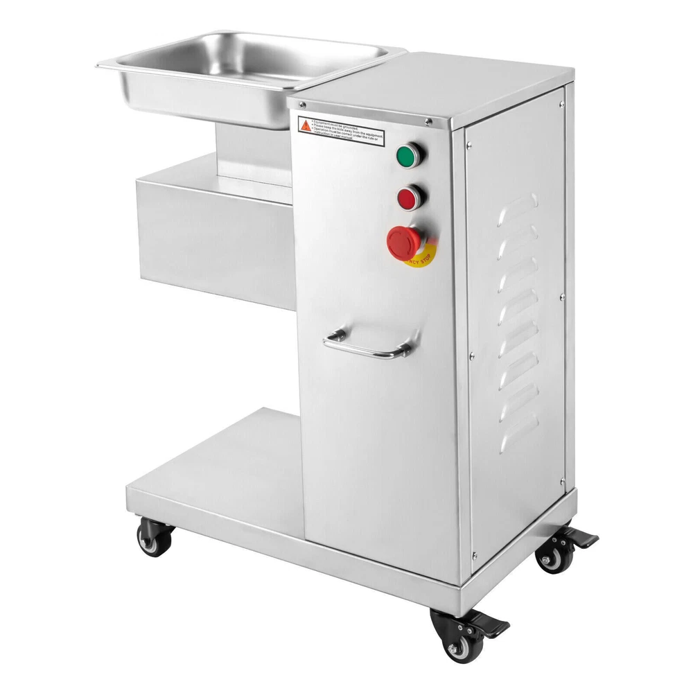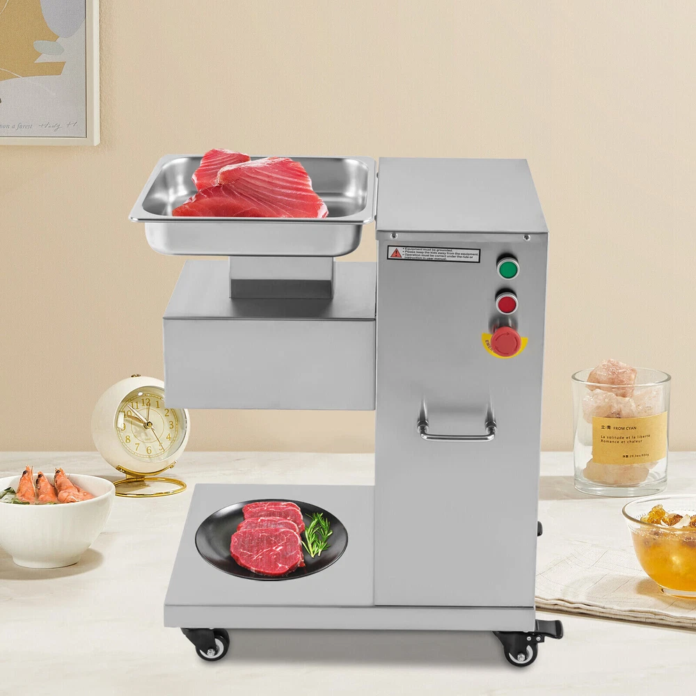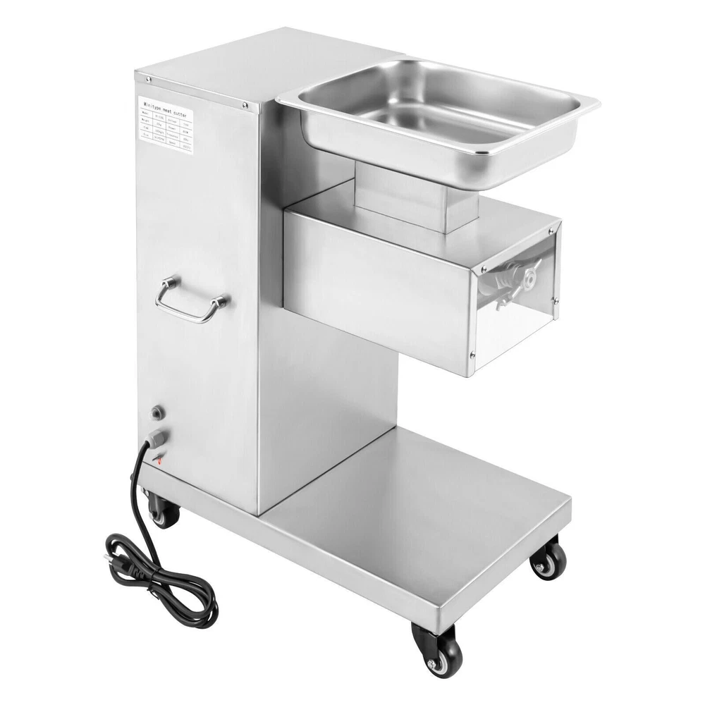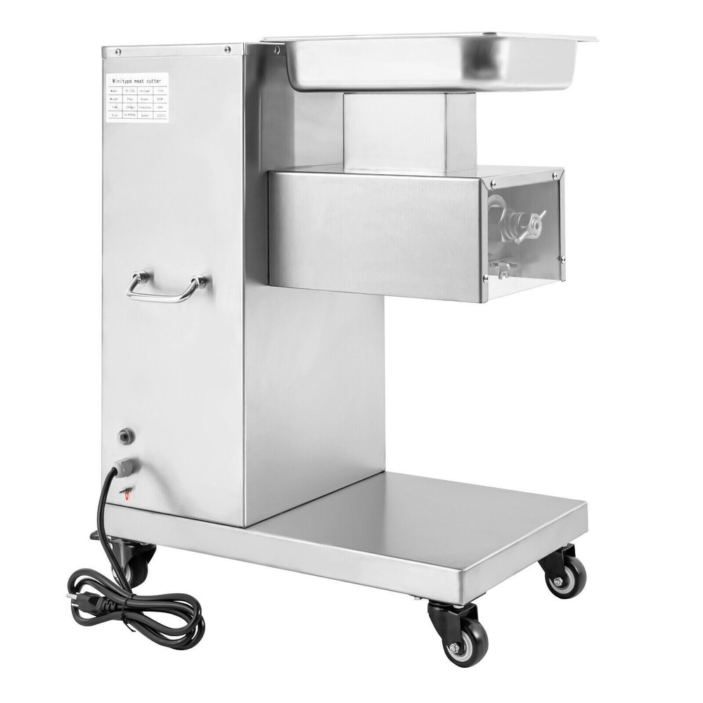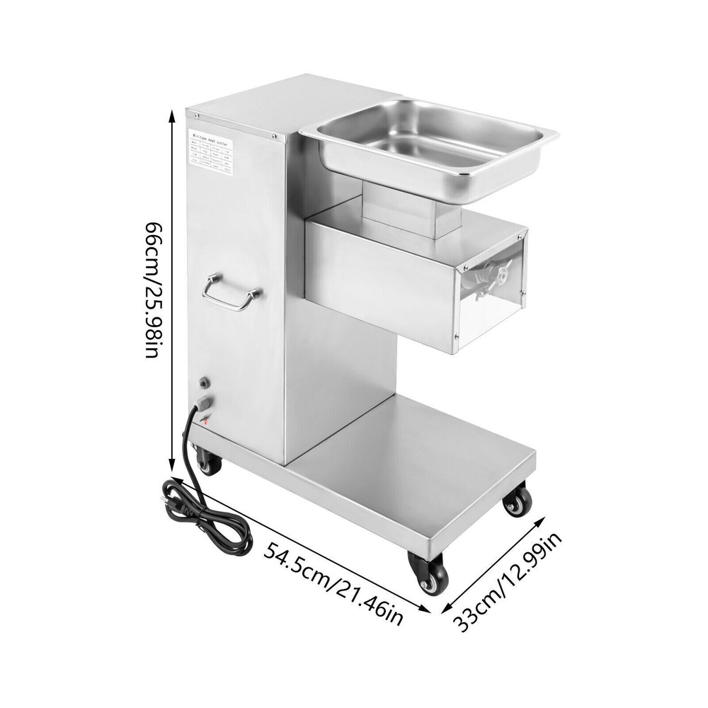 Specification Model: F-130L Material: 3Cr13(Stainless Steel), 201Stainless Steel Voltage: 110V Frequency: 60HZ Power: 850W Output: 500kg/h/1100lbs/h Mounting Type: Free-standing Bladet Specification: 3mm/0.2in Size of Feed Opening: 14.1*6.6cm/5.55*2.59in Blade Set Size: 20*18*10cm/7.87*7.08*3.93in Color: Silver Motor: Pure Copper Motor Process: Wire-drawing, Laser Cutting Gross Weight: 55kg/121.25lbs Net Weight: 37kg/81.57lbs Package Size: 62*40*83cm/24.4*15.7*32.6in Product Size: 54.5*33*66cm/21.46*12.99*25.98in Package Included 1*Commercial Meat Cutter 1*Tray 1*English User Manual All Accessories Needed for Installation 850W Commercial Meat Cutter Machine 500 kg/h Electric Meat Slicer with 3mm Blade 850W Meat Cutting Machine Electric Meat Cutter Slicer Dicer 3mm Blade 1100LB/H Description To create a better life, we need to start with every detail. This commercial meat cutter is designed to reduce the cooking burden, improve slicing efficiency, and free your hands to enjoy a creative kitchen life. Efficient commercial meat cutter is an ideal assistant for restaurants and hotels. Application The electric meat cutter is perfect for homes, meat processing businesses, restaurants, butcher shop, hotel kitchen, BBQ shop, dumpling house, and hot pot restaurant. The first time cut into meat slices, the second time cut into strips, and the third time cut into cubes. You can cut into the shape you want according to your needs. How to Install the Blade Set 1. Start the installation. 2. Align the card pins. 3. Install the blade set. 4. Install the spring. 5. Install the nut. 6. Complete the installation. Specification Model: F-130L Material: 3Cr13(Stainless Steel), 201Stainless Steel Voltage: 110V Frequency: 60HZ Power: 850W Output: 500kg/h/1100lbs/h Mounting Type: Free-standing Bladet Specification: 3mm/0.2in Size of Feed Opening: 14.1*6.6cm/5.55*2.59in Blade Set Size: 20*18*10cm/7.87*7.08*3.93in Color: Silver Motor: Pure Copper Motor Process: Wire-drawing, Laser Cutting Gross Weight: 55kg/121.25lbs Net Weight: 37kg/81.57lbs Package Size: 62*40*83cm/24.4*15.7*32.6in Product Size: 54.5*33*66cm/21.46*12.99*25.98in Package Included 1*Commercial Meat Cutter 1*Tray 1*English User Manual All Accessories Needed for Installation Key Features Precise and Even Cutting: You can say goodbye to laborious manual cutting as you can get even slices, strips or shreds of meat by simply pressing the knob on the panel. Uniform cutting helps to cook and maintain the taste and appearance of food in better condition. High-quality Material: This commercial meat cutter is made of high-quality 201 stainless steel. The stainless steel with high strength, impact resistance, and corrosion resistance makes the product have a long service life. Powerful Cutting Function: The product can easily make meat slices, shredded meat, and minced meat (cut into pieces once, cut into strips twice, and cut into minced meat three times) by using a thickened and enlarged stainless steel blade set. The strong cutting ability makes it an ideal assistant for restaurants, and meat markets. High Efficiency: The commercial meat cutter uses a 850W motor to provide powerful power, ensuring an excellent output of 500kg/1100lb per hour. Such an efficient meat cutter can meet the needs of restaurants, markets, and other commercial places. Stable and Low-noise: The pure copper motor has lower resistance and lower heat output, which is more durable and power-saving than the aluminum motor. Its low working noise can create a quiet working environment for you. Easy to Clean: Removable blade set and smooth stainless steel surface make this product easy to clean. You just need to wipe it gently with a damp cloth, which is very convenient. Space-saving : The meat cutter with a vertical design makes full use of vertical space. Only 21.46 * 12.99 inches of floor space will not take up too much space for you to easily place it in the kitchen. Flexible Movement&Fixation: The bottom of the product is equipped with four universal wheels that can rotate 360 ° (two of which are equipped with brakes) to allow you to move and fix it easily. Exquisite Process: Exquisite wire drawing process is adopted on the surface of the product to improve its corrosion resistance and wear resistance. The smooth surface presents a shiny metallic luster to decorate your kitchen. High Safety: The heightened feed inlet and emergency stop switch greatly improve the safety of use to prevent accidental injury. Protective Packaging: The product is carefully packed with foam and wooden boxes to avoid damage in transit, which allows the product to reach you intact. Customer Service: We aim to provide quality products and services. If you have any problems, please feel free to contact us. We will reply and solve the problem for you as soon as possible. Details Handles: The handles on both sides of the product body are convenient to move and operate. Enlarged Tray: The enlarged tray can hold more food, which makes cutting more efficient without adding meat frequently. One Switch to Start: One button to start the machine and it will automatically cut meat. Notes 1. Please read the operation manual carefully before use and follow the instructions to use the product correctly. Pay particular attention to safety instructions. 2. The product should not be immersed in water. 3. This product can be used for fresh meat, not for vegetables, fruits, cutting frozen meat or hard raw materials. 4. The blade is sharp. Please do not touch the blades with your hands during use and installation. 5. It is recommended to run for 30 minutes and rest for 5-10 minutes. Please do not use it continuously for 1-2 hours for a long time, which may cause damage to the motor. 6. The product must be reliably grounded. 7. Please keep the device away from children. 8. Please allow the slight color difference caused by the shooting light and 1-3cm error due to manual measurement. Please make sure you do not mind before you or