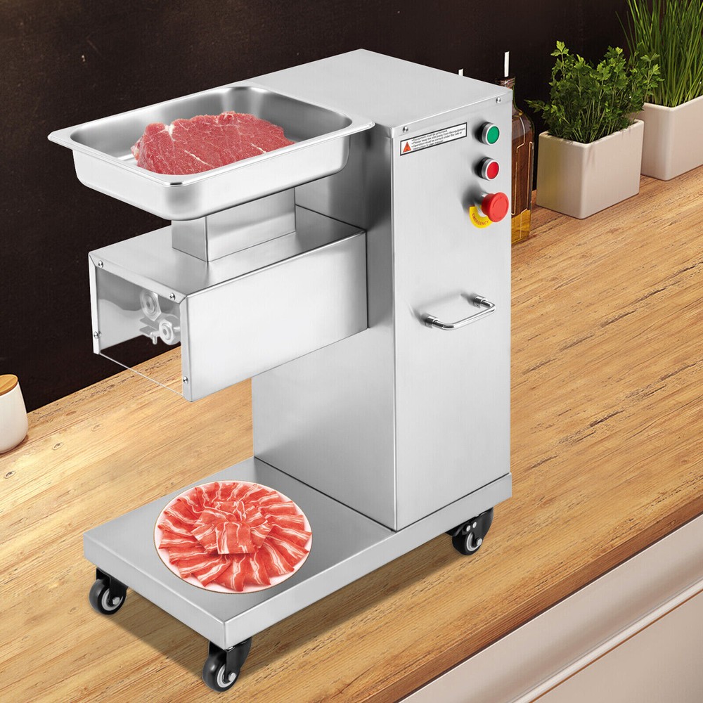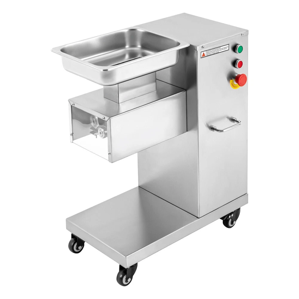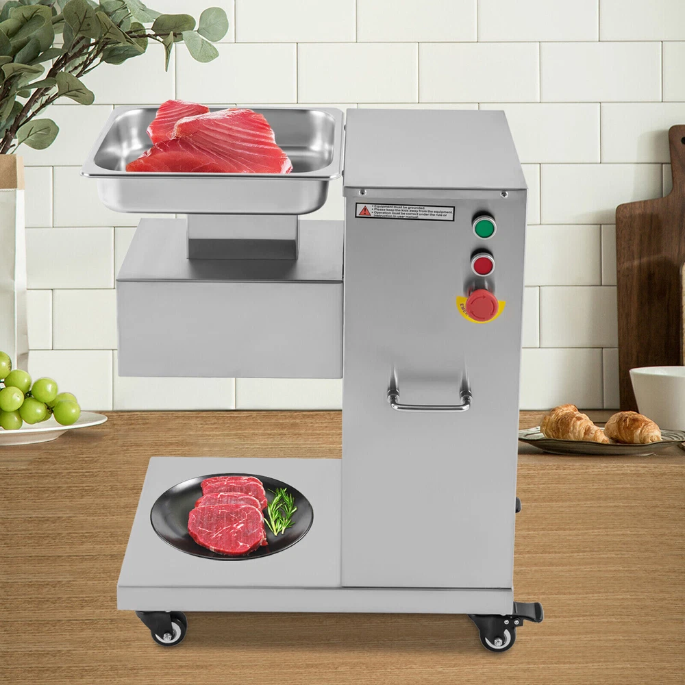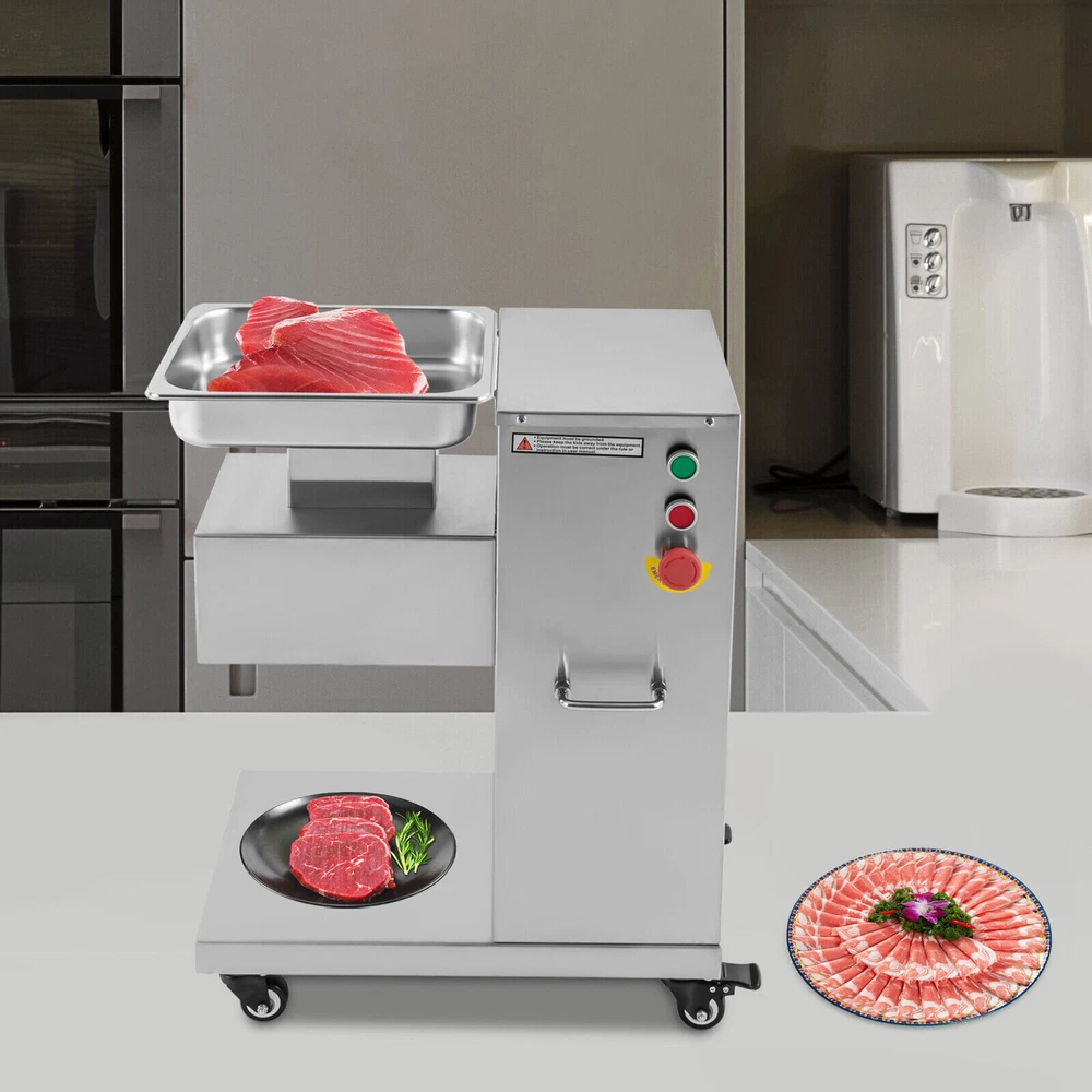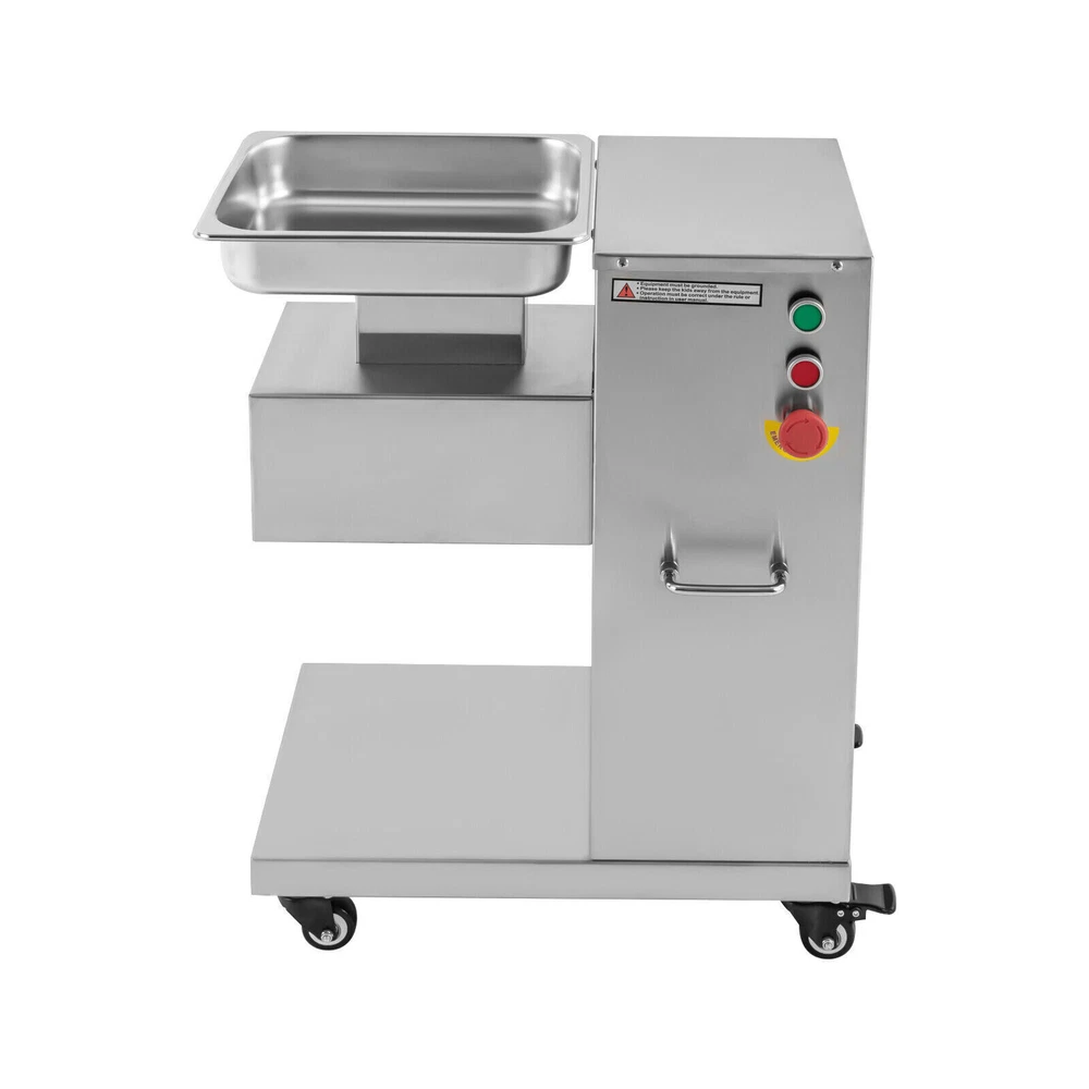 Specification Model: F-130L Material: 3Cr13(Stainless Steel), 201Stainless Steel Voltage: 110V Frequency: 60HZ Power: 850W Output: 500kg/h/1100lbs/h Mounting Type: Free-standing Bladet Specification: 3mm/0.2in Size of Feed Opening: 14.1*6.6cm/5.55*2.59in Blade Set Size: 20*18*10cm/7.87*7.08*3.93in Color: Silver Motor: Pure Copper Motor Process: Wire-drawing, Laser Cutting Gross Weight: 55kg/121.25lbs Net Weight: 37kg/81.57lbs Package Size: 62*40*83cm/24.4*15.7*32.6in Product Size: 54.5*33*66cm/21.46*12.99*25.98in Package Included 1*Commercial Meat Cutter 1*Tray 1*English User Manual All Accessories Needed for Installation 850W Commercial Meat Cutter Machine 500 kg/h Electric Meat Slicer with 3mm Blade 850W Meat Cutting Machine Electric Meat Cutter Slicer Dicer 3mm Blade 1100LB/H Description To create a better life, we need to start with every detail. This commercial meat cutter is designed to reduce the cooking burden, improve slicing efficiency, and free your hands to enjoy a creative kitchen life. Efficient commercial meat cutter is an ideal assistant for restaurants and hotels. Application The electric meat cutter is perfect for homes, meat processing businesses, restaurants, butcher shop, hotel kitchen, BBQ shop, dumpling house, and hot pot restaurant. The first time cut into meat slices, the second time cut into strips, and the third time cut into cubes. You can cut into the shape you want according to your needs. How to Install the Blade Set 1. Start the installation. 2. Align the card pins. 3. Install the blade set. 4. Install the spring. 5. Install the nut. 6. Complete the installation. Specification Model: F-130L Material: 3Cr13(Stainless Steel), 201Stainless Steel Voltage: 110V Frequency: 60HZ Power: 850W Output: 500kg/h/1100lbs/h Mounting Type: Free-standing Bladet Specification: 3mm/0.2in Size of Feed Opening: 14.1*6.6cm/5.55*2.59in Blade Set Size: 20*18*10cm/7.87*7.08*3.93in Color: Silver Motor: Pure Copper Motor Process: Wire-drawing, Laser Cutting Gross Weight: 55kg/121.25lbs Net Weight: 37kg/81.57lbs Package Size: 62*40*83cm/24.4*15.7*32.6in Product Size: 54.5*33*66cm/21.46*12.99*25.98in Package Included 1*Commercial Meat Cutter 1*Tray 1*English User Manual All Accessories Needed for Installation Key Features Precise and Even Cutting: You can say goodbye to laborious manual cutting as you can get even slices, strips or shreds of meat by simply pressing the knob on the panel. Uniform cutting helps to cook and maintain the taste and appearance of food in better condition. High-quality Material: This commercial meat cutter is made of high-quality 201 stainless steel. The stainless steel with high strength, impact resistance, and corrosion resistance makes the product have a long service life. Powerful Cutting Function: The product can easily make meat slices, shredded meat, and minced meat (cut into pieces once, cut into strips twice, and cut into minced meat three times) by using a thickened and enlarged stainless steel blade set. The strong cutting ability makes it an ideal assistant for restaurants, and meat markets. High Efficiency: The commercial meat cutter uses a 850W motor to provide powerful power, ensuring an excellent output of 500kg/1100lb per hour. Such an efficient meat cutter can meet the needs of restaurants, markets, and other commercial places. Stable and Low-noise: The pure copper motor has lower resistance and lower heat output, which is more durable and power-saving than the aluminum motor. Its low working noise can create a quiet working environment for you. Easy to Clean: Removable blade set and smooth stainless steel surface make this product easy to clean. You just need to wipe it gently with a damp cloth, which is very convenient. Space-saving : The meat cutter with a vertical design makes full use of vertical space. Only 21.46 * 12.99 inches of floor space will not take up too much space for you to easily place it in the kitchen. Flexible Movement&Fixation: The bottom of the product is equipped with four universal wheels that can rotate 360 ° (two of which are equipped with brakes) to allow you to move and fix it easily. Exquisite Process: Exquisite wire drawing process is adopted on the surface of the product to improve its corrosion resistance and wear resistance. The smooth surface presents a shiny metallic luster to decorate your kitchen. High Safety: The heightened feed inlet and emergency stop switch greatly improve the safety of use to prevent accidental injury. Protective Packaging: The product is carefully packed with foam and wooden boxes to avoid damage in transit, which allows the product to reach you intact. Customer Service: We aim to provide quality products and services. If you have any problems, please feel free to contact us. We will reply and solve the problem for you as soon as possible. Details Handles: The handles on both sides of the product body are convenient to move and operate. Enlarged Tray: The enlarged tray can hold more food, which makes cutting more efficient without adding meat frequently. One Switch to Start: One button to start the machine and it will automatically cut meat. Notes 1. Please read the operation manual carefully before use and follow the instructions to use the product correctly. Pay particular attention to safety instructions. 2. The product should not be immersed in water. 3. This product can be used for fresh meat, not for vegetables, fruits, cutting frozen meat or hard raw materials. 4. The blade is sharp. Please do not touch the blades with your hands during use and installation. 5. It is recommended to run for 30 minutes and rest for 5-10 minutes. Please do not use it continuously for 1-2 hours for a long time, which may cause damage to the motor. 6. The product must be reliably grounded. 7. Please keep the device away from children. 8. Please allow the slight color difference caused by the shooting light and 1-3cm error due to manual measurement. Please make sure you do not mind before you or