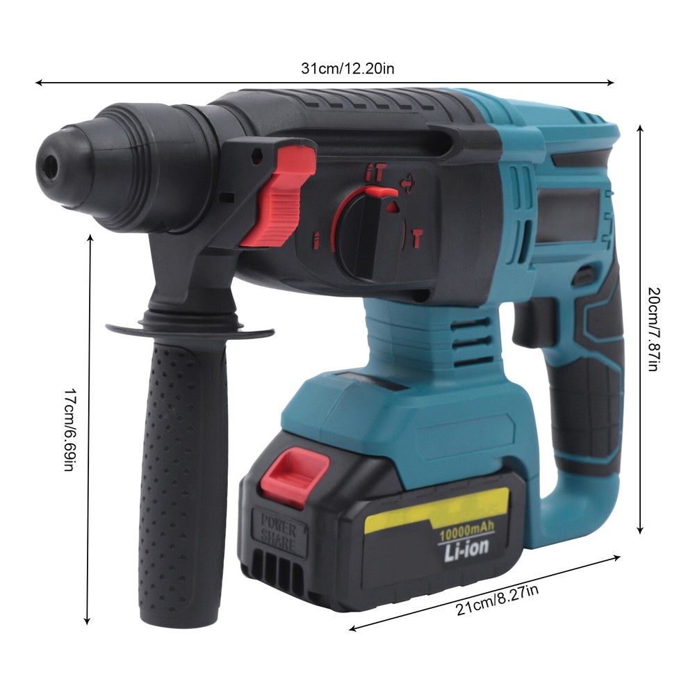 Specification Color: Blue Operation Method: Handheld Material: Nylon, Steel, Iron, Copper, Rubber, Aluminum Battery: 21V Motor Voltage: 21V Power: 850W Impact Frequency: 0-520rpm/min Unloaded Speed: 0-1100rpm/min Battery Capacity: 4.0AH Charging Time: 1.5h Gross Weight: 5.6kg/12.35lbs Power Source: Rechargeable Lithium Battery Portable Box Size: 42*34*13cm/16.54*13.39*5.12inch Body Size: 31*20cm/12.20*7.87inch Vice Handle Length: 17cm/6.69inch Power Supply Width: 8cm/3.15inch Bottom Length: 21cm/8.27inch Maximum Drill Diameter: 26mm/1.02inch Package Size: 42*34*10cm/16.54*13.39*3.94inch Package Included 1* Rotary Hammer 2* Batteries 1* Charger 1* Depth Gauge 850W Electric Rotary Demolition Jack Hammer Impact Concrete Drilling Breaker Heavy Duty Rotary Hammer Drill, Safety Clutch 3 Functions with Vibration Control with Case Description Please choose a smooth tool for the work of your home improvement. No matter whether you are a professional worker or a DIY user, this electric rotary hammer of ours will be your ideal choice. It uses a pure copper brushless motor with high operating efficiency, and low noise and has a long service life. The steel chuck is durable and allows you to feel the strength of each hammer blow, making it easy to break the wall. Specification Color: Blue Operation Method: Handheld Material: Nylon, Steel, Iron, Copper, Rubber, Aluminum Battery: 21V Motor Voltage: 21V Power: 850W Impact Frequency: 0-520rpm/min Unloaded Speed: 0-1100rpm/min Battery Capacity: 4.0AH Charging Time: 1.5h Gross Weight: 5.6kg/12.35lbs Power Source: Rechargeable Lithium Battery Portable Box Size: 42*34*13cm/16.54*13.39*5.12inch Body Size: 31*20cm/12.20*7.87inch Vice Handle Length: 17cm/6.69inch Power Supply Width: 8cm/3.15inch Bottom Length: 21cm/8.27inch Maximum Drill Diameter: 26mm/1.02inch Package Size: 42*34*10cm/16.54*13.39*3.94inch Package Included 1* Rotary Hammer 2* Batteries 1* Charger 1* Depth Gauge Key Features Strong Power: The maximum power is 850W, and the speed is 520r/min, which can efficiently and easily carry out various crushing and drilling operations. Dust-proof System: The outer protection structure of the motor is complete, which can effectively prevent dust from entering the motor and ensure the smooth operation of the rotary hammer. Multi-function: You can switch between three functional modes of a hammer only (chiselling-only), hammer drill (hammering and rotation), and drill only (rotation only) by rotating the switch button to adapt to various working situations. High Efficiency Motor: This machine adopts a brushless motor with high power, without burning the machine, and has a long service life. And you don't need to replace the carbon brushes, which saves you time. Convenient Operation: The rotary hammer is powered by lithium batteries without wire restrictions, and with 2 replaceable lithium batteries, making the operation more convenient and fast. Flexible Speed Change: The rotary hammer's speed can be changed flexibly through the infinitely variable speed switch. The rotation speed changes with the pressing force, which is very convenient to use. Replaceable Drill Bits: The drill bit of the electric drill is removable and replaceable. This product can be adapted to drill bits within the 26mm/1.02inch diameter to meet your different needs. Easy to Store and Carry: The rotary hammer is equipped with a storage box, you can neatly store the machine in it after use. Moreover, it comes with a portable handle, which is easy to carry. Rotatable Sub-handle: The sub-handle is 360-degree rotatable, you can find a comfortable angle according to different working scenes and easily deal with various dead ends. It also has a shock-absorbing effect, making it more comfortable for you to use. Excellent After-sales Service: We aim to provide quality products and services. If you have any problems, please feel free to contact us, we will reply and solve the problem for you as soon as possible. Details Pure Copper Motor : It has a built-in high-precision copper core motor that has good conductivity, strong power, and high-temperature resistance for longer life. Durable Switch: The switch has been tested for durability and can be opened and closed repeatedly, with long service life. Nylon Casing: The rotary hammer adopts a high-strength nylon casing, which will not crack when dropped at normal height, so you can use it at ease. Anti-slip Handle : It is designed with two handles for more stable control of the electric drill. The anti-slip pattern on the handle allows for a more secure grip and safer operation. Large-capacity Lithium Battery: The rotary hammer adopts a lithium battery with a battery capacity of 4.0AH, which provides long-lasting battery life and guarantees your work. Forward and Reverse Adjustment Button: After the drill is blocked, you can push the reverse button to adjust the rotation direction of the rotary hammer, which can easily solve the problem of jamming. Steel Clamping Head : The clamping head is made of steel with high strength, which can hold the drill tightly and prevent it from falling off. Application This rotary hammer is suitable for professional or daily home users. And it is suitable for wood, masonry, concrete, brick, and metal. Notes Please note that this product does not include a drill bit, you can configure a drill bit with a diameter up to 26mm/1.02inch according to your needs. Please allow the slight color difference caused by the shooting light and 1-3 cm error due to manual measurement, and make sure you do not mind before ordering. Payment Delivery details Terms of sales About us Contact us Payment We accept ebay payment 。 Fees such as import duties, taxes are not included in the item price or shipping costs. These charges are the buyer's responsibility. Delivery details Shipping: 2-9 working days to: USA Terms of sales We maintain high standards of excellence and strive for hundred percent customer satisfaction. Feedback is very impor