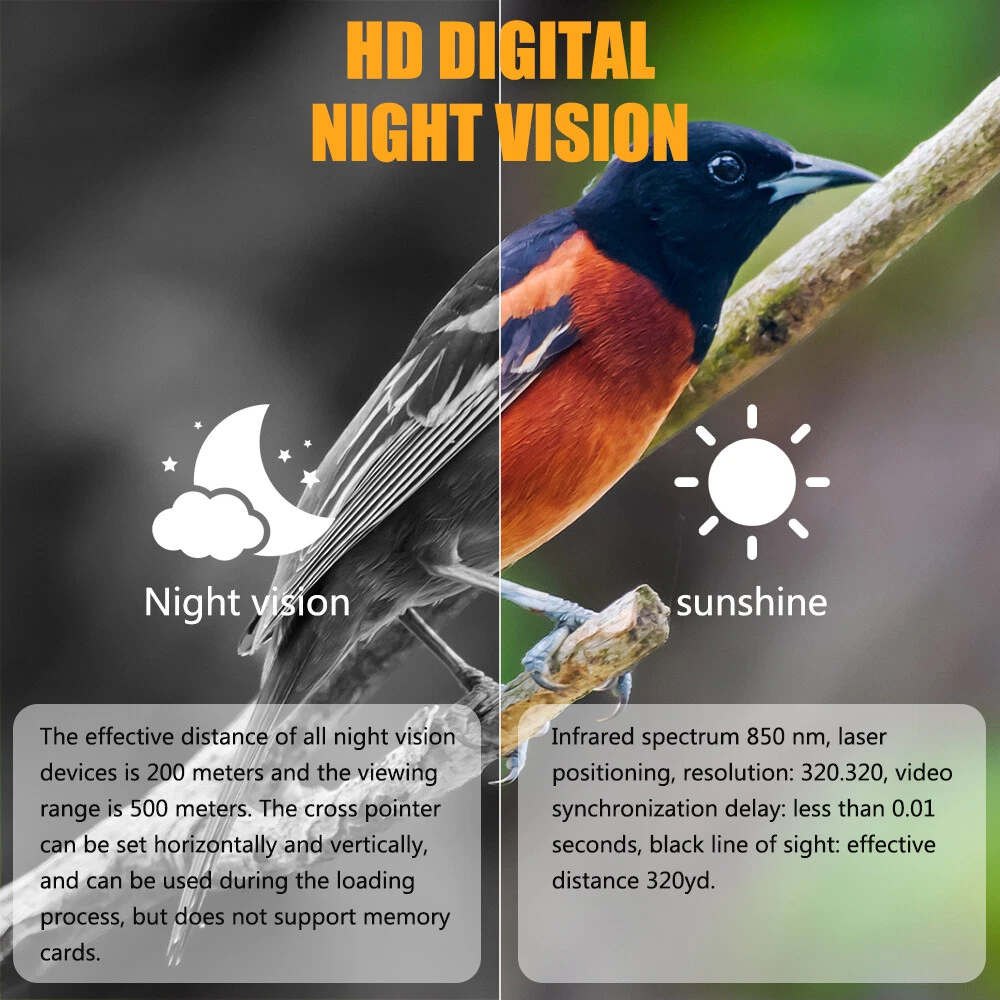 You may also like Night Vision Goggles Infrared Digital Binoculars For Total Darkness Surveillance 65.99 USD Free shipping 10x25 Folding High Powered Binoculars with Weak Light Night Vision Clear Birds 19.99 USD Free shipping Day/Night Military Telescope 10-300X40mm Zoom HD Monocular Telescope 18.99 USD Free shipping 850nm Infrared Scope Hunting Cross Cursor Digital Camera Night Vision Monocular 8.88 USD Free shipping NV4000 Digital Night Vision Binoculars NVG Goggles 4K 5X zoom Digital Infrared 65.99 USD Free shipping 4K 8W 850nm IR Infrared Binoculars 10X Zoom Night Vision WIFI Goggles Binoculars 52.99 USD Free shipping 4K 10X Digital Night Vision Goggles Binoculars For Total Darkness Surveillance 48.99 USD Free shipping 8X Digital Infrared Night Vision Goggles Binoculars Video Recording for Hunting 7.99 USD Free shipping Megaorei Digital Night Vision Rifle Scope Optic Hunting Sight 850nm IR Camera 139.99 USD Free shipping Monocular Night Vision 4K HD Day and Night Photo Video Infrared Camera NV1000 49.99 USD Free shipping Infrared Digital Scope Night Vision Monocular 7X Cross Cursor Night Vision Sight 75.99 USD Free shipping Megaorei Infrared Night Vision Rifle Scope Hunting Sight Laser IR HD Cam 850nm 85.89 USD Free shipping Monocular Night Vision Device 1080PHD Infrared 5x Digital Zoom Outdoor Day Night 32.59 USD Free shipping Day & Night Vision Scope 1080P HD Photos & Videos Night Vision Monocular 300M 125.99 USD Free shipping NV8300 Infrared Night Vision Binoculars 4K 3D Head Mounted Goggles 8X Zoom 300M 185.99 USD Free shipping 4K/5K Digital Night Vision Goggles Binoculars 5/10x ZoomFor Total Darkness Hunt 42.99 USD Free shipping Product Description Cross Cursor Night Vision Infrared Search Telescope Aiming Night Vision PRODUCT FUNCTIONS Night vision switch Switch button Infrared IR 850nm Emission Lamp Cross Cursor Charging interface Setting Light sensitive Capture Focusing wheel 7x optical lens For 19-21mm track Laser positioning PRODUCT PARAMETERS OL Display:1.54 inch Battery Specification:852535*2,1700mAh Resolution:320*320 Battery operating time:1.5-4 hours continuously Magnification:7 magnification Support during charging and use Video sync delay:less than 0.01 seconds Black viewing distance:Effective distance 320yd Infrared:850nm Memory card:not supported Adjustment method:Objective lens adjustment. Warning: The effective distance of all black night vision is 200 metres, and the viewing distance is 500 metres. The cross pointer can be adjusted horizontally and vertically and can be used when charging, but the memory card is not supported. The battery life is 4-5 hours without infrared, about 1.5 hours with infrared. This item has no memory function and cannot install a memory card. The cross pointer can be adjusted horizontally and vertically, but restarts after closing. Package contain 1 x Night Vision Device 1 x Red laser scope 2 x Allen key 3 x button cells Payment Shipping Returns Contact Us Feedback Here is a detailed description of the Payment policy. For Buy It Now item, an immediate payment is required (best offer items excluded). For Auction items, please paid within 5 days. We ship worldwide. Item will be shipped out 1 business day by Singpost after full payment received. Delivery Time: USA ------------------------------- 8-15 working days by China Epacket delivery. Australia ------------------------ 7-12 working days by AUpost-eparcel from China. UK/ Canada -------------------- 10-28 working days Europe -------------------------- 18-28 working days Italy/ South America ------ 28-40 working days We must exchange the item(s) within 7 days after you received it. Returns must have all original packaging and accessories. Opened or damaged merchandise are not eligible for returns/exchanges. Please allow up to 10 business days for returns to be processed. Shipping and handling charges are not refundable. 1 year manufactured warranty on all products, Warranty period starts from the date of purchase. Buyers need to responsible to pay for the returning package, pls make sure before you bid. For all orders, please note that: 1. Taxes and charges are not included in the item price or shipping charges. 2. Please check with your country's customs office to determine what these additional costs will be prior to bidding/buying. 3. If there is the cutsom fee casused by the cutsom detention, the buyer need to check with your country's customs and deal with it himself. If the item is defective or taking longer than usual to you, please do not leave us negative feedback. Send us a message through eBay and we will resolve the issue promptly. Thanks for your support and understanding! :) OUR WORKING Time(Beijing): 9:00am~6:00pm(Monday~Friday) If you have any questions, please contact us via ebay mail, we will reply you on the working day in China, and there will be no reply on the weekend, we will reply on Monday. Because the time zone between the seller and the buyer is different, please be patient and wait for your understanding. We will be happy to serve you. Dear Buyer, We appreciate your business, if you are satisfied with our service, please leave us a positive feedback and rate the details of the transaction (Detailed Seller Ratings) with a PERFECT 5 STARS . Our goal is to make sure you are happy and have a pleasant shopping experience with us. Please email us before leaving any 1 or 2 ratings, neutral and negative feedback or open any ebay or paypal dispute. We will do our best to resolve the issues. Please give us the opportunity to resolve any problem. It is impossible to address issues if we do not know about them ! Payment Here is a detailed description of the Payment policy. For Buy It Now item, an immediate payment is required (best offer items excluded). For Auction items, please paid within 5 days. Shipping We ship worldwide. Item will be shipped out 1 business day by Singpost after full payment received. Delivery Time: USA ------------------------------- 8-15 working 