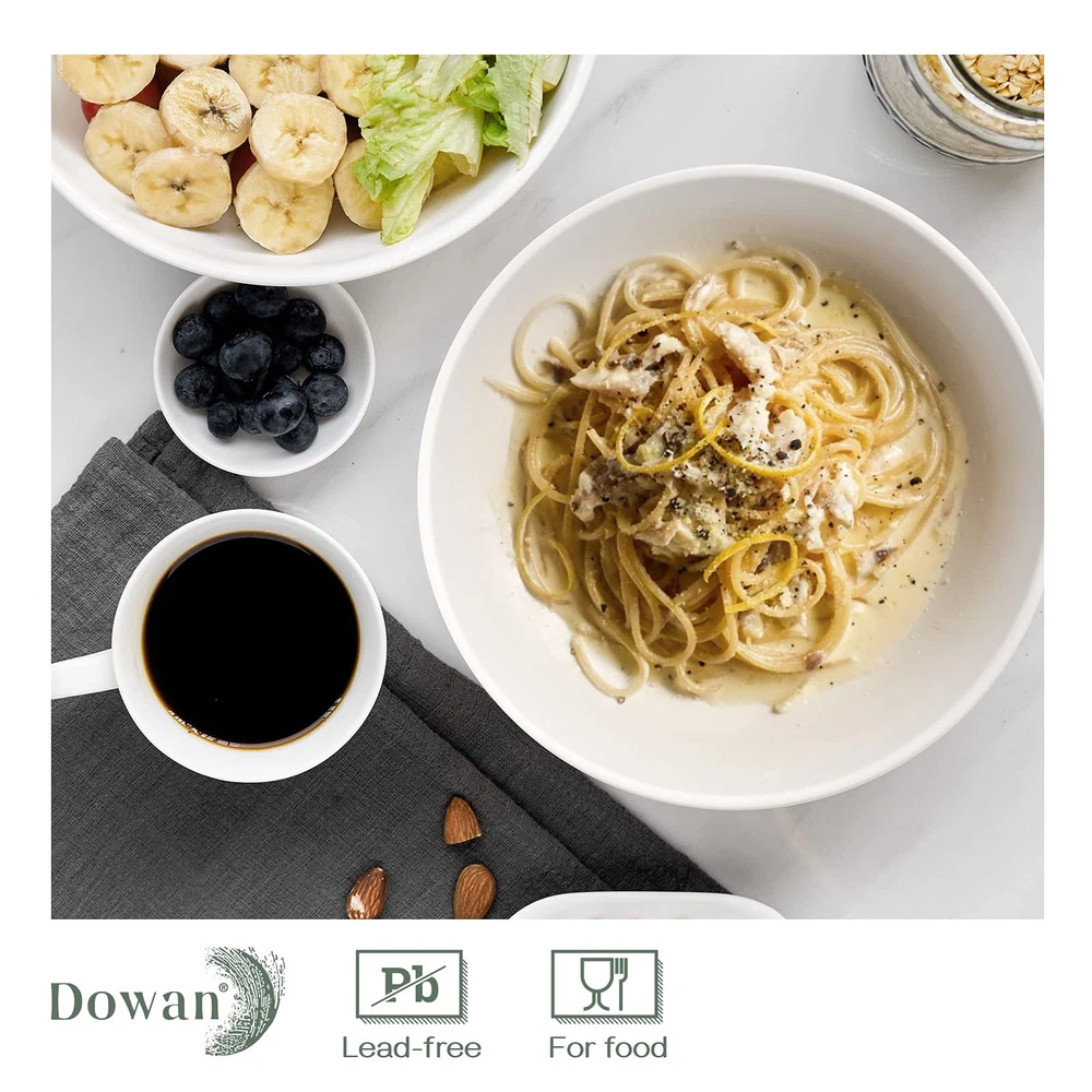 Great Deep and Wide Design -- 2.5 inches in height is deep enough to prevent the sauce from leaking. 8.5 inches in width is wide enough to show your dishes and cooking skills. The wide mouth allows large serving bowls to store more food. Versatile Bowls Set -- With a capacity of 47 oz, the serving bowl is deep enough to serve salads, pasta, vegetables, fruits, soups, meal prep, rice, or even morning cereal. This bowl set is versatile and perfect for all occasions, whether it's for dinner at home, in a canteen, or at a restaurant. Reliable Porcelain--Made of new bone china, which is pro-grade porcelain that is lead-free and cadmium-free. The lightweight design of the bowl makes it easy to handle and use, and safe for the freezer, dishwasher, microwave, and oven. Thickened & Stackable -- More durable and sturdy compared to regular serving bowls, and can use for years. The bowl's edge is designed for easy grip, making it comfortable to hold. The stackable design ensures cupboard space efficiency and secure storage without tilting. Sweet Gift Choice -- With the classic white color and deep serving bowl design, these large pasta bowls are not only practical but also eye-catching dinnerware on your table. Giving an ideal gift for birthdays, anniversaries, and housewarmings, bringing happiness to your family and friends.