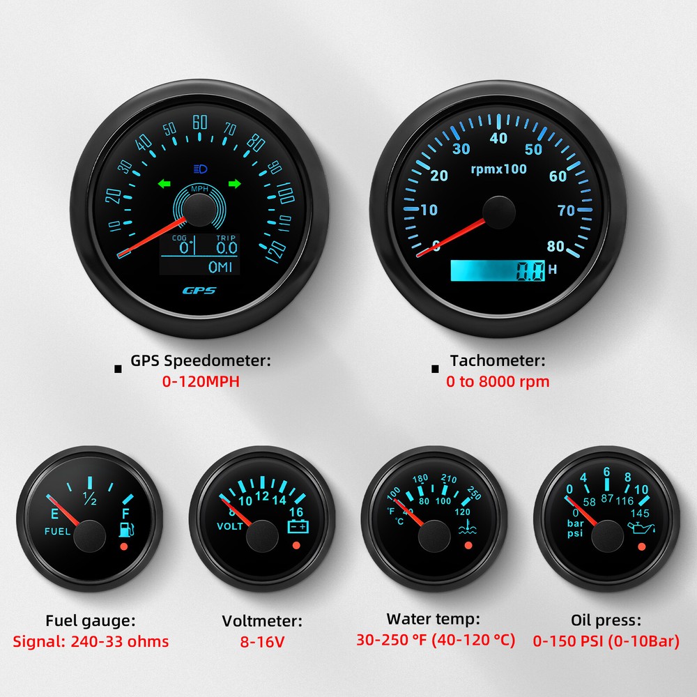 85MM GPS Speedometer 0-120MPH Tachometer &52mm Fuel/Oil/Temp/Volt with Senders 6 Gauge SET 85MM Black GPS Speedometer 120MPH&Tacho & 52mm Fuel/Oil/Temp/Volt with Sensor Features: Suitable for all cars,tractors,vans,vessels,boats,yachts,etc. The signal comes directly from the satellite signal receiver (GPS Speed Sensor) The gauge has the advantages of high precision, quick location confirmation and short start up time. IP67 waterproof and dustproof grade. Stepper motors used for full range of stepping gauges, great feature with its less power consumption, longer life, higher precision, etc. With curved glass (with anti-fogging function). With ultra-wide working voltage design( long-term operating voltage: 9-32V,Maximum up to: 36V (≤ 1 min)). Technical Data: Fixing dimension:85mm(3-3/8 inches) Indicating Range:0-120MPH Item:Black Working Voltage:9-32VDC(12VDC/24VDC) 7 Backlight color:red,green,blue,white,yellow,cyan,purple Tachometer Engine hours: 0.0-99999.9H Backlight :7 Color backlight Indicating Range: 0~8000 RPM Signal:Pulse For Tachometer, you can substitute for different unit, please contact us before / after purchase or note on the order. Tachometer: 0-3000rpm/0-4000RPM/6000RPM/7000RPM Volt Gauge Sizes:52 mm (2-1/16") Measuring Range:8-16 (V) Backlight: 7 Colors Fuel Level Gauge Sizes:52 mm (2-1/16") Measuring Range:Empty-Full Resistance: 240 (E)-33 (F) ohms Backlight:7 Colors Water Temperature Gauge Install diameter: Φ52mm Indication range: 0~120℃/100-250℉ Input signal: 287.4~22.4 ohm Storage temperature: -40~+85 Backlight: 7 Colors Oil Pressure Gauge Install diameter:Φ52mm or 2-1/16" Indication range:0~10bar/0-145 PSI Operating temperature:-30~+75 Storage temperature:-40~+85 Backlight: 7 Colors Package Includes: 1X 85MM Digital GPS Speedometer Gauge 1X GPS Antenna 1X Tachometer 1X Voltmeter 1X Fuel level gauge 1X Water temp gauge 1X Oil pressure gauge 1x Fuel level Sending Units (240-33ohms) 1X Oil pressure Sensor (1/8NPT) 1X water temp Sensor (1/8NPT) 1X Tachometer Sensor(M16*1.5) Installation Instruction NOTES: The Sending units will be included